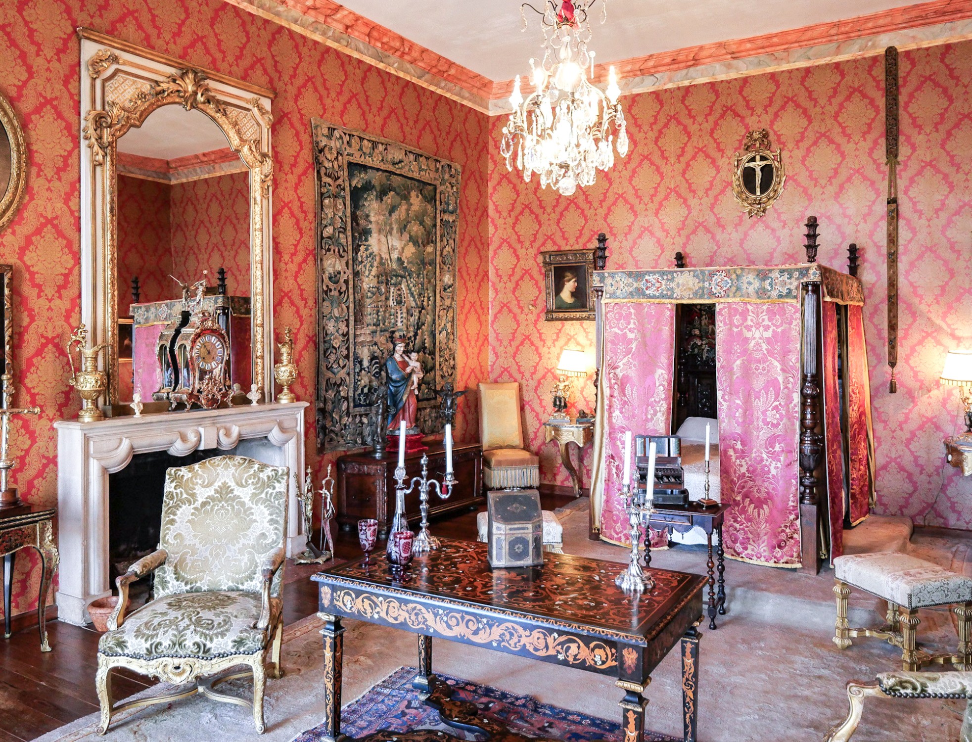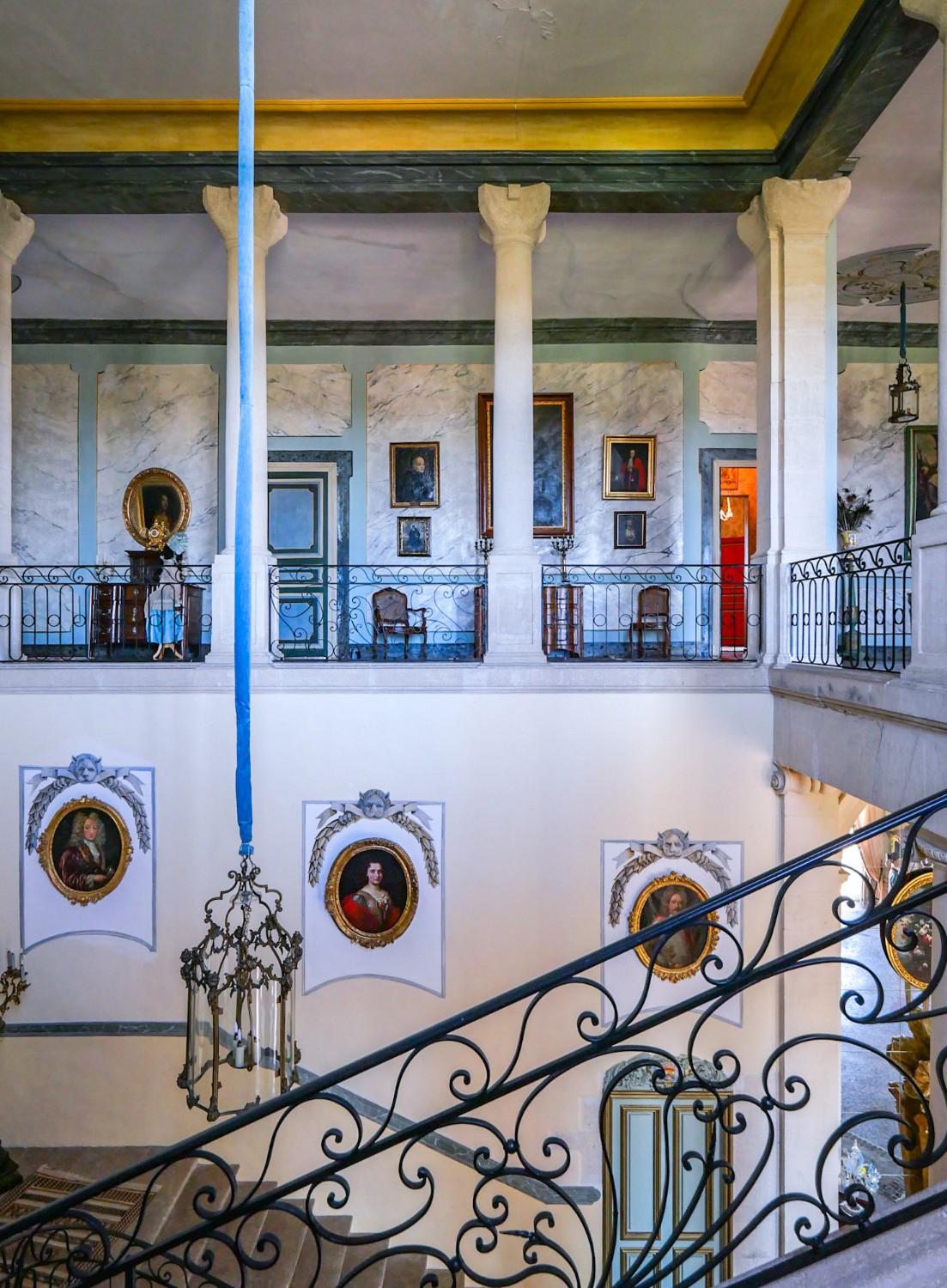 Au premier étage, une galerie exceptionnelle de 45 mètres longe le majestueux hall de colonnes ouvert sur l’escalier. On y trouve huit très belles chambres, certaines avec antichambres et cabinets, ornées de cheminées, un billard-bibliothèque décoré de magnifiques papiers peints du XIXe siècle et une chapelle. Un grand grenier complète l’ensemble.