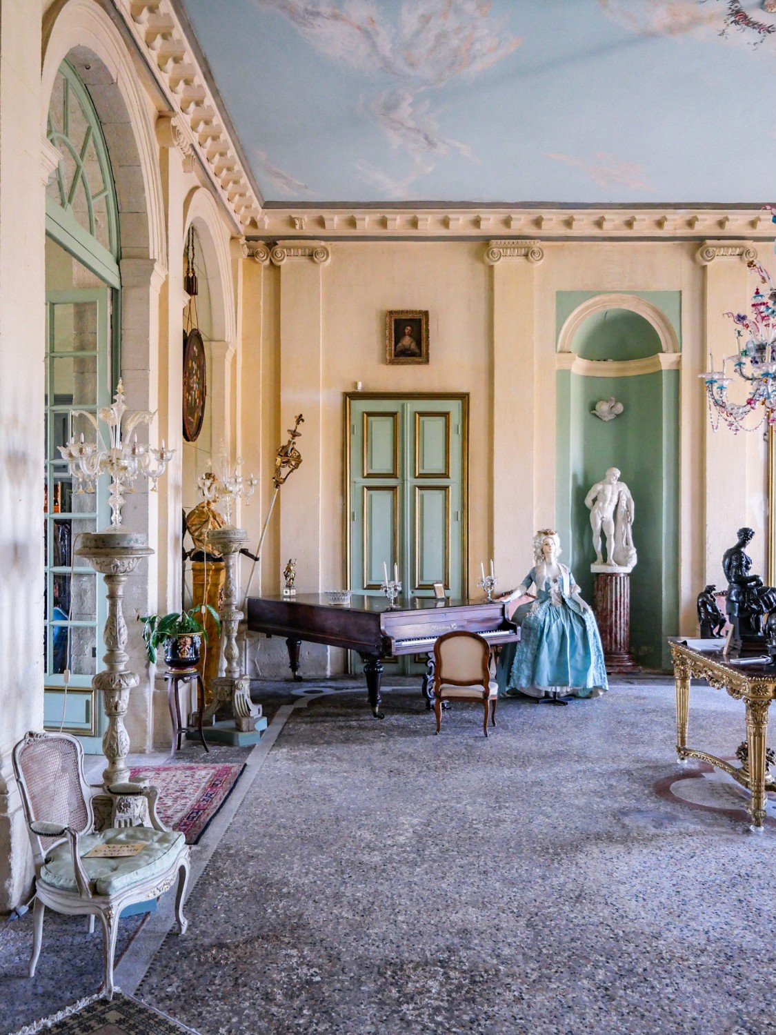 À l’intérieur, sous 5,3 mètres de plafond et baigné de lumière, le hall traversant s’ouvre sur le grand salon de 80 m². Il est orné de pilastres sommés de chapiteaux ioniques, auxquels répondent des colonnes monumentales en ronde-bosse menant au majestueux escalier, totalement ouvert par sa grande volée de marches jusqu’à l’étage, où les colonnes forment des balcons plongeant sur le hall de manière théâtrale. C’est assurément un des plus beaux escaliers privés du XVIIIe siècle en France.