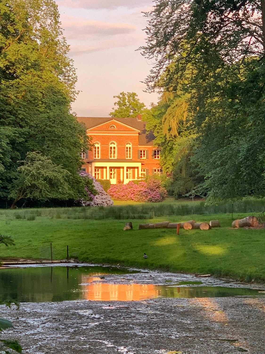 Le parc privé s’étend sur environ 4 hectares, avec de vastes pelouses, des sentiers moussus, des coins de repos et deux points d’eau naturels : un ancien fossé de château médiéval devenu étang naturel et un bassin de baignade intégré dans le paysage.