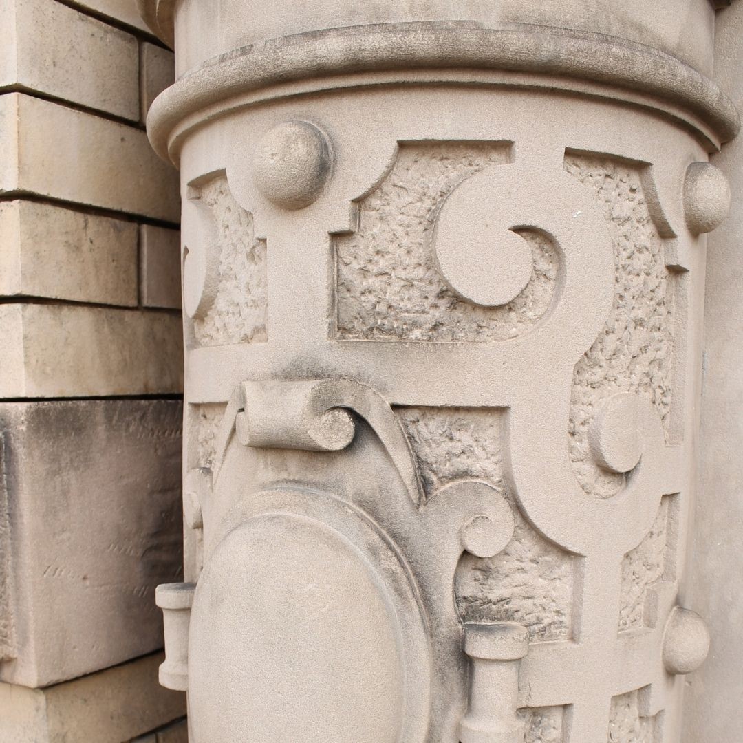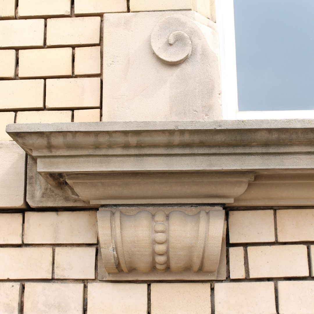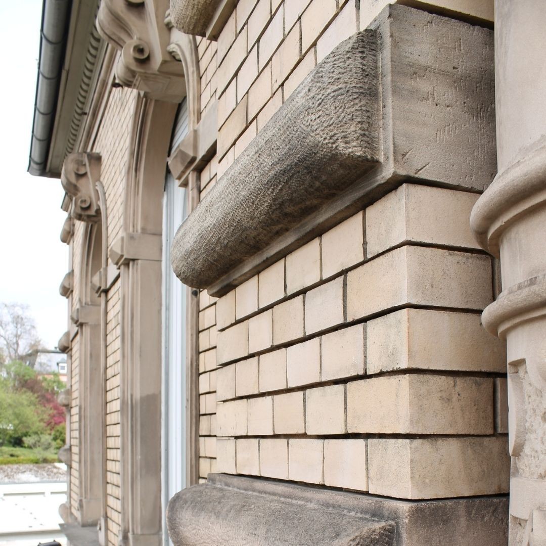 La demeure principale, sur deux niveaux, se distingue par sa maçonnerie en briques claires rehaussée de riches ornements en grès, dans le style néorenaissance. Sa façade rythmée par des ressauts plats, des frontons curvilignes, des balcons à balustres et de grandes fenêtres cintrées reflète le goût bourgeois de l’époque. Le toit mansardé, couvert d’ardoise, accentue la silhouette élancée de la bâtisse.