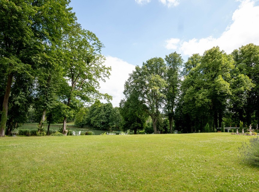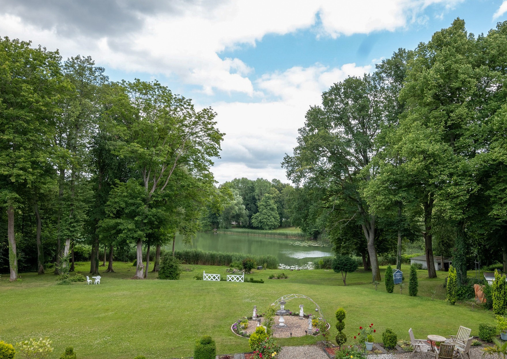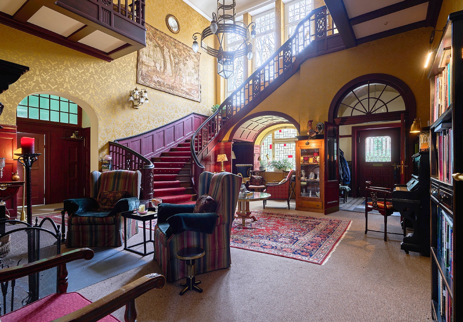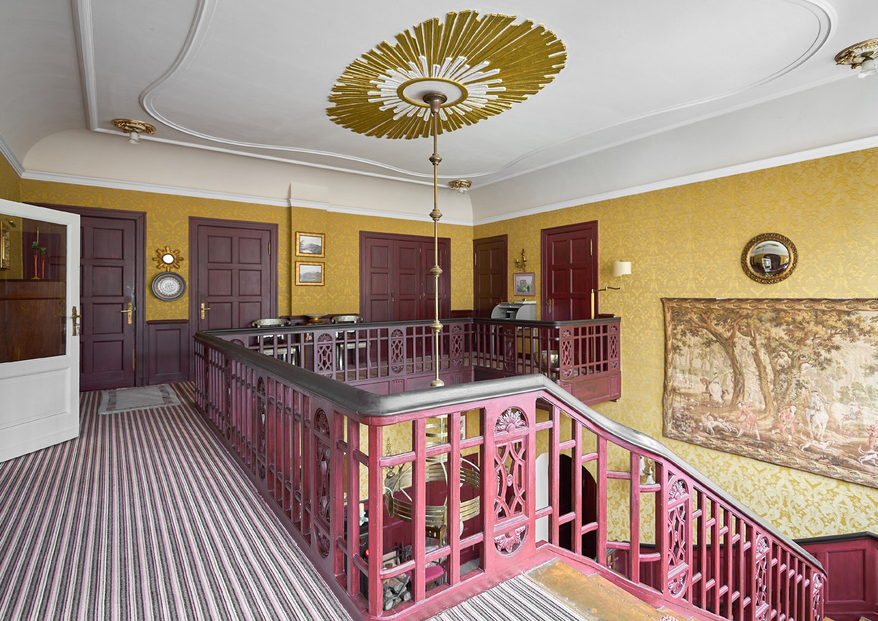 Le cœur de la maison est le hall d’entrée, avec une hauteur sous plafond d’environ 7,5 m et un escalier magistral. De nombreuses pièces conservent leurs éléments d’origine : cheminées, plafonds moulurés, boiseries et lambris raffinés. La bibliothèque, la salle à manger et le jardin d’hiver s’ouvrent sur le parc et le lac. L’ensemble conjugue authenticité historique et confort d’aujourd’hui.