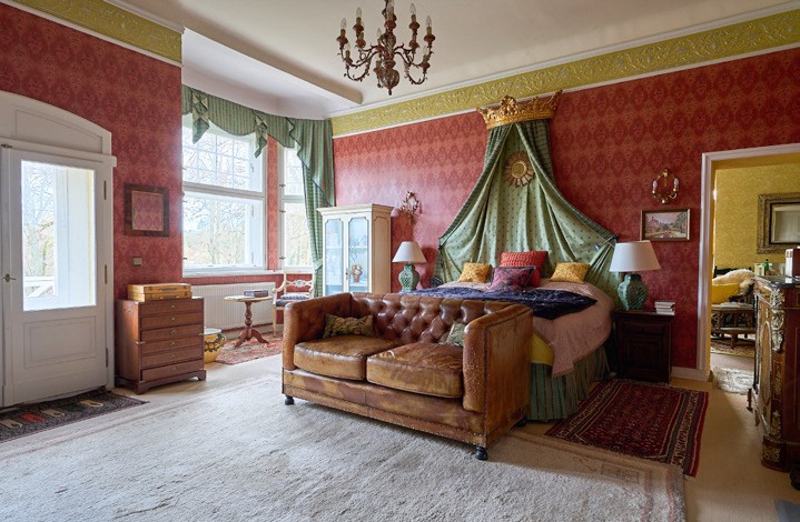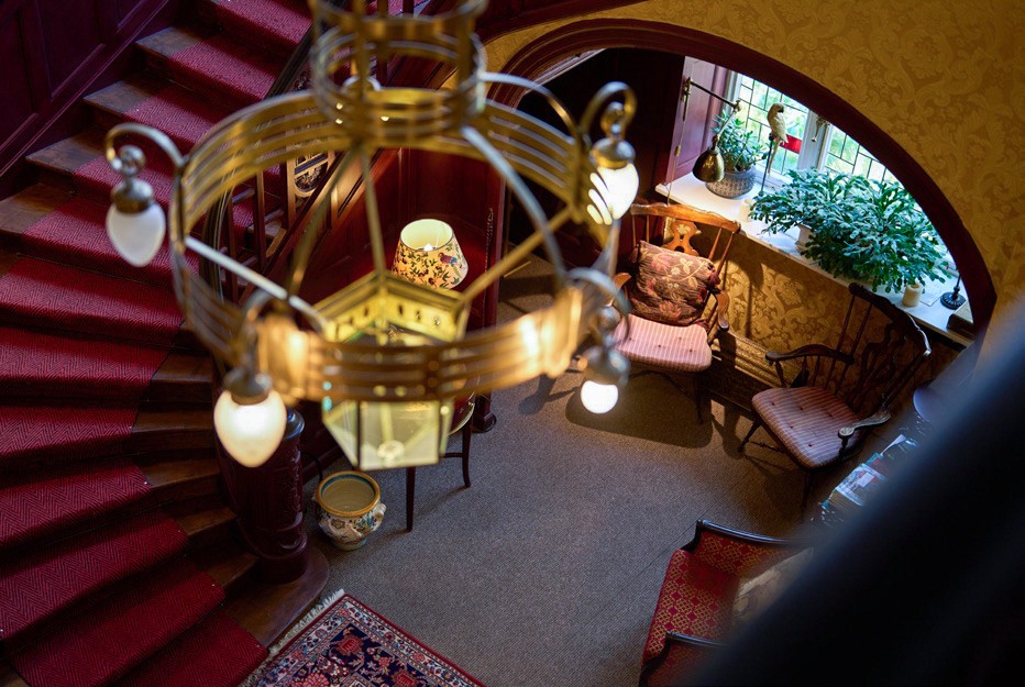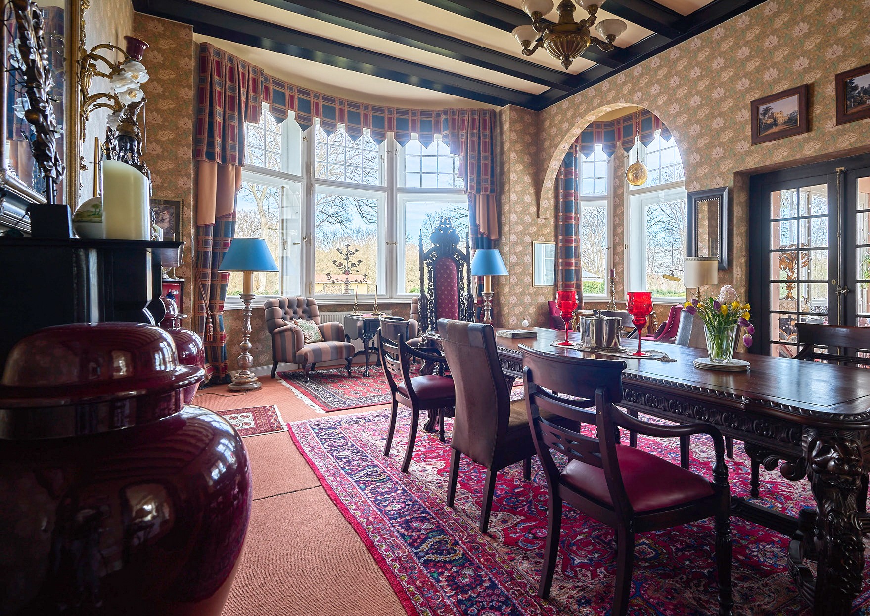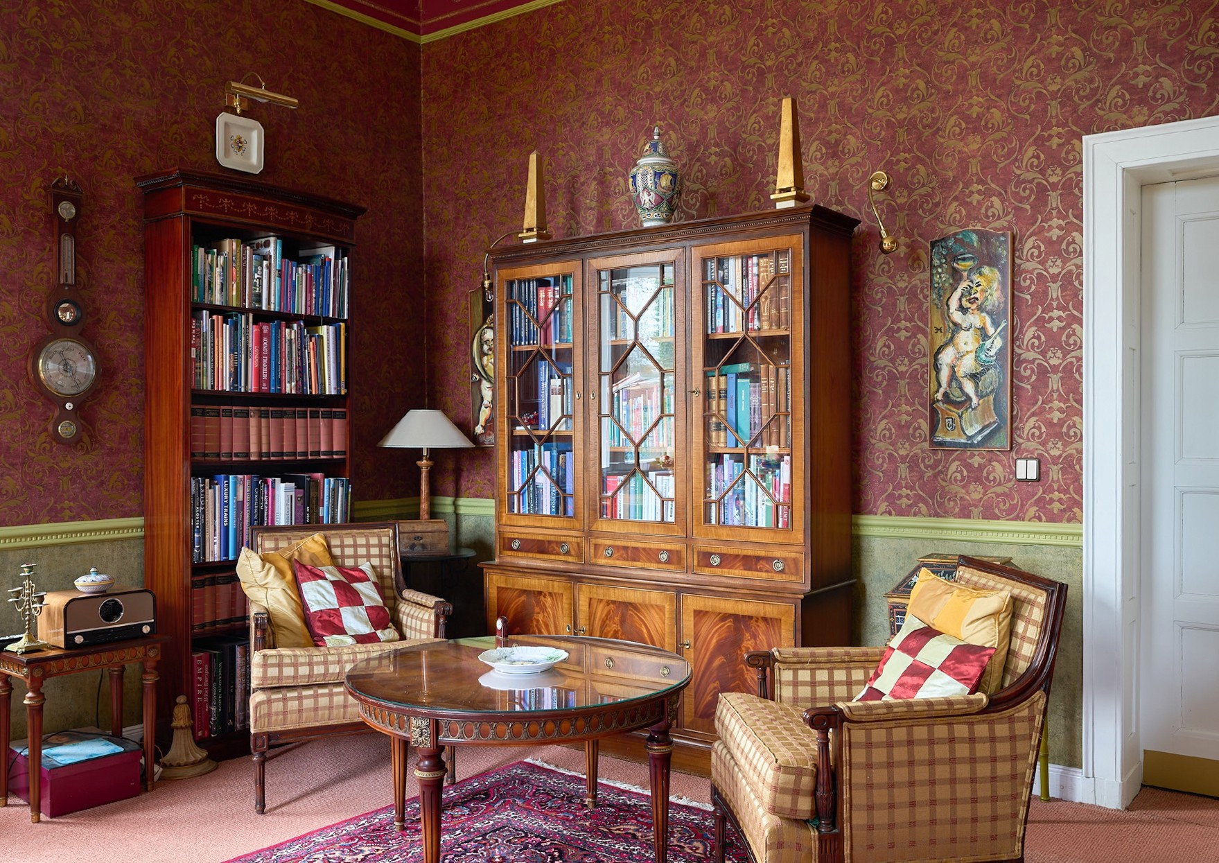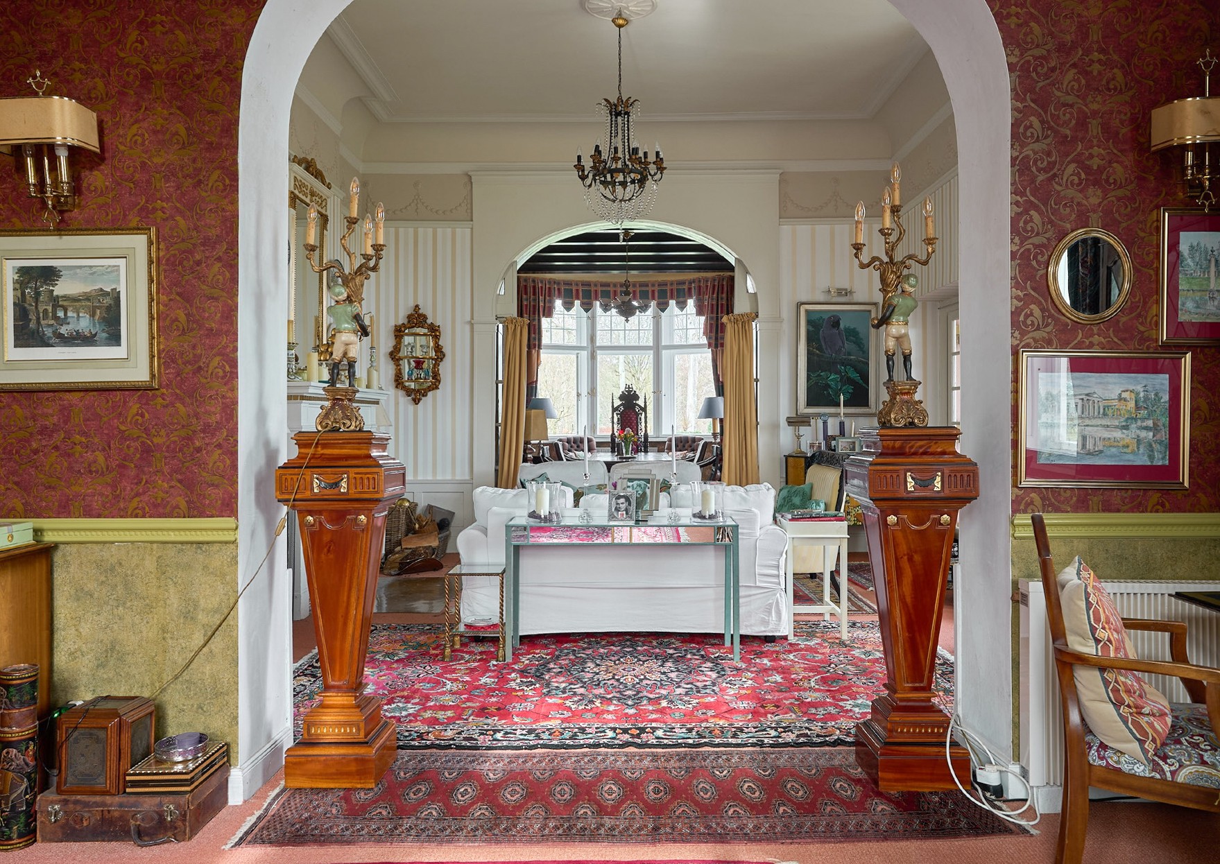 Le cœur de la maison est le hall d’entrée, avec une hauteur sous plafond d’environ 7,5 m et un escalier magistral. De nombreuses pièces conservent leurs éléments d’origine : cheminées, plafonds moulurés, boiseries et lambris raffinés. La bibliothèque, la salle à manger et le jardin d’hiver s’ouvrent sur le parc et le lac. L’ensemble conjugue authenticité historique et confort d’aujourd’hui.
