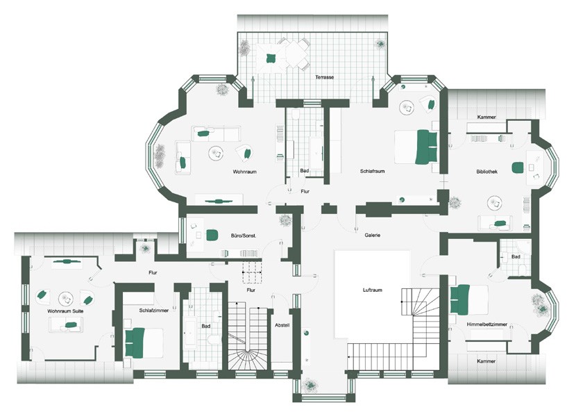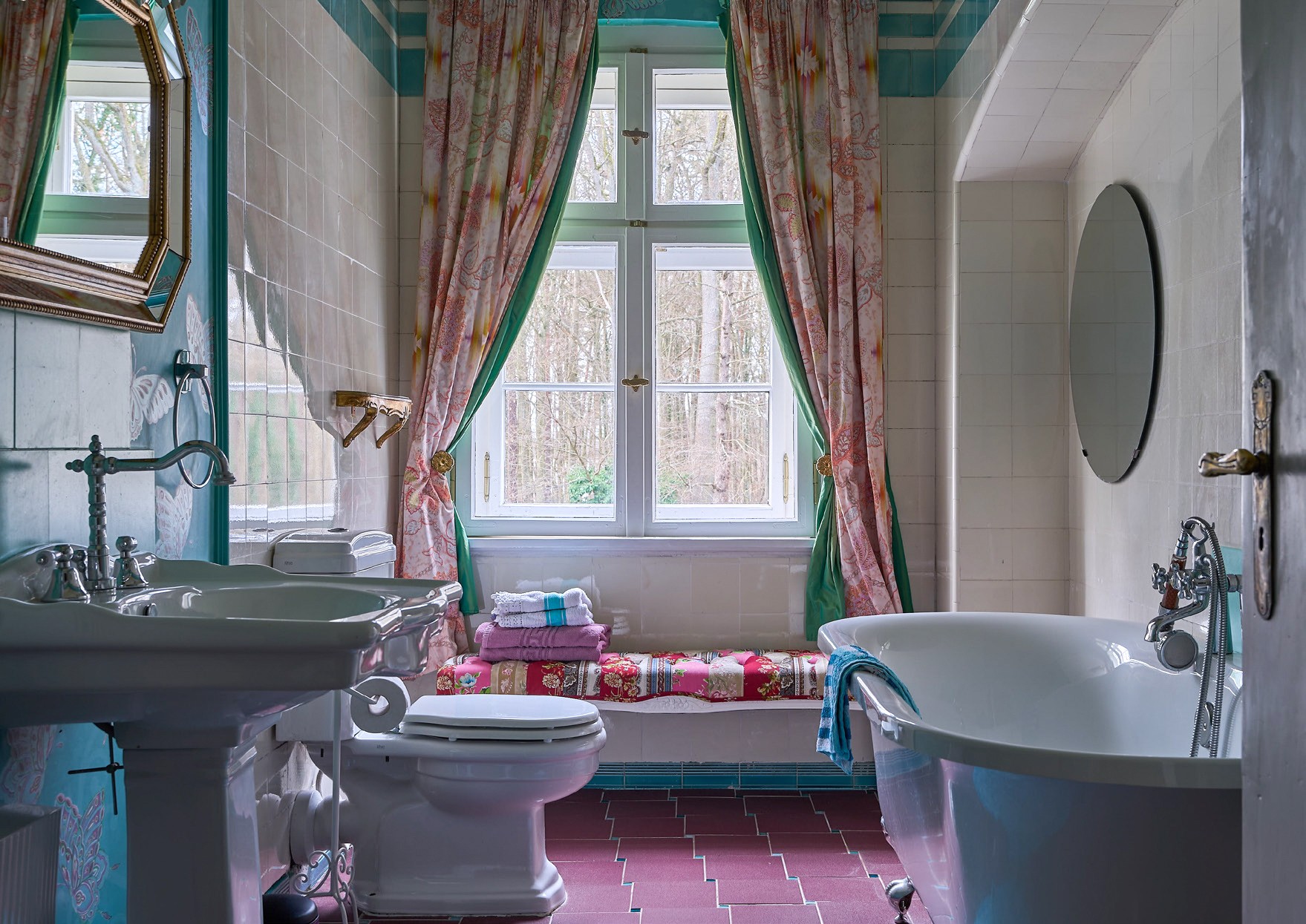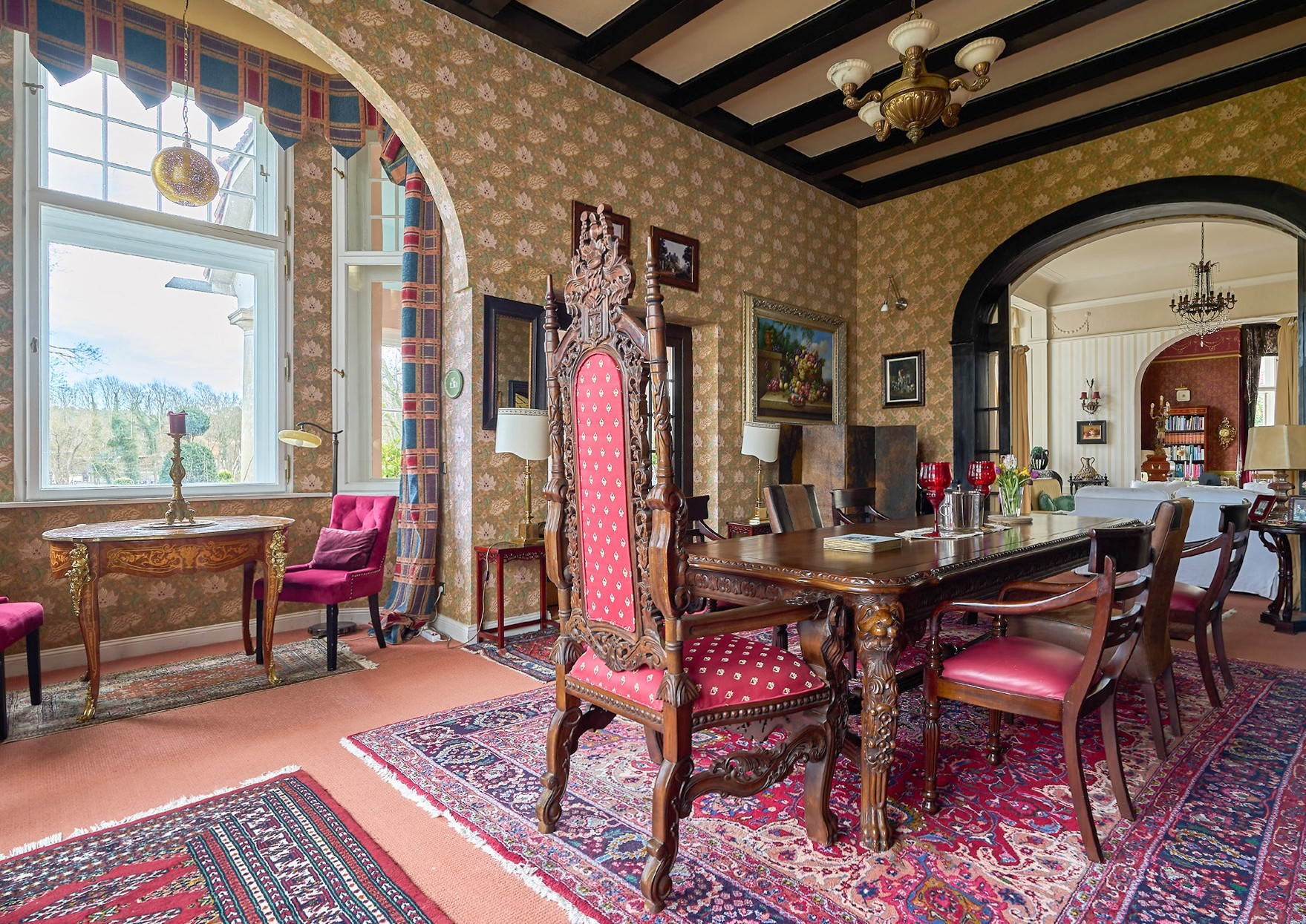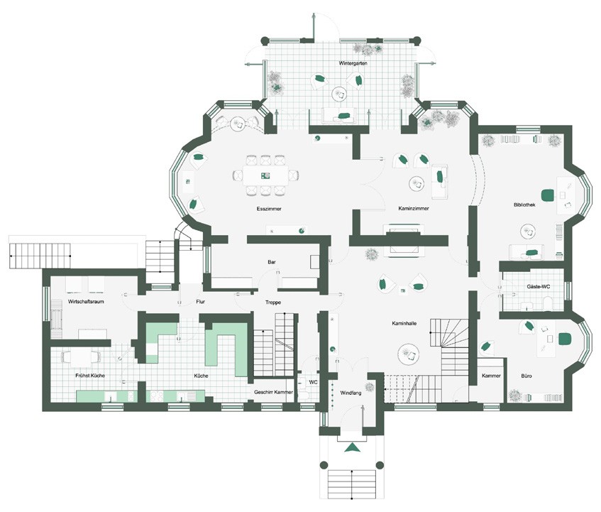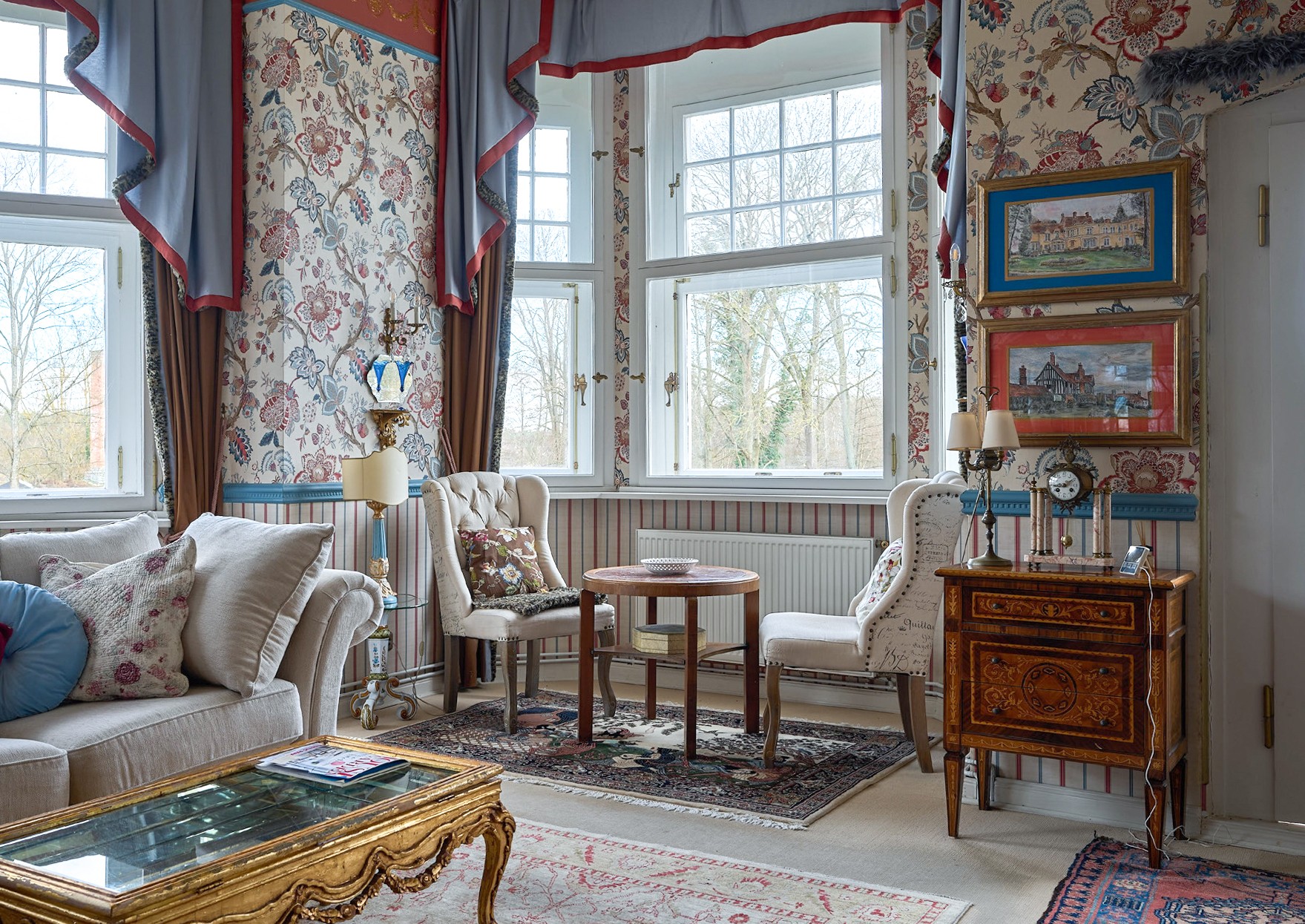 Le cœur de la maison est le hall d’entrée, avec une hauteur sous plafond d’environ 7,5 m et un escalier magistral. De nombreuses pièces conservent leurs éléments d’origine : cheminées, plafonds moulurés, boiseries et lambris raffinés. La bibliothèque, la salle à manger et le jardin d’hiver s’ouvrent sur le parc et le lac. L’ensemble conjugue authenticité historique et confort d’aujourd’hui.