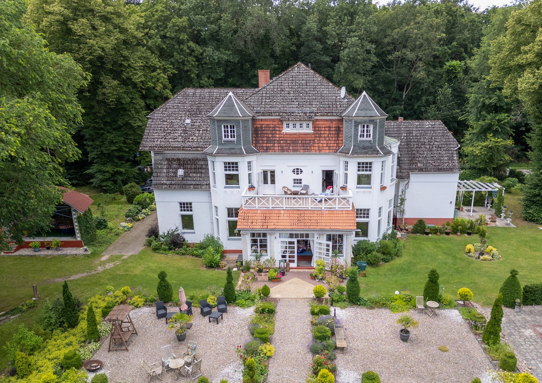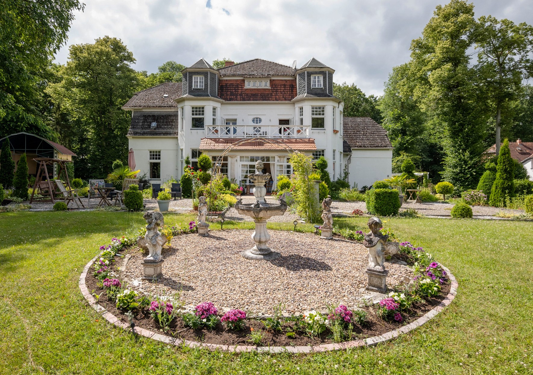 Construite en 1907 dans le paysage lacustre du Brandebourg pour un commerçant de Brême, cette demeure fut conçue comme résidence de prestige et de villégiature. Elle allie la qualité du style cottage anglais à des éléments de l’Art nouveau dans sa période de maturité. La distribution originale des pièces et de nombreux détails d’époque offrent encore aujourd’hui un aperçu fidèle du mode de vie bourgeois autour de 1900.