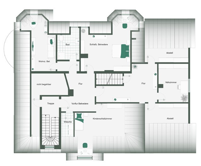 L’étage sous toit, ponctué de tourelles en encorbellement, constitue un élément architectural fort et offre une vue dégagée sur la propriété et les alentours.