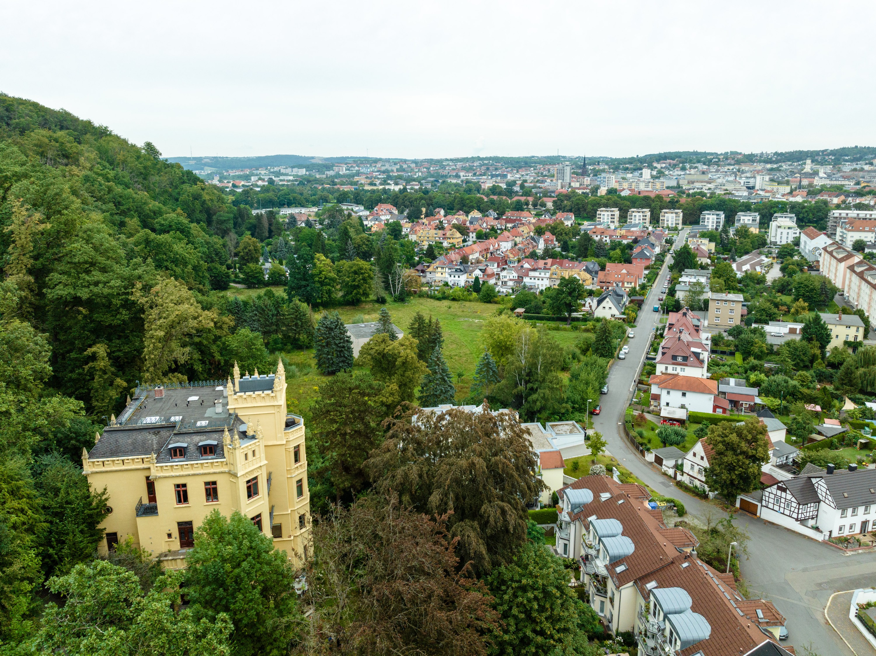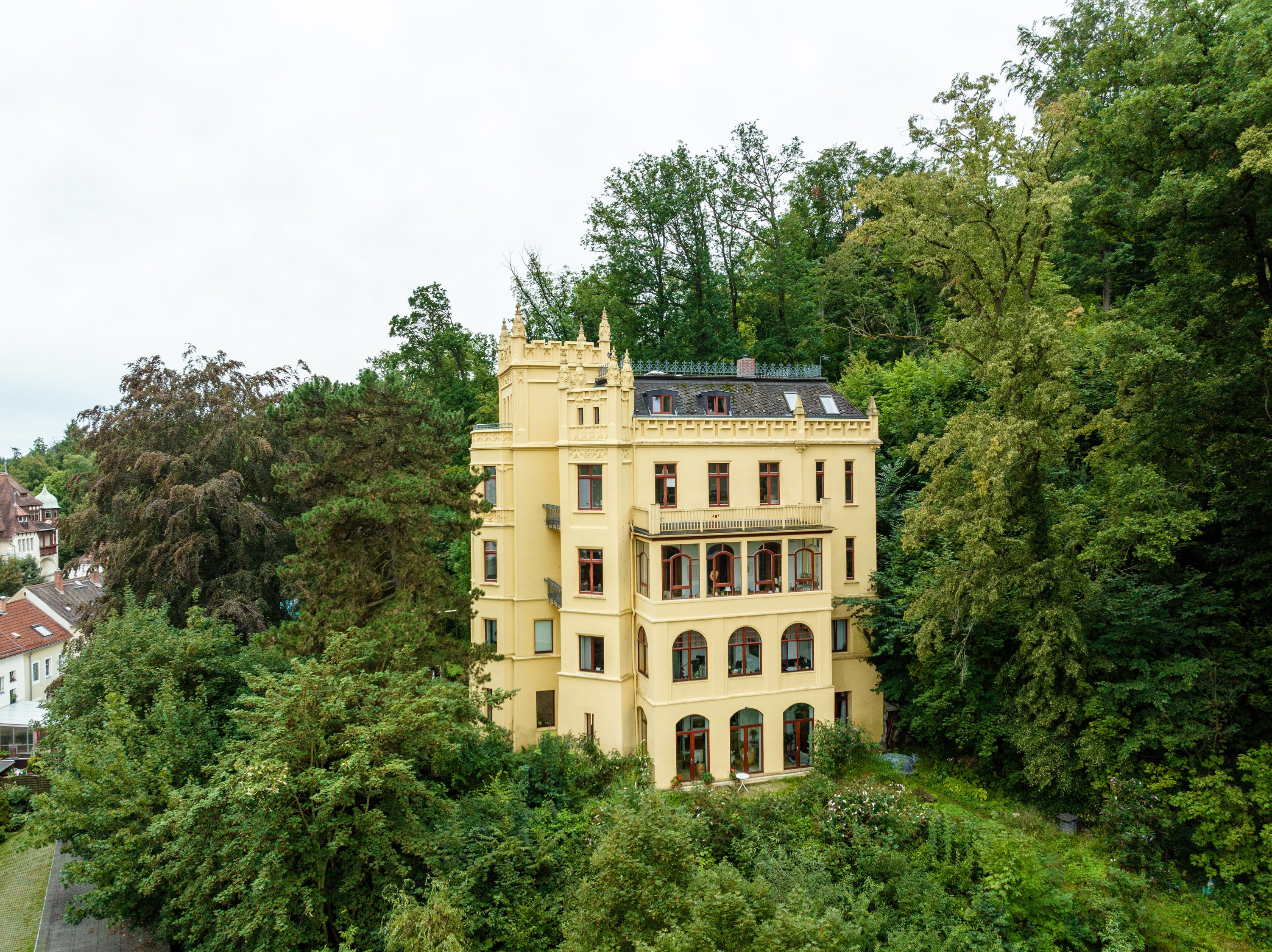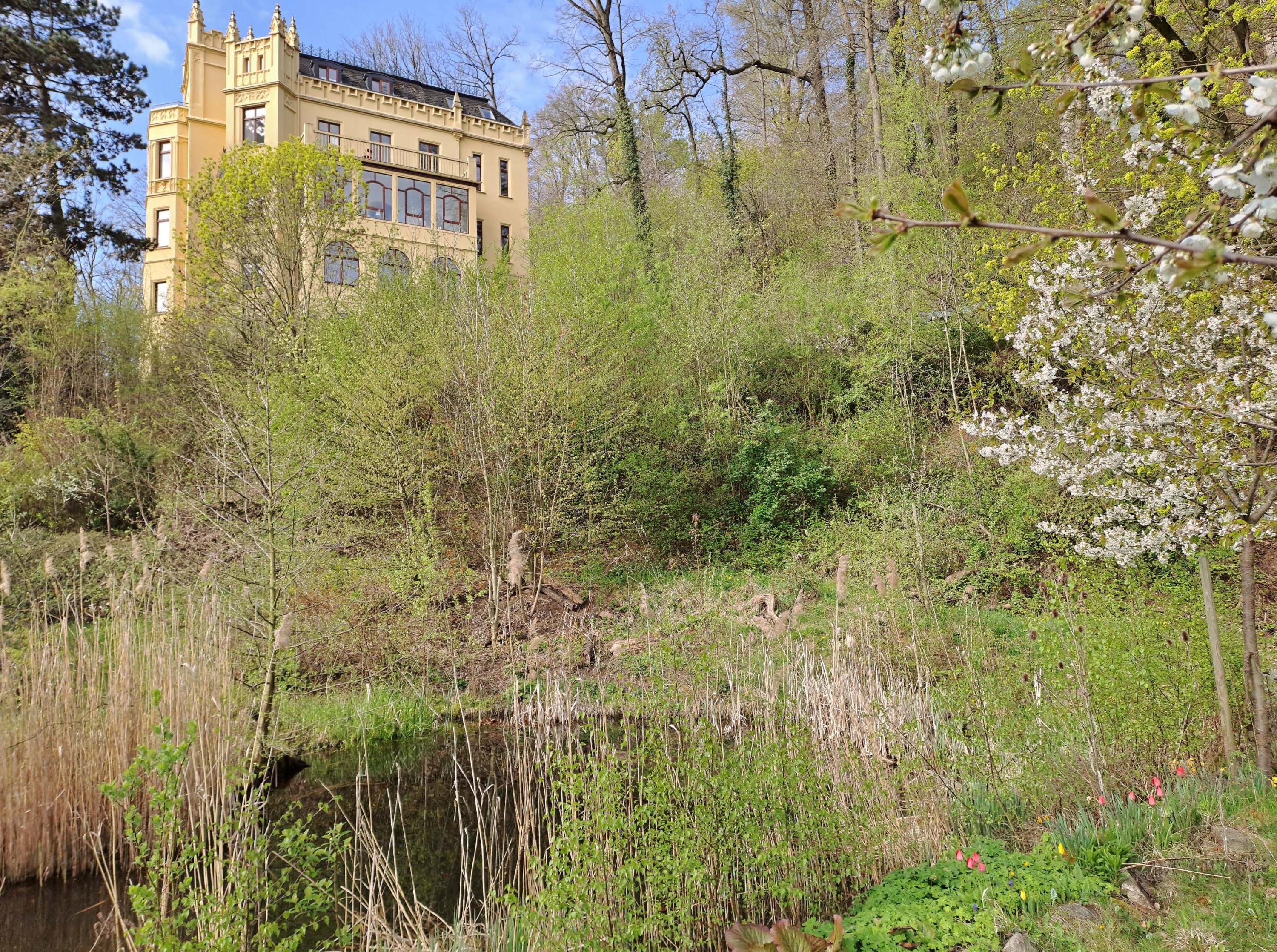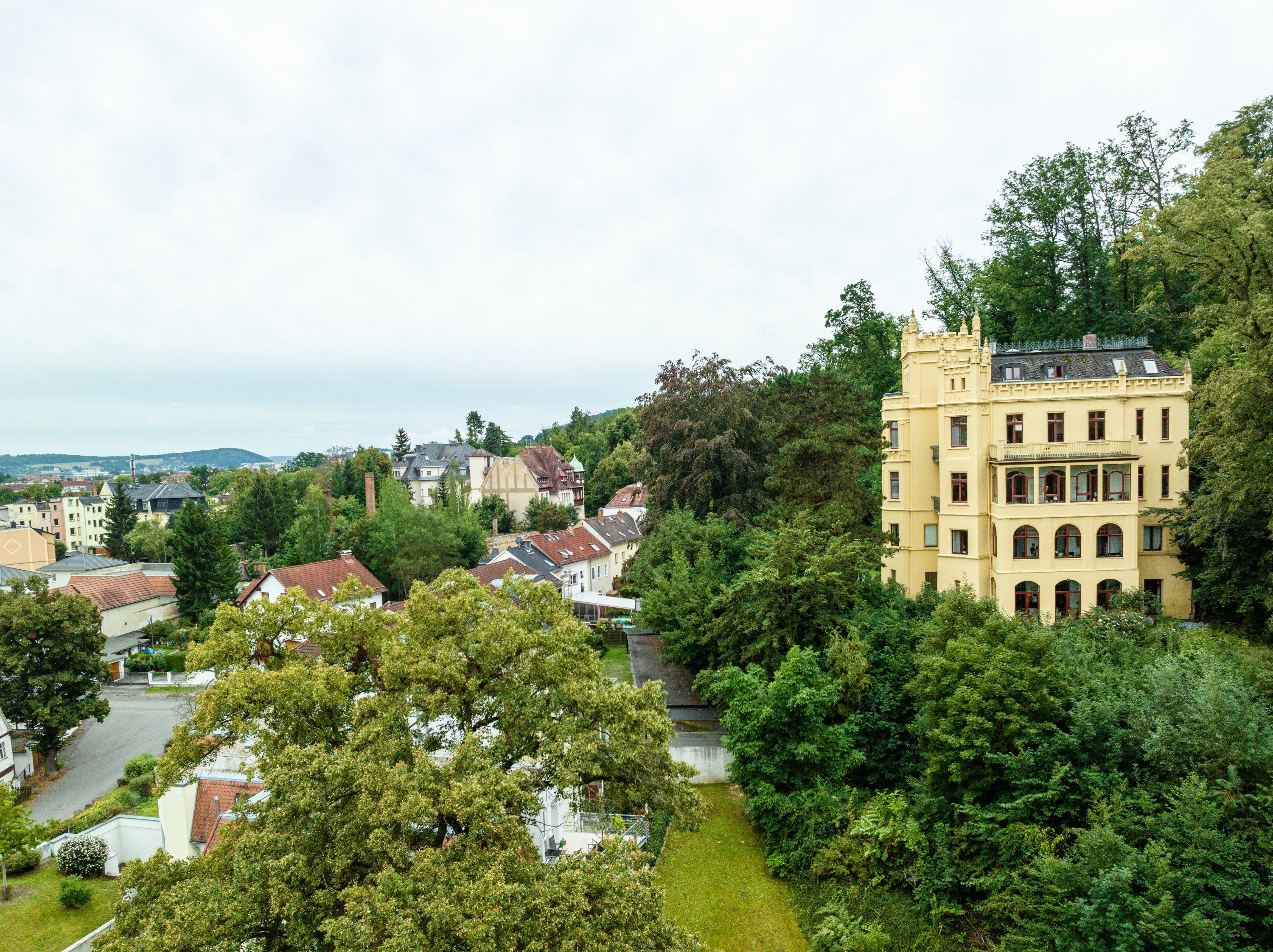 Depuis le jardin d'hiver baigné de lumière, la vue s'étend sur un biotope de deux hectares, les jardins de la villa (avec étang et vergers) ainsi que sur la silhouette de Gera et son hôtel de ville.