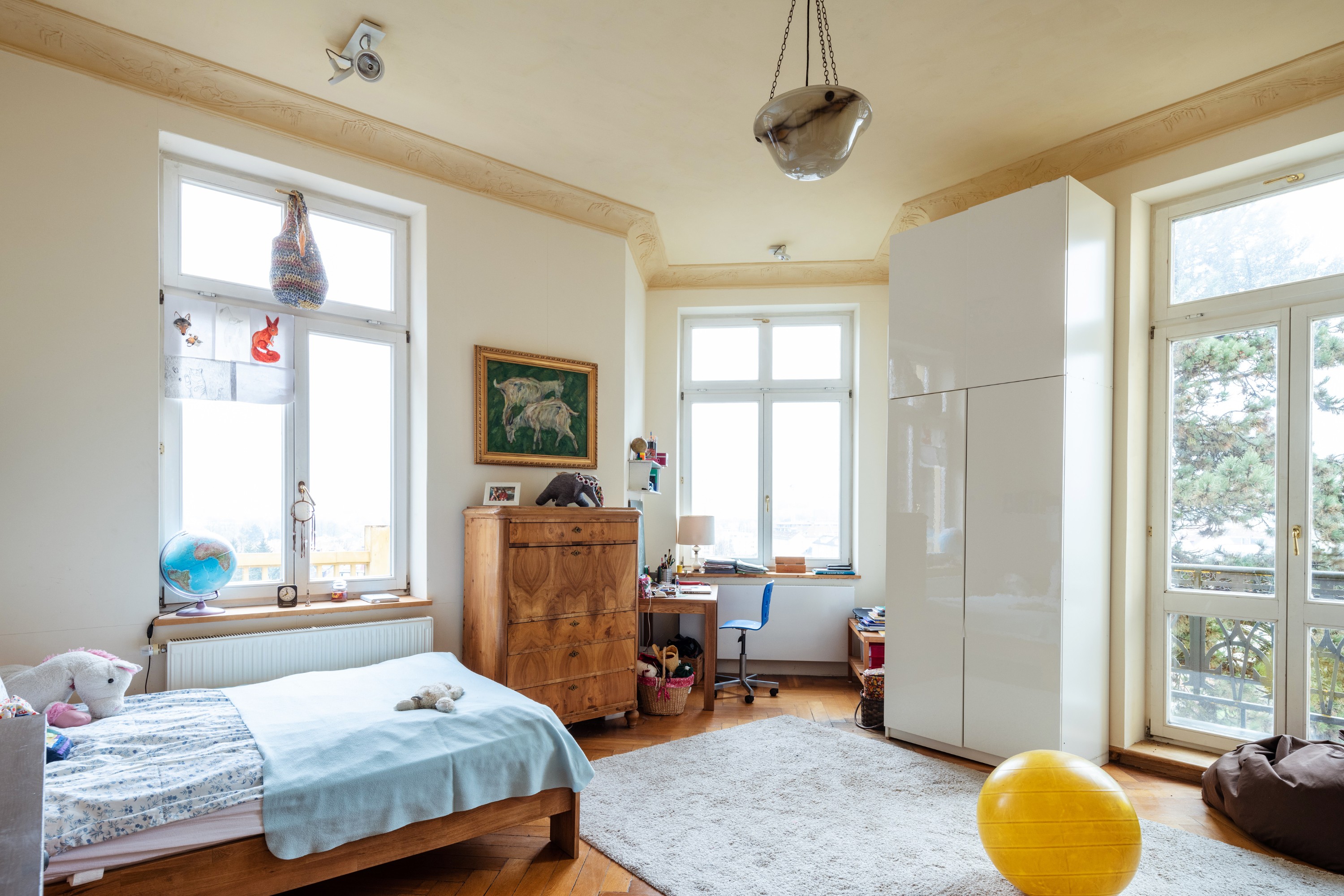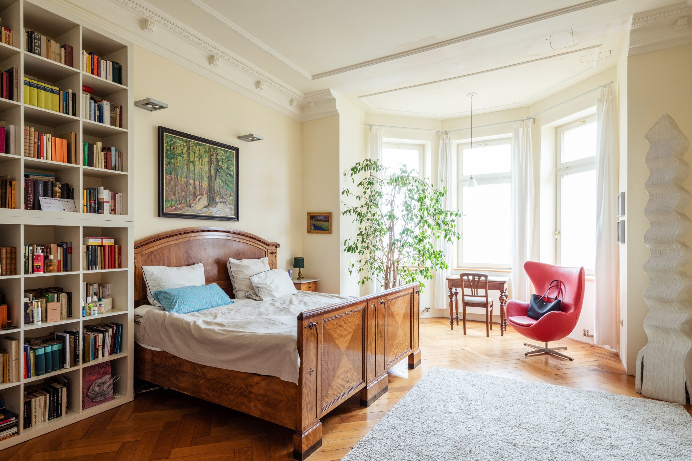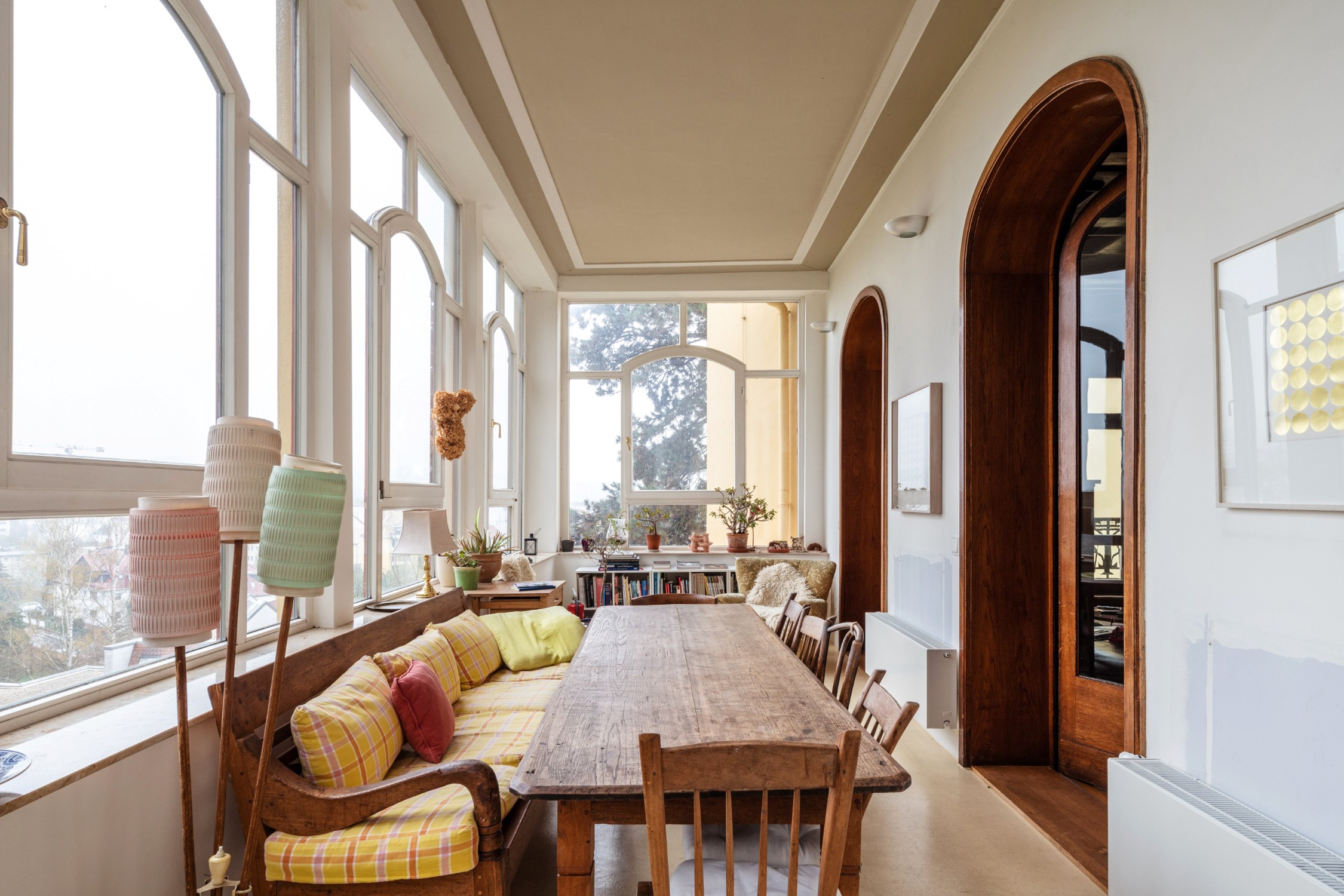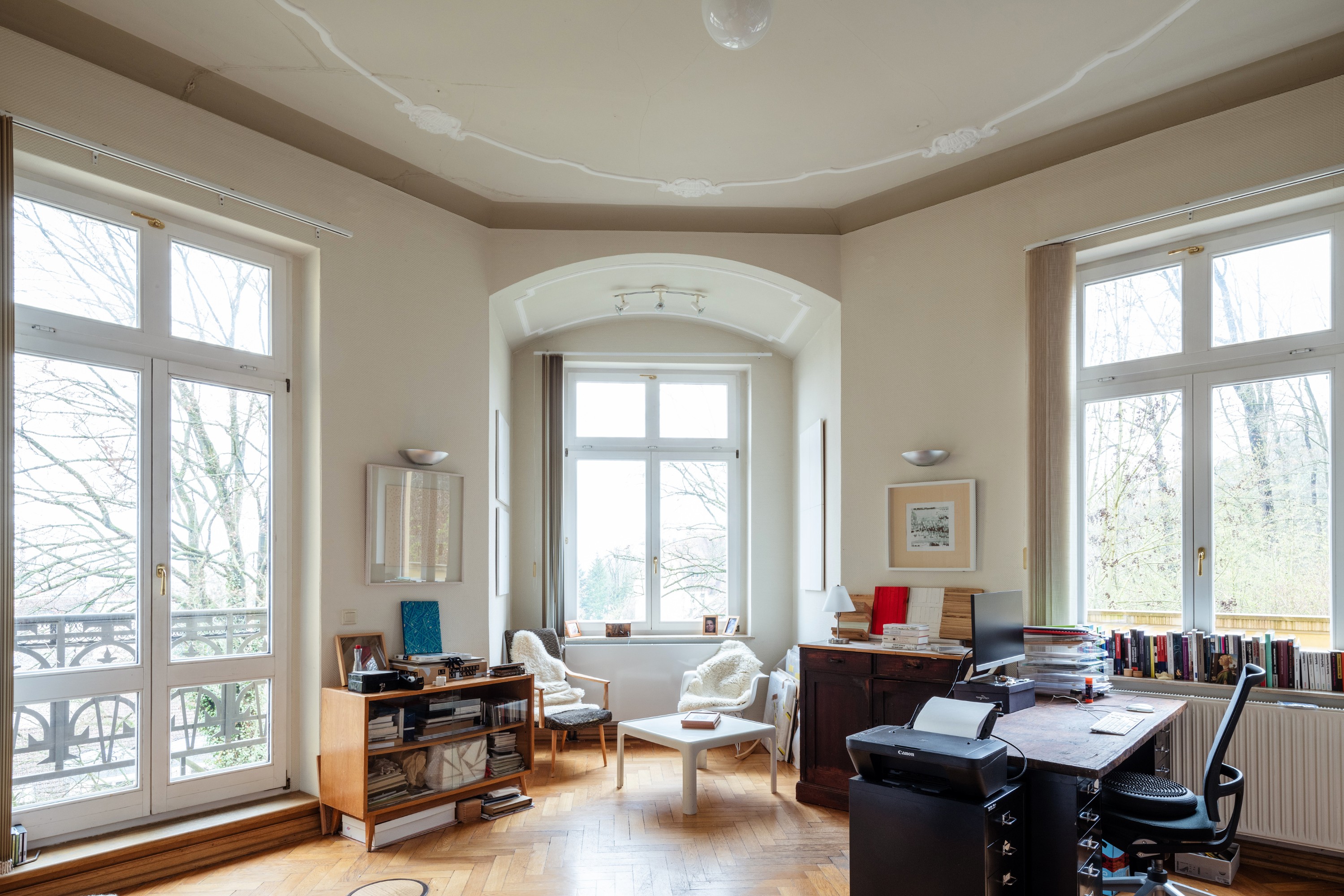 Le grand salon central, baigné de lumière, est né de cette transformation. Aujourd'hui, l'appartement s’étend sur environ 440 m² avec neuf pièces, deux salles de bains, deux vastes terrasses et quatre balcons.