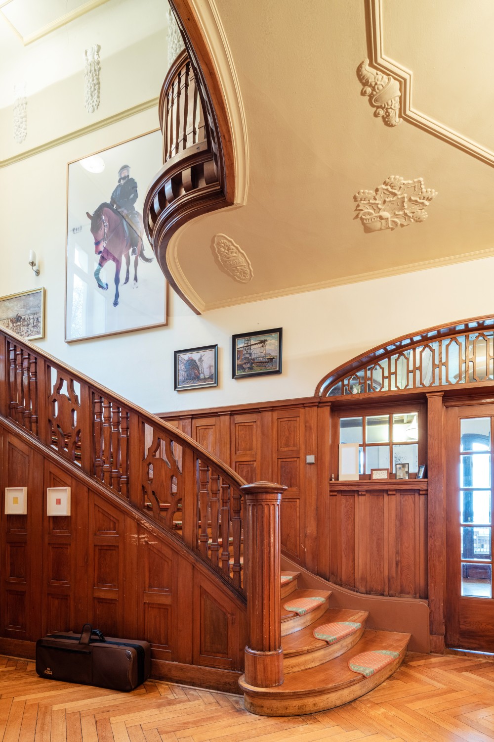 Depuis l’imposant hall d’entrée — orné de boiseries et de stucs d'origine —, on accède aux différents espaces : salons pour dames et messieurs, grande cuisine, majestueux salon traversant de 74 m² avec jardin d'hiver attenant, ainsi qu’aux chambres situées à l'étage supérieur.