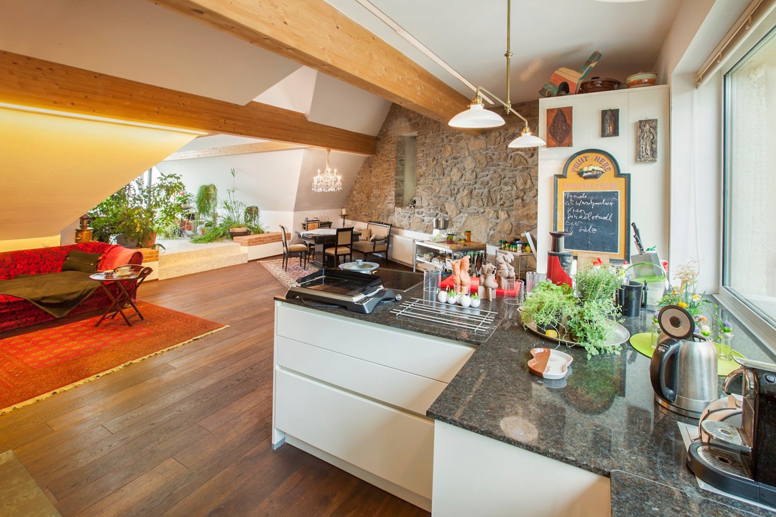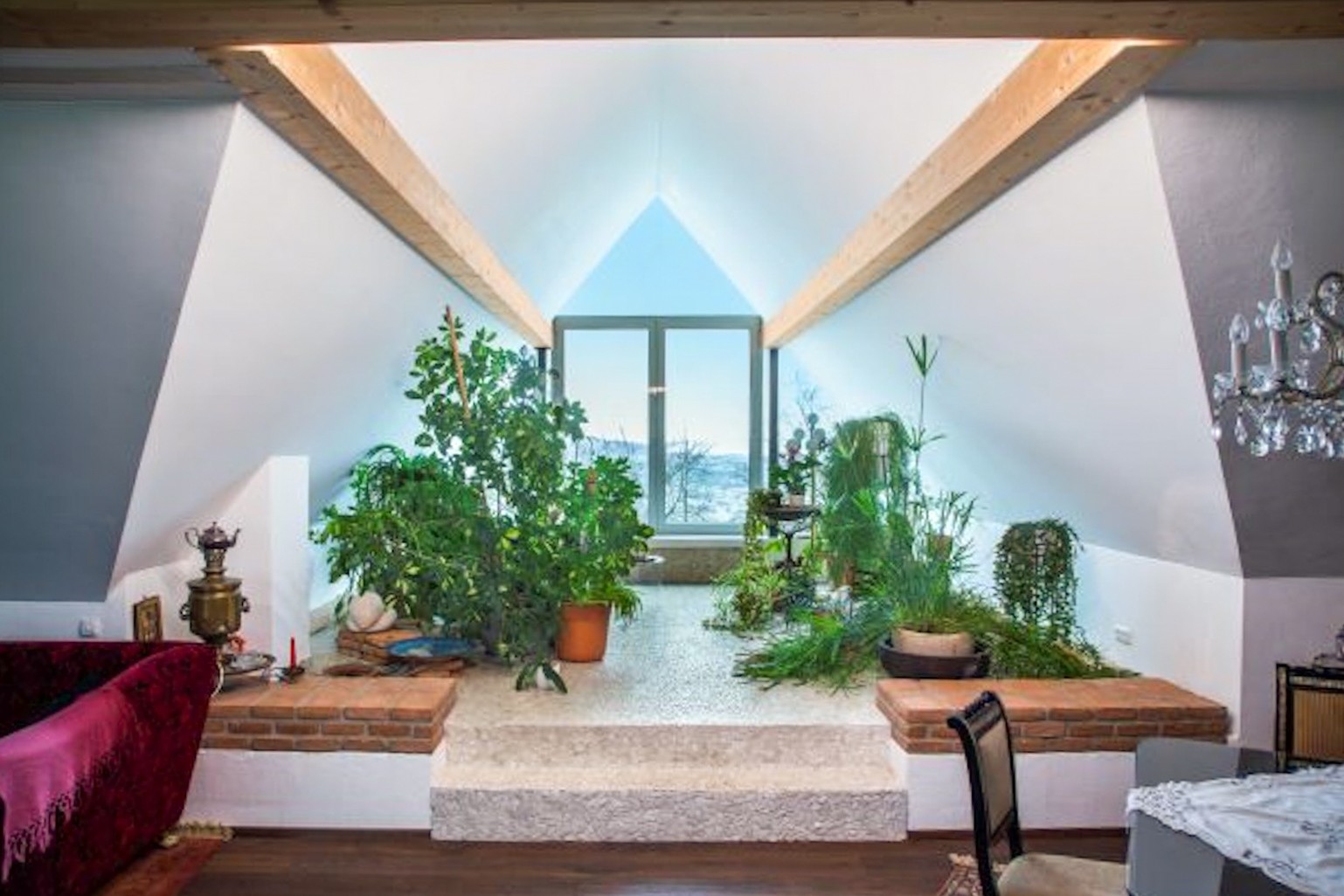 Le résultat offre environ 250 m² de surface habitable répartis sur plusieurs niveaux, tous reliés par un ascenseur aux normes PMR (personnes à mobilité réduite). Les épais murs d'époque Biedermeier du rez-de-chaussée garantissent une inertie thermique naturelle et un calme absolu ; le carillon de la basilique voisine y est à peine audible. Une véranda panoramique, située dans l'extension contemporaine, offre une vue imprenable sur Linz et les collines du Mühlviertel.