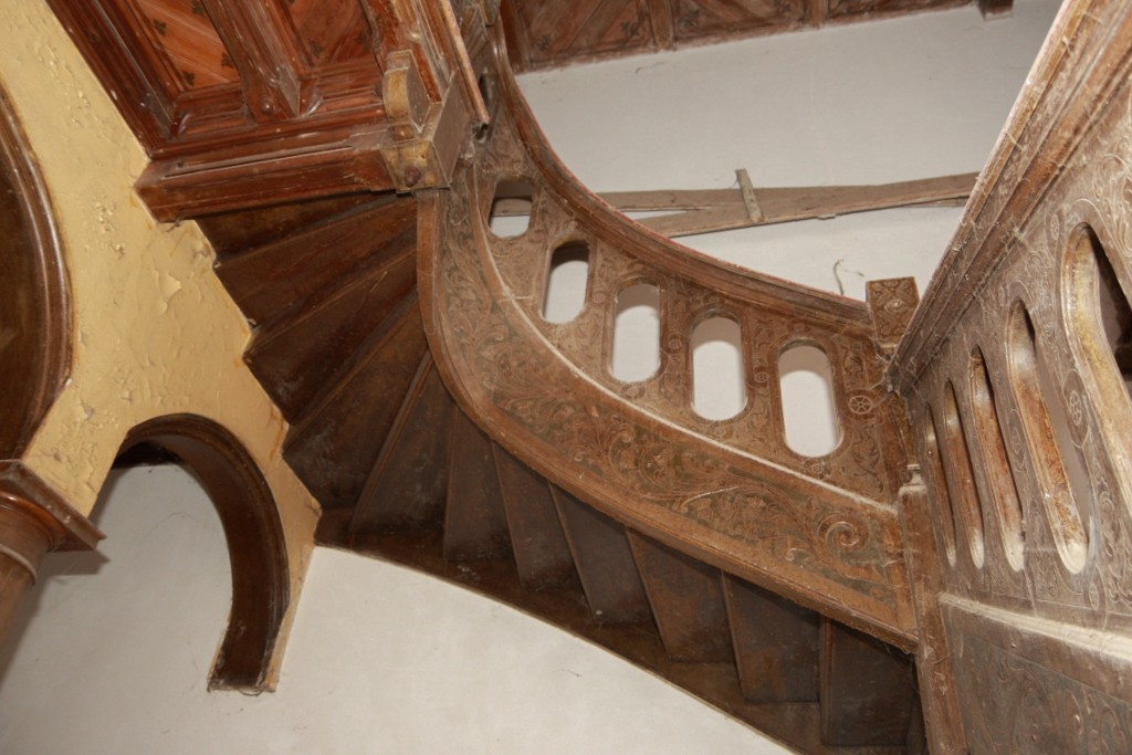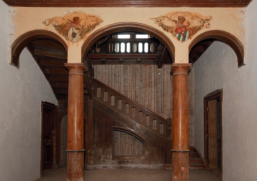 L'intérieur du bâtiment a conservé de nombreux éléments d'origine, caractéristiques de l'Art nouveau : L'escalier en bois ouvert avec des colonnes joliment décorées dans le hall d'entrée est une pièce maîtresse. On peut également y voir des revêtements de plafond décoratifs, des portes, des panneaux et des ferrures. Les toits sont en tuiles plates, les coupoles des tours et leurs terminaisons sont en cuivre.