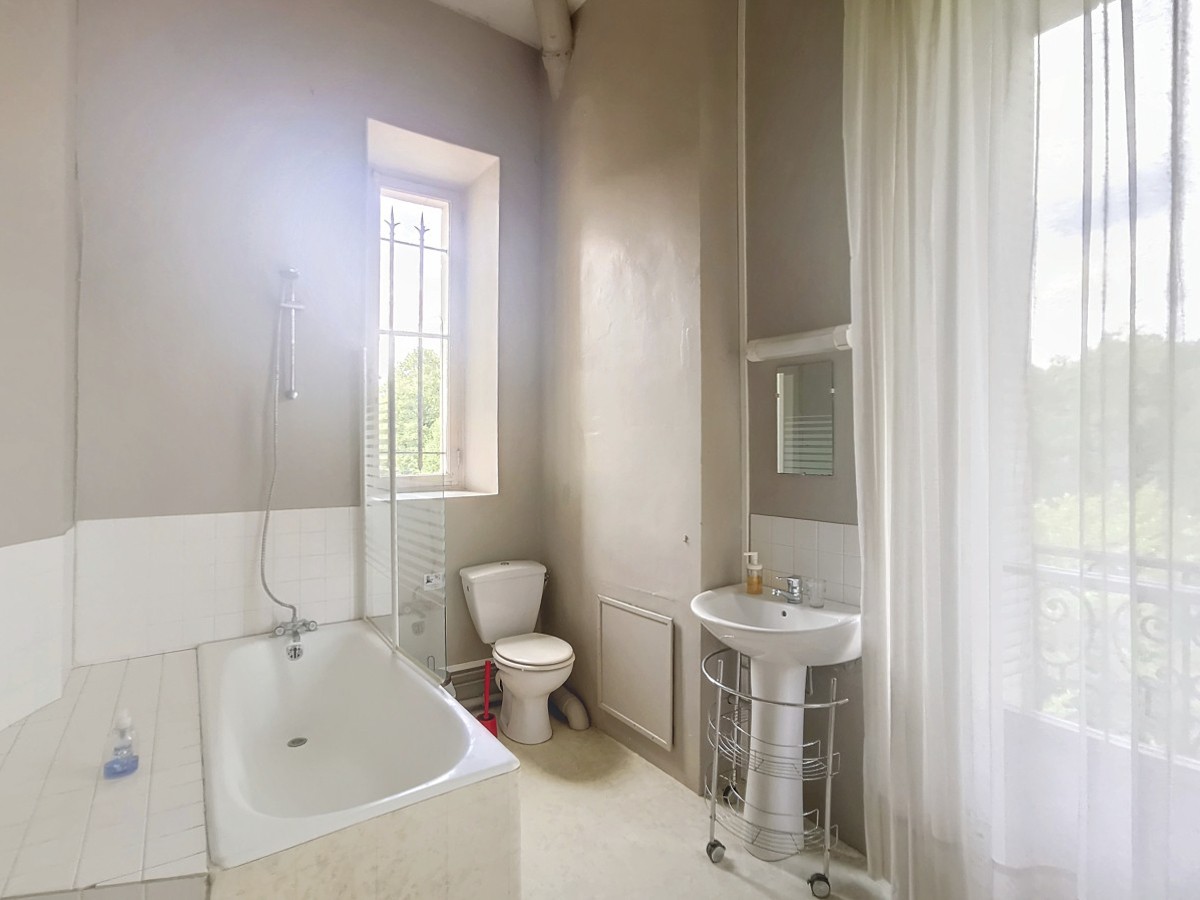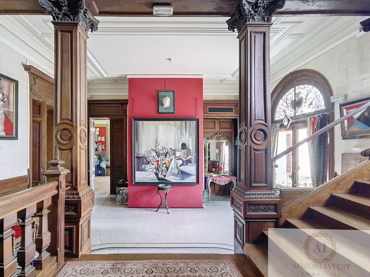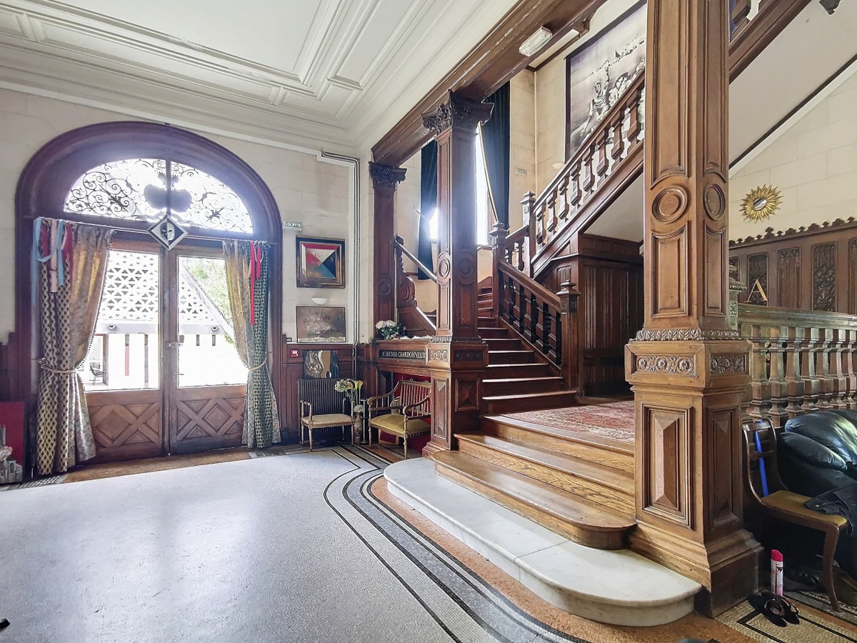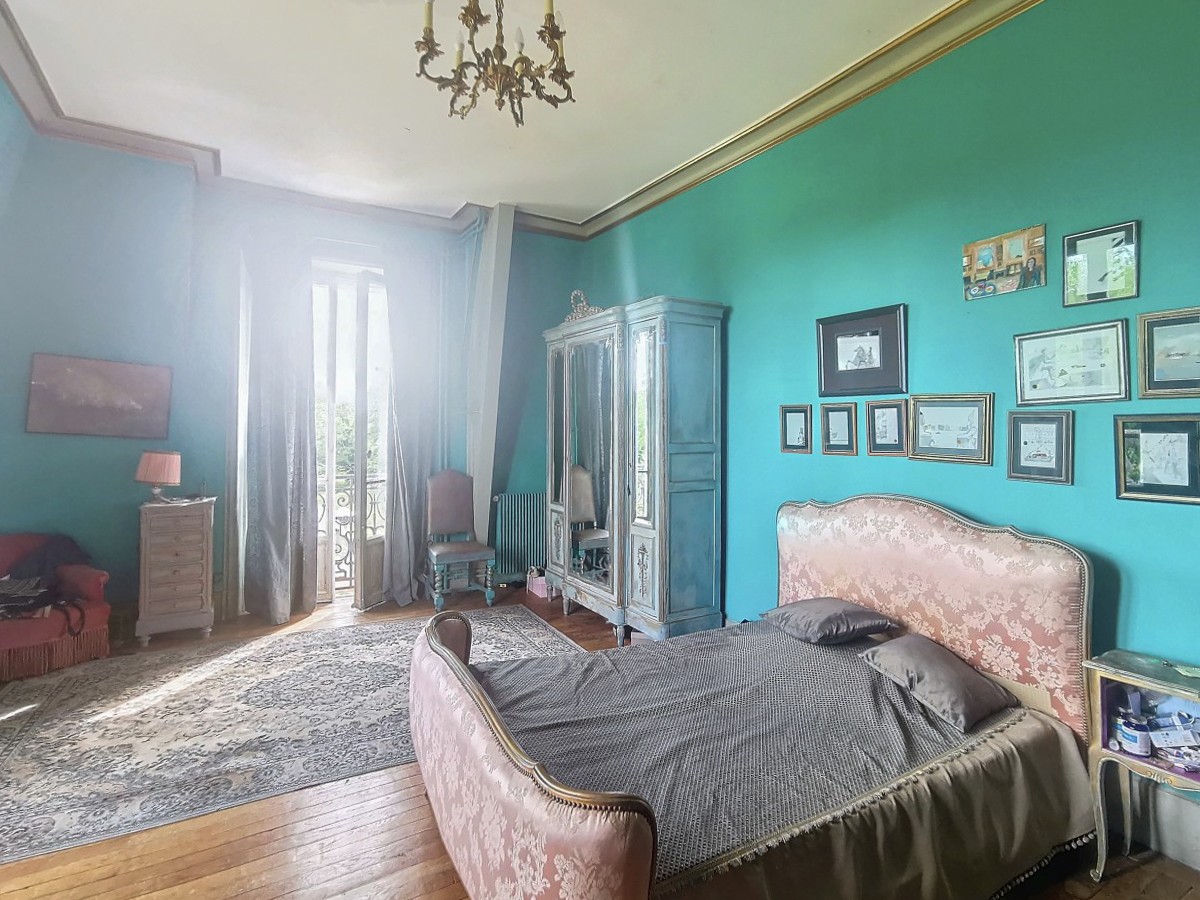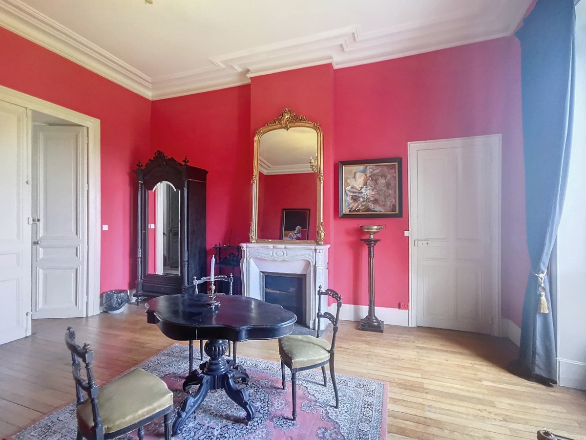 Un majestueux escalier en bois mène à l'étage où se trouvent trois salons (actuellement utilisés comme chambres), trois chambres, deux salles de bains avec toilettes, une salle d'eau avec toilettes, ainsi qu'une chambre nécessitant des travaux de rénovation.