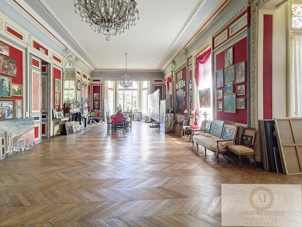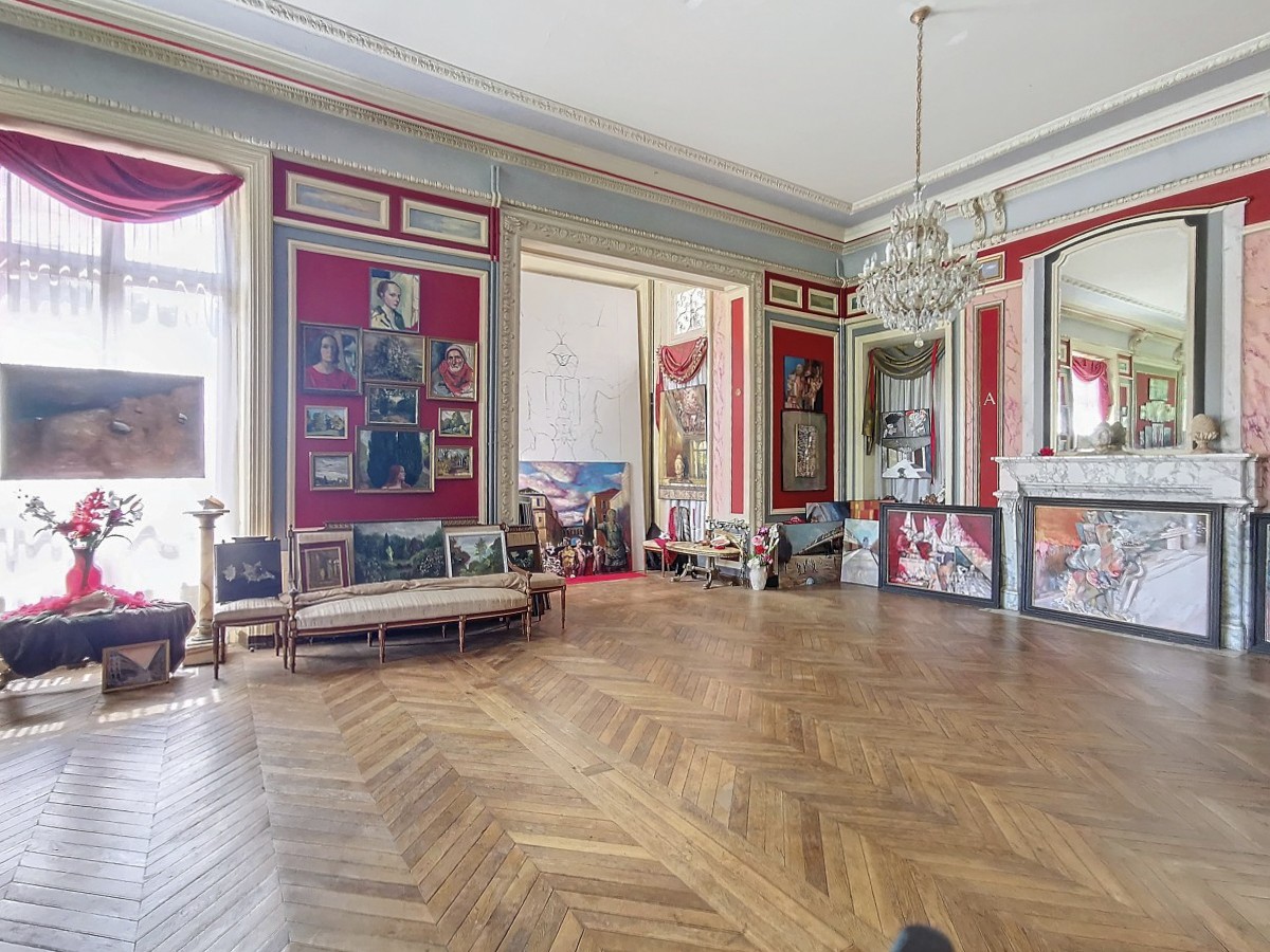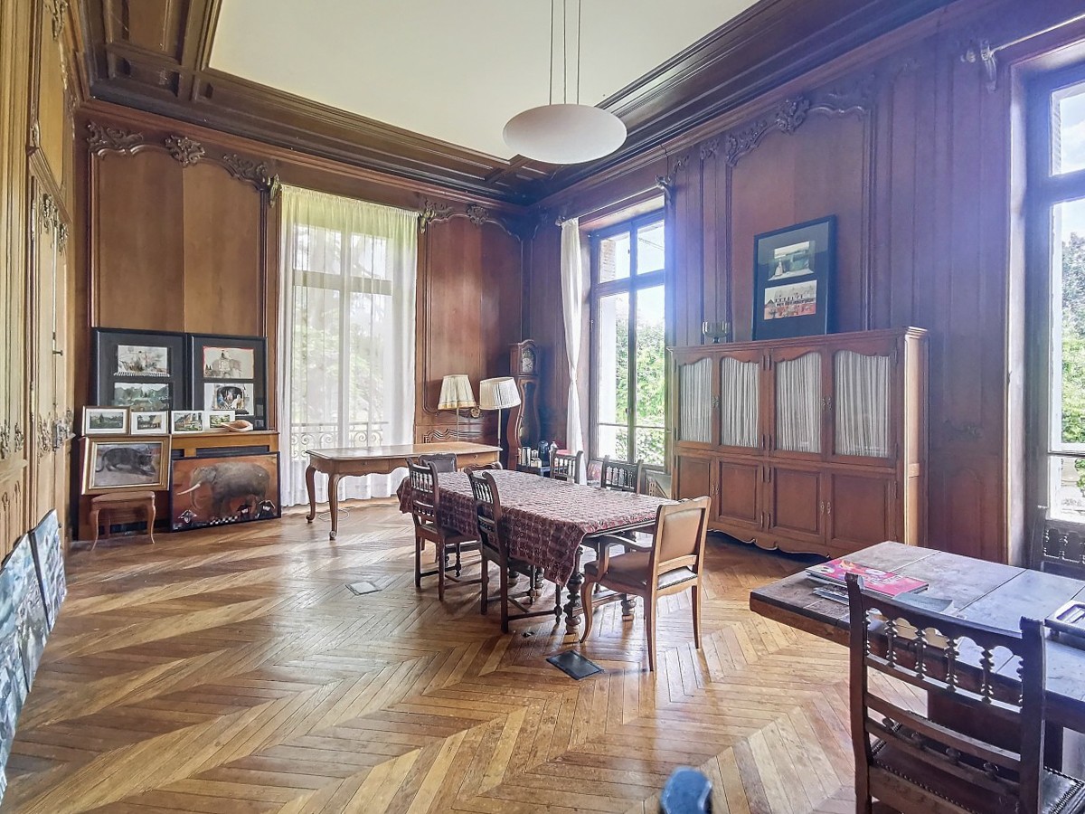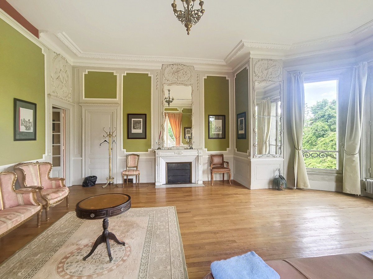 Au rez-de-chaussée, une vaste entrée de 60 m² distribue les espaces suivants : un grand salon de 120 m² avec deux cheminées et un parquet en point de Hongrie, un salon en bois lambrissé de chêne de 40 m² avec accès à une terrasse, un bureau de 25 m², une cuisine de 10 m², et des toilettes. Grâce à une hauteur sous plafond de 4,5 m et à de nombreuses ouvertures, ces pièces révèlent toute leur grandeur.