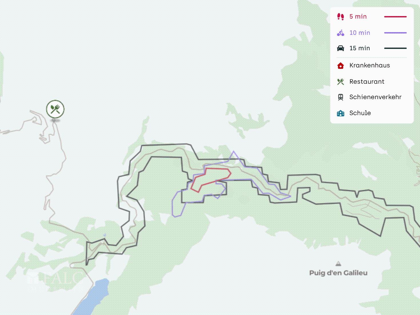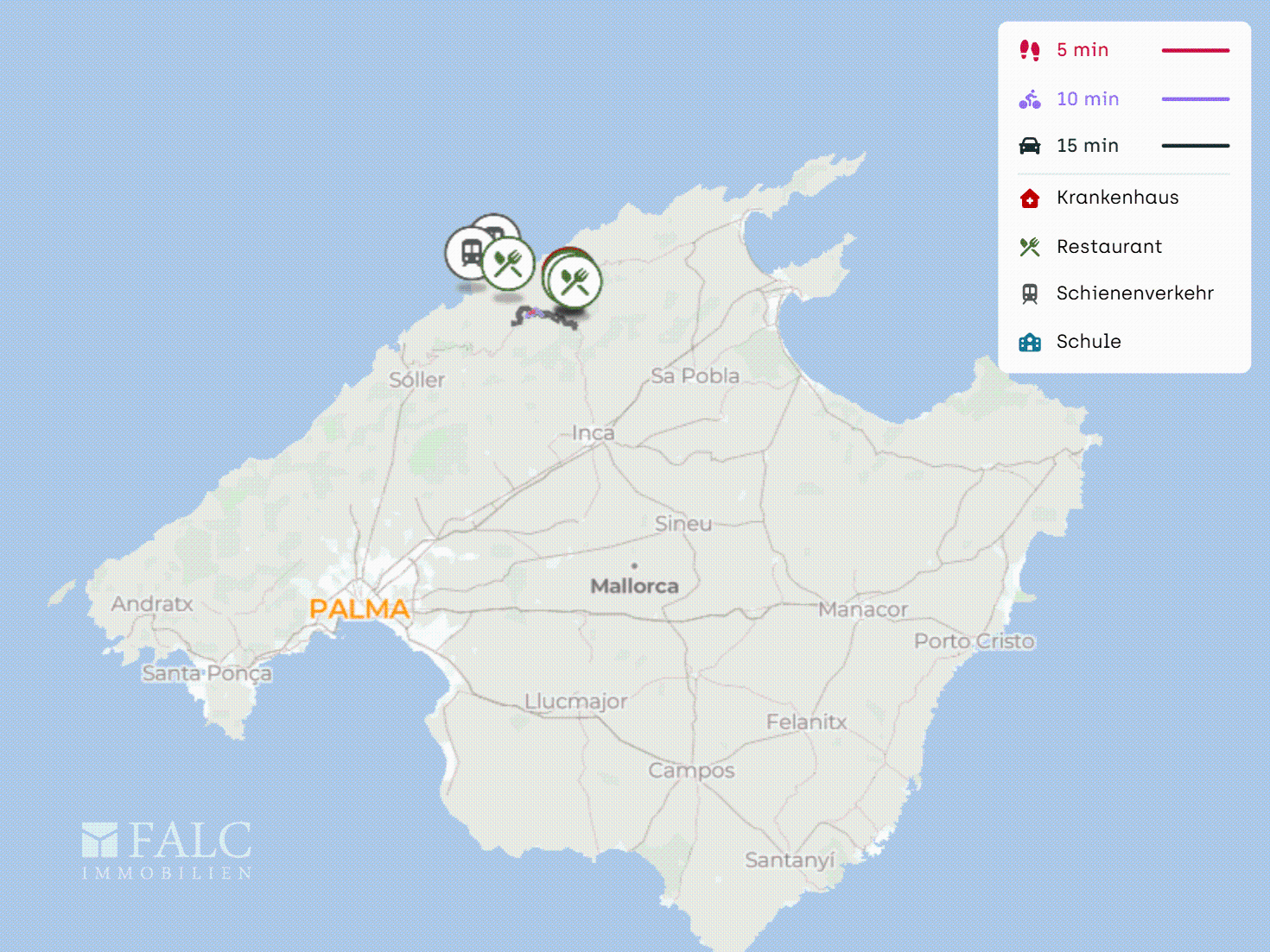 Le village le plus proche est accessible en environ 10 minutes en voiture. À proximité de Lluc se trouvent une pharmacie, une clinique ainsi que l’Escolania de Lluc pour l’offre éducative. Les plages naturelles de Cala Tuent et de Platja del Torrent de Pareis sont à quelques kilomètres et comptent parmi les côtes les plus spectaculaires de l’île. L’aéroport de Palma de Majorque est accessible en environ une heure, selon l’itinéraire.