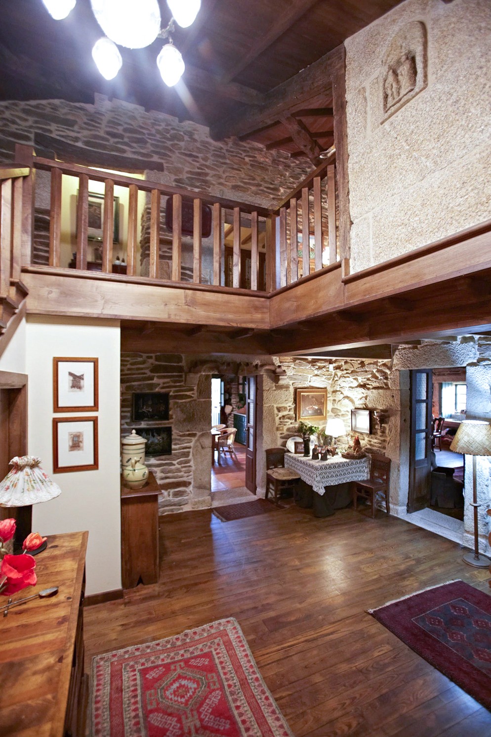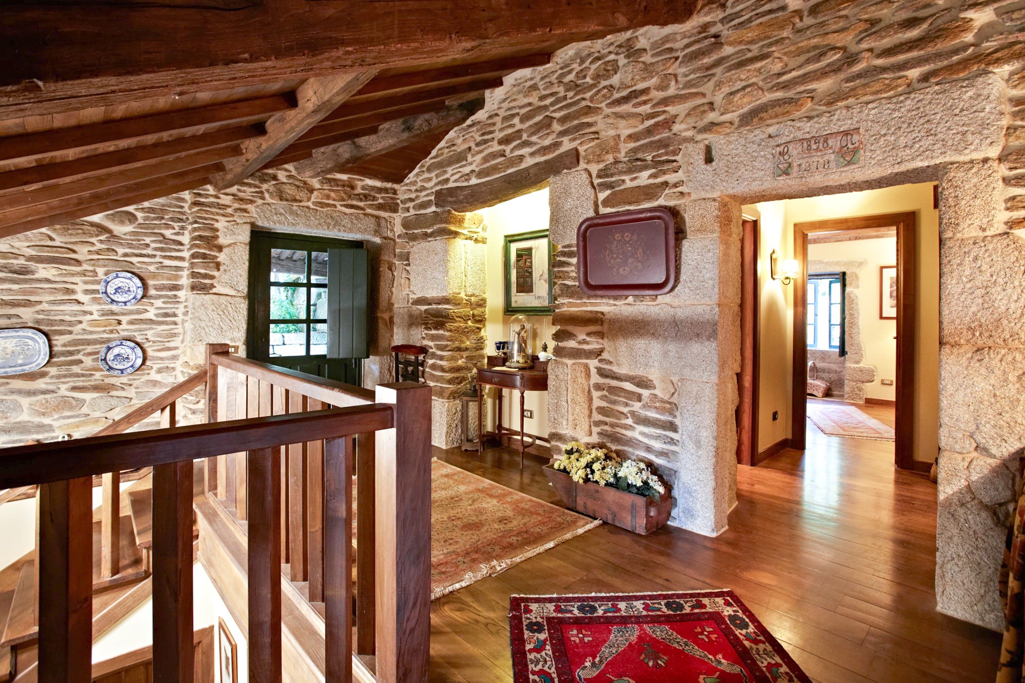 La maison repose sur un terrain de plus de 11 000 m² offrant une vue sur la vallée jusqu’à la Serra da Groba. La surface habitable comprend quatre chambres, dont une suite parentale avec salle de bains privative. L’espace de vie est ouvert, avec une cheminée, une salle à manger avec cuisine intégrée et un accès à une cour intérieure protégée. Deux chambres à l’étage disposent de balcons avec vue.