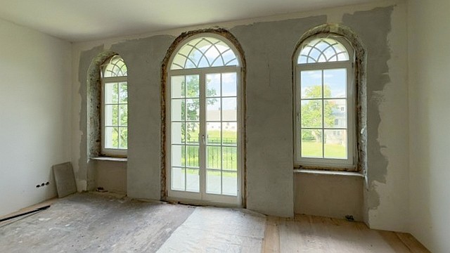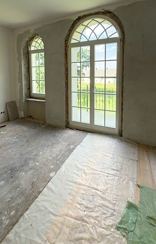 La propriété a bénéficié d'une restauration structurelle majeure : charpente et couverture neuves, ravalement complet (enduits intérieurs et extérieurs), pose de menuiseries en bois à double vitrage (respectant les normes des monuments historiques) et installation de sanitaires modernes. Seuls quelques travaux de finition restent à prévoir.