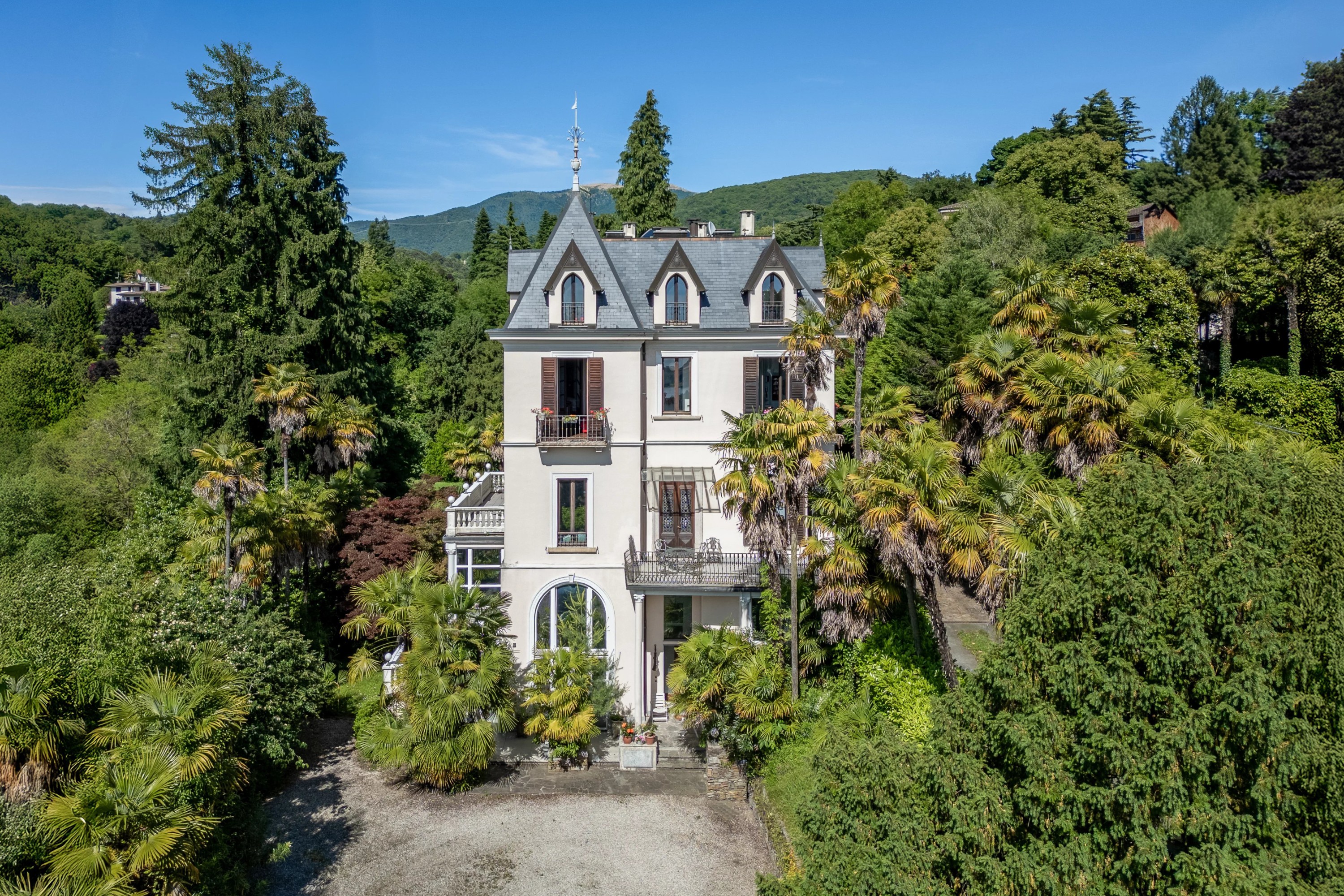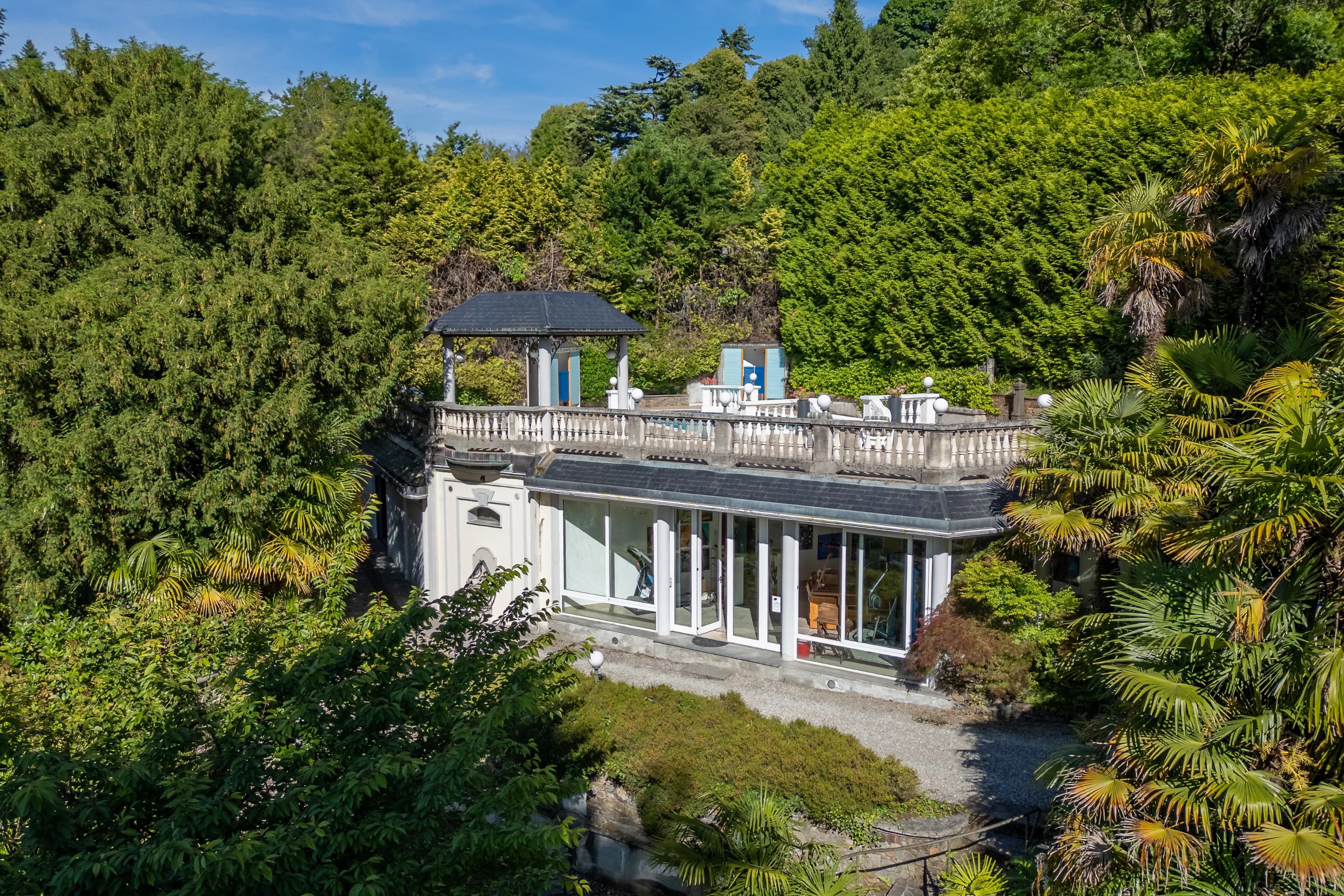 Construite en 1896, cette villa raffinée mêle les éléments du style historiciste tardif à des inspirations Liberty, telles qu’on les retrouve en Italie du Nord à la charnière des XIXe et XXe siècles. Son décor intérieur sobre et ses grandes baies vitrées annoncent déjà l’entrée dans la modernité. Le point fort de la propriété est sans aucun doute sa vue spectaculaire sur le lac Majeur, encadrée par les Alpes.