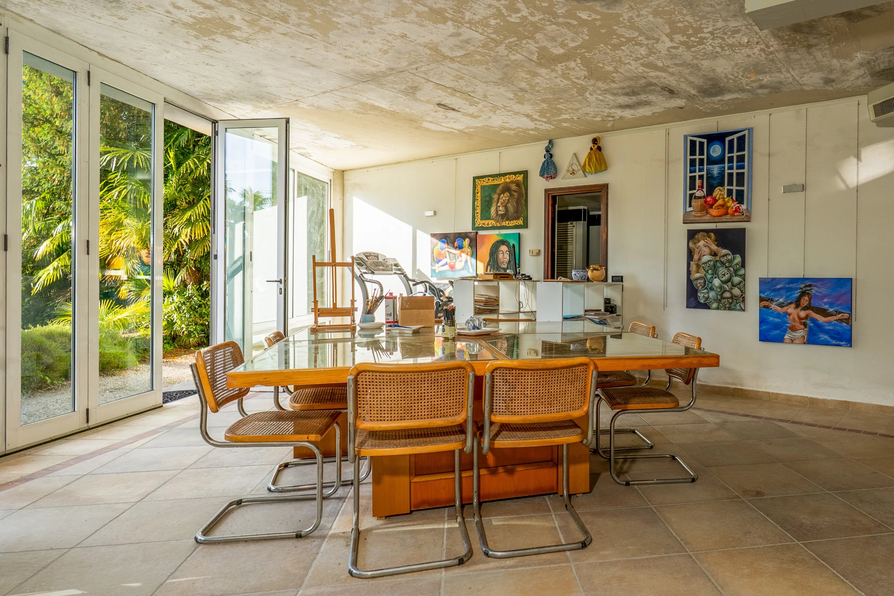 Le sous-sol comprend des salles de bains pour les invités ainsi qu’une cave de 100 m², avec plafonds hauts et pièces spacieuses, idéales pour un usage professionnel. Cet espace s’ouvre sur une grande terrasse. Une galerie, rendue possible par la double hauteur sous plafond, est divisée en trois pièces indépendantes.