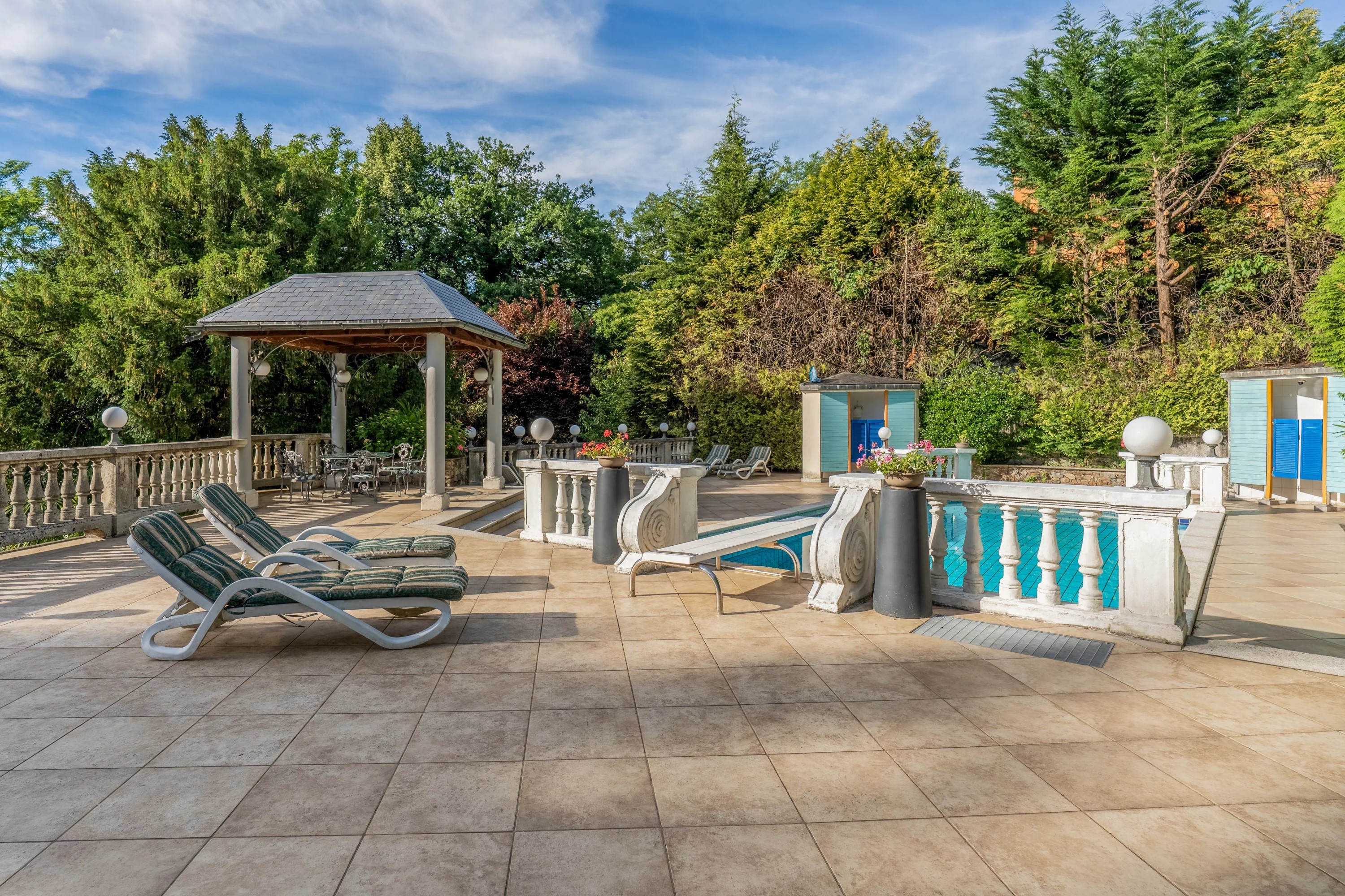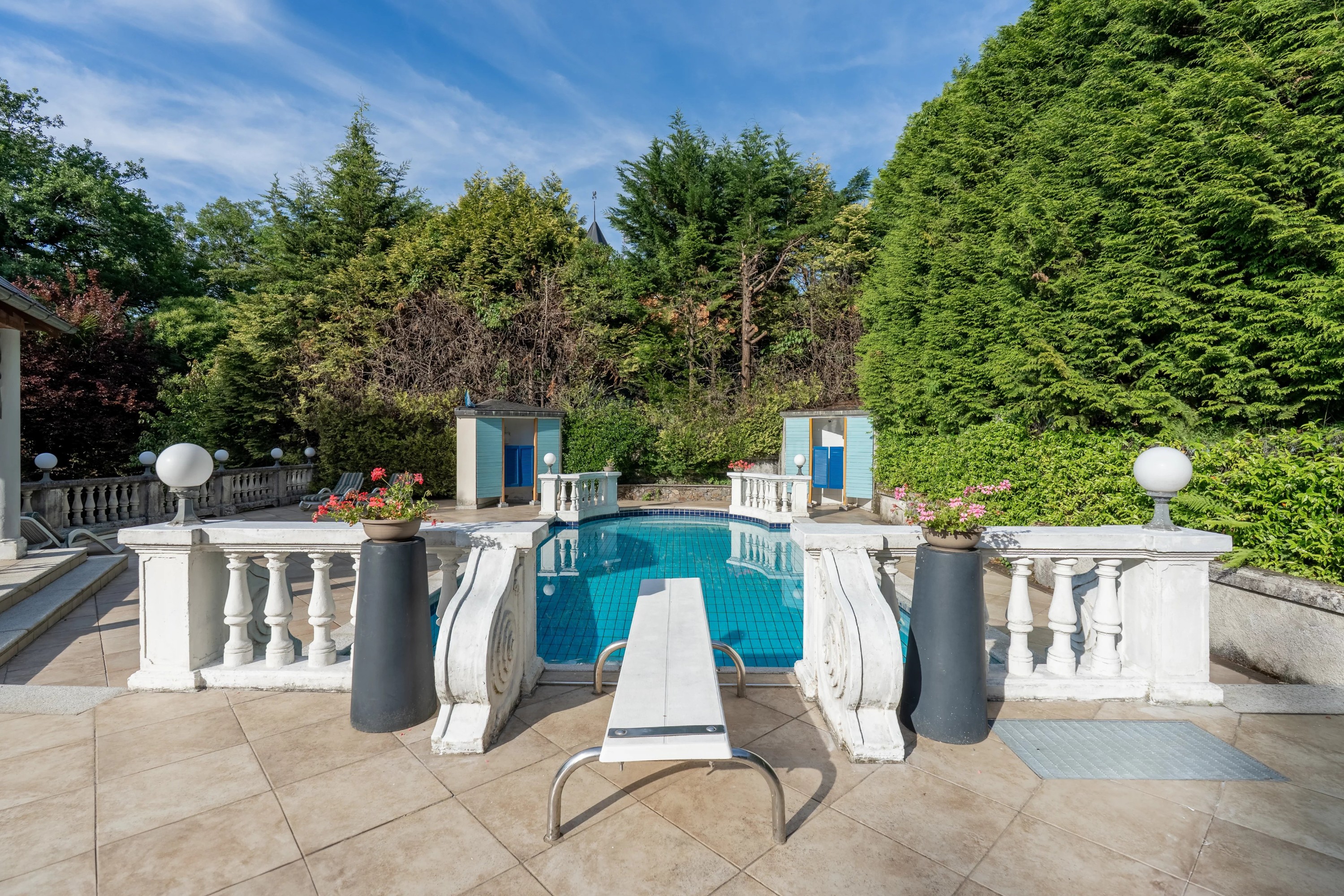 La piscine, située dans la partie haute du parc, est équipée d’un pavillon, d’un vestiaire et d’une douche. Un espace fitness lumineux d’environ 60 m² est également disponible. Le garage de 160 m² peut accueillir jusqu’à quatre véhicules.