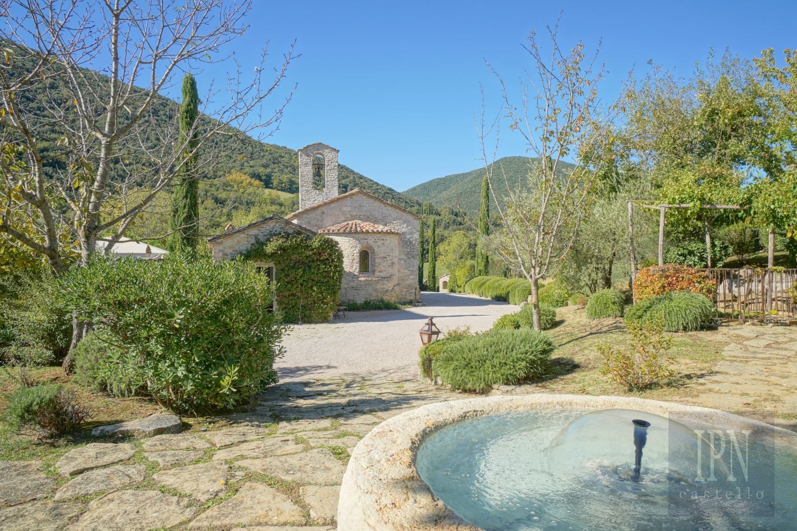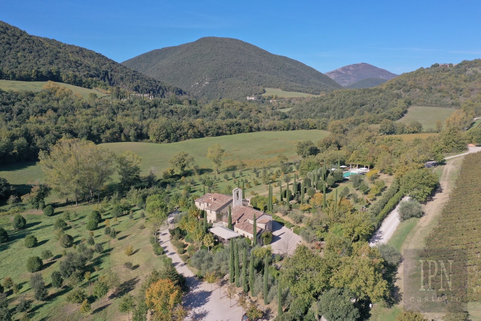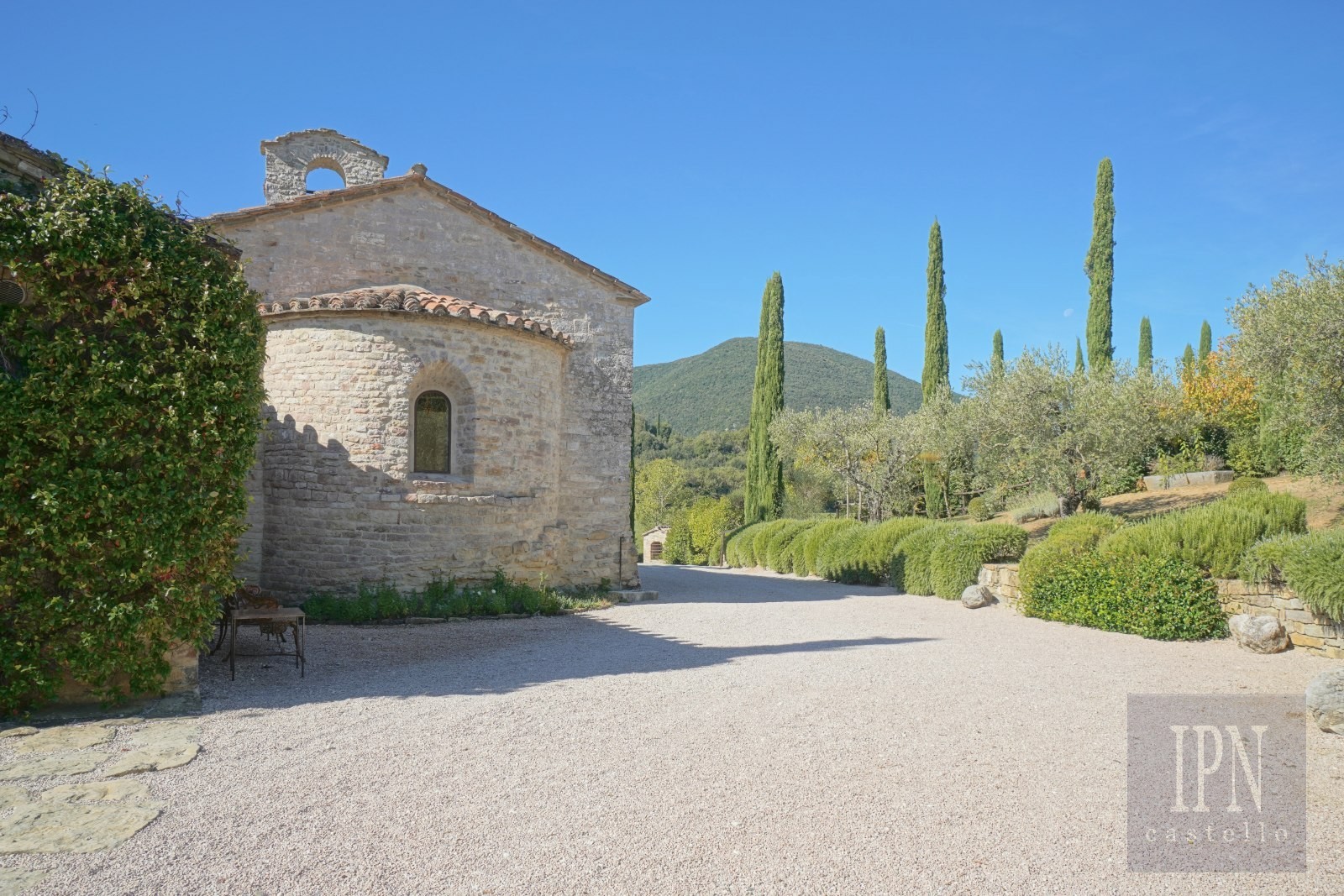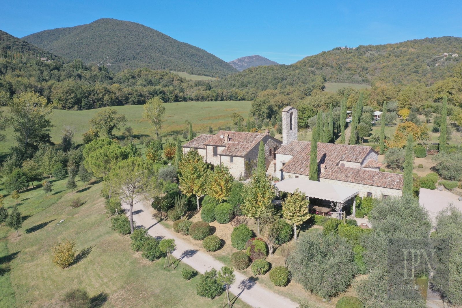 Située dans une vallée calme d’Ombrie, entourée de prairies, de vignobles, d’oliveraies et de forêts, cette propriété combine architecture historique et confort contemporain. Elle comprend une église du XIIIe siècle transformée en espace habitable et une maison de campagne du XVIIIe siècle, toutes deux restaurées selon des standards élevés.