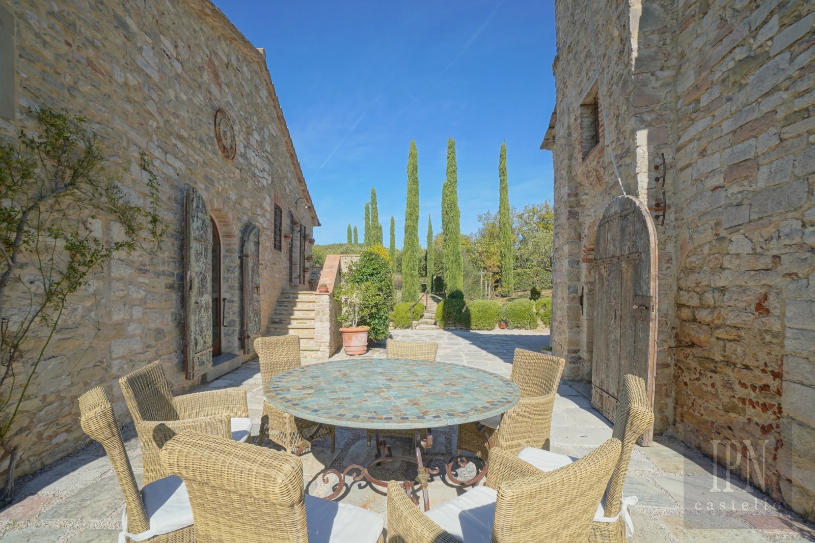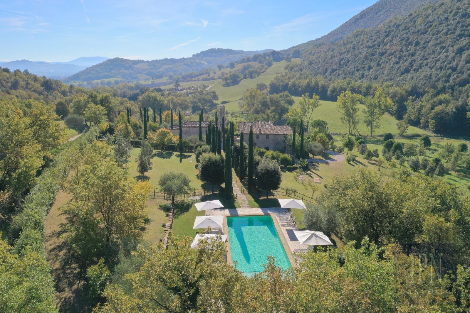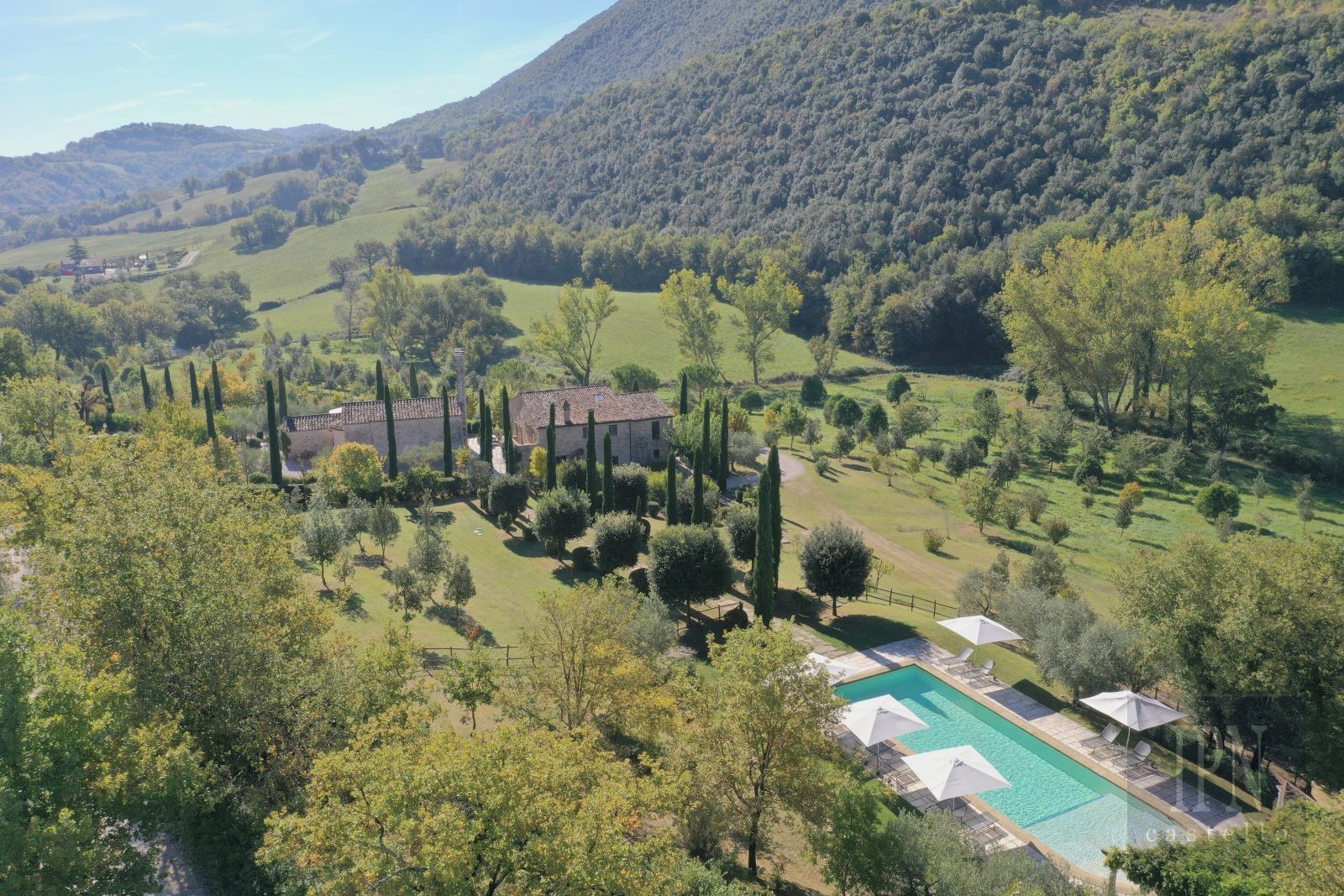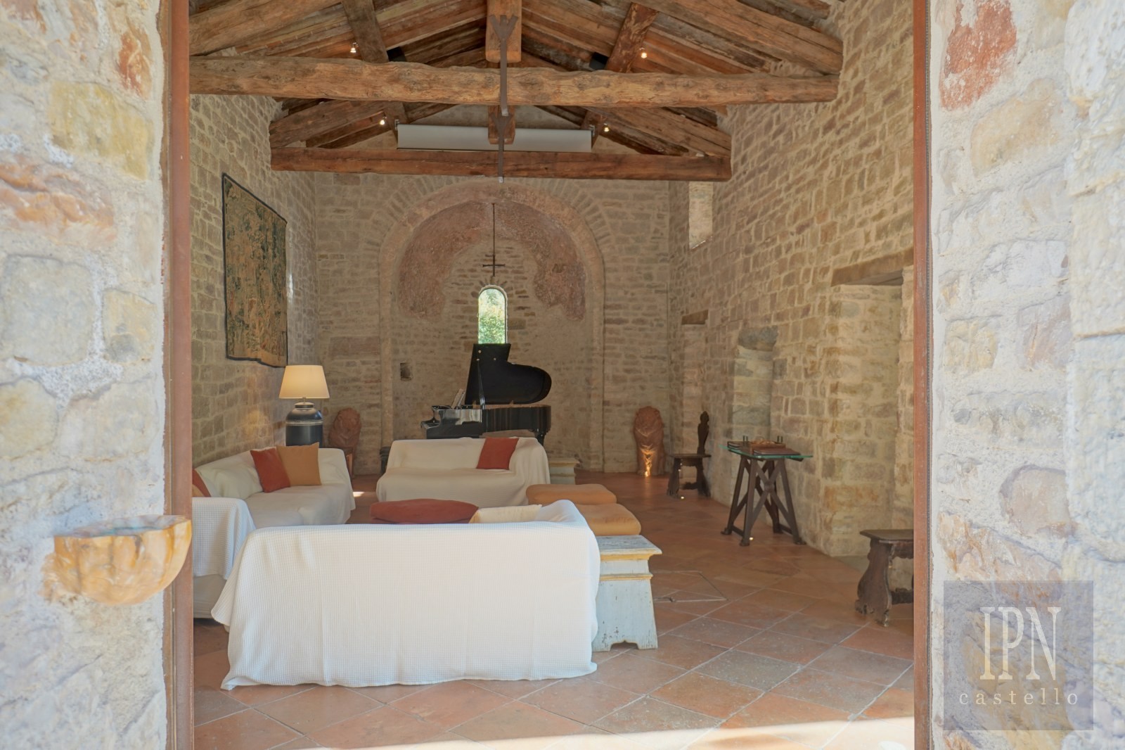 Située dans une vallée calme d’Ombrie, entourée de prairies, de vignobles, d’oliveraies et de forêts, cette propriété combine architecture historique et confort contemporain. Elle comprend une église du XIIIe siècle transformée en espace habitable et une maison de campagne du XVIIIe siècle, toutes deux restaurées selon des standards élevés.
