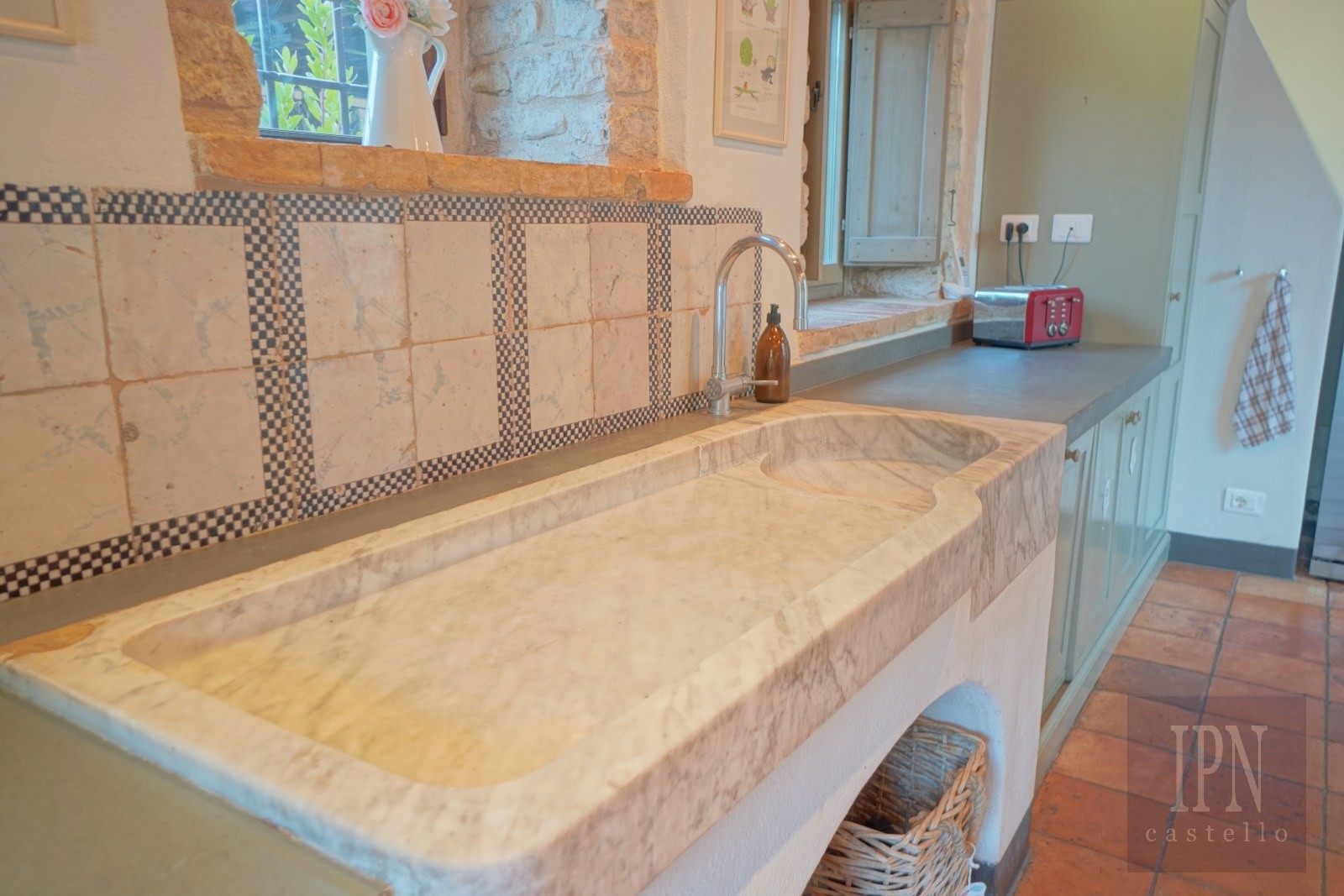 L’église de 134 m² constitue le cœur de la propriété et offre une cuisine équipée, une salle à manger et un vaste séjour principal. Les éléments architecturaux originaux, y compris une petite crypte, ont été conservés. De grandes fenêtres offrent des vues panoramiques sur la campagne ombrienne, créant un espace calme adapté à la détente et à la réception d’invités.