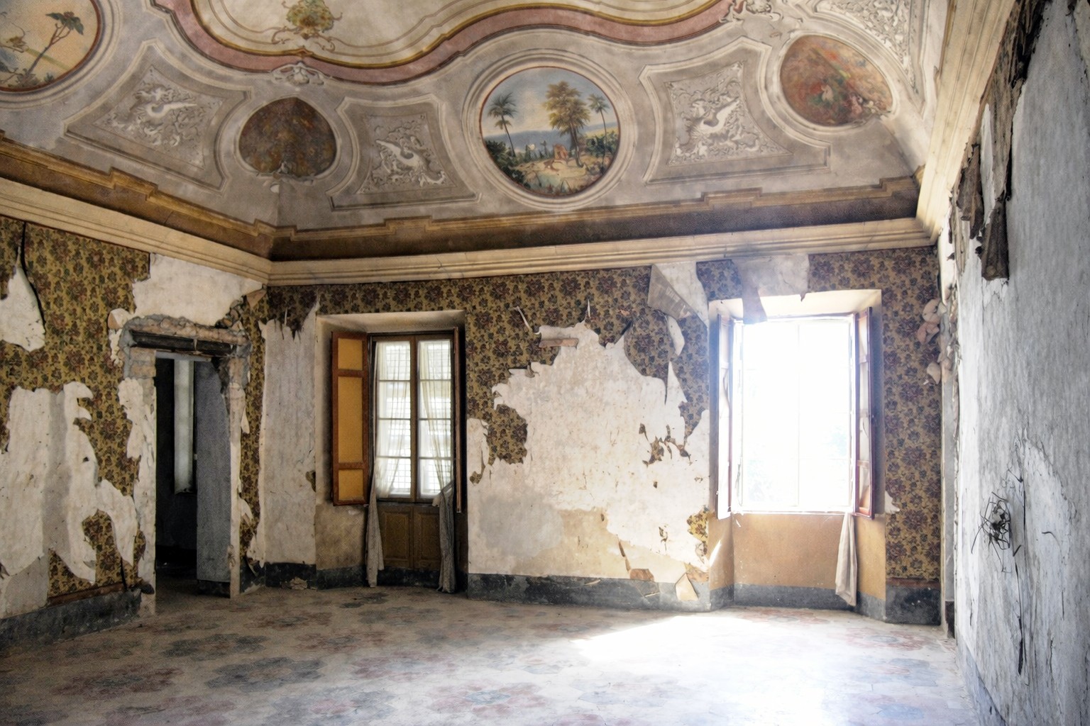 Au premier étage se trouve un somptueux salon de réception décoré de fresques, flanqué de cinq chambres et d’une salle de bain.