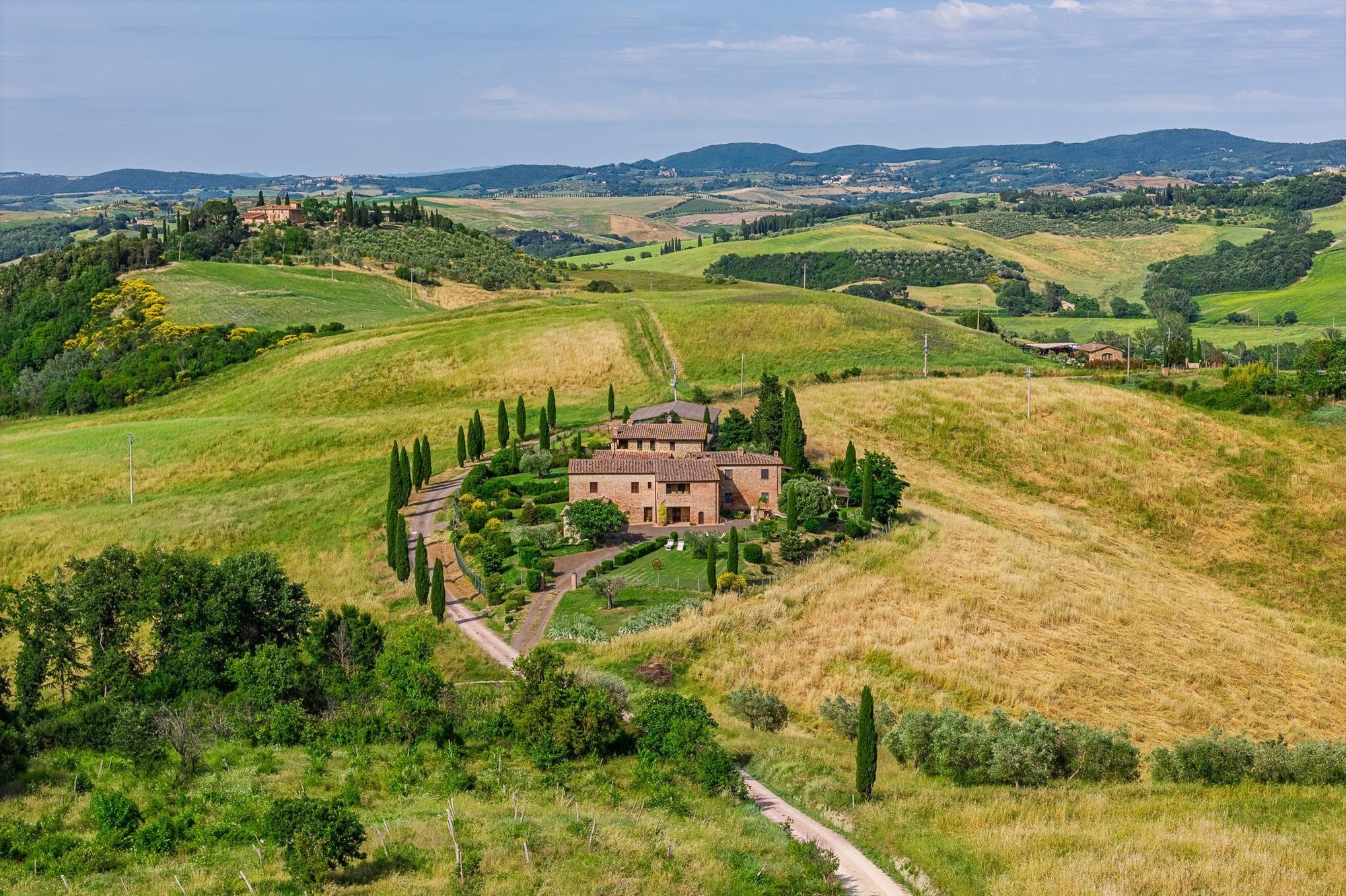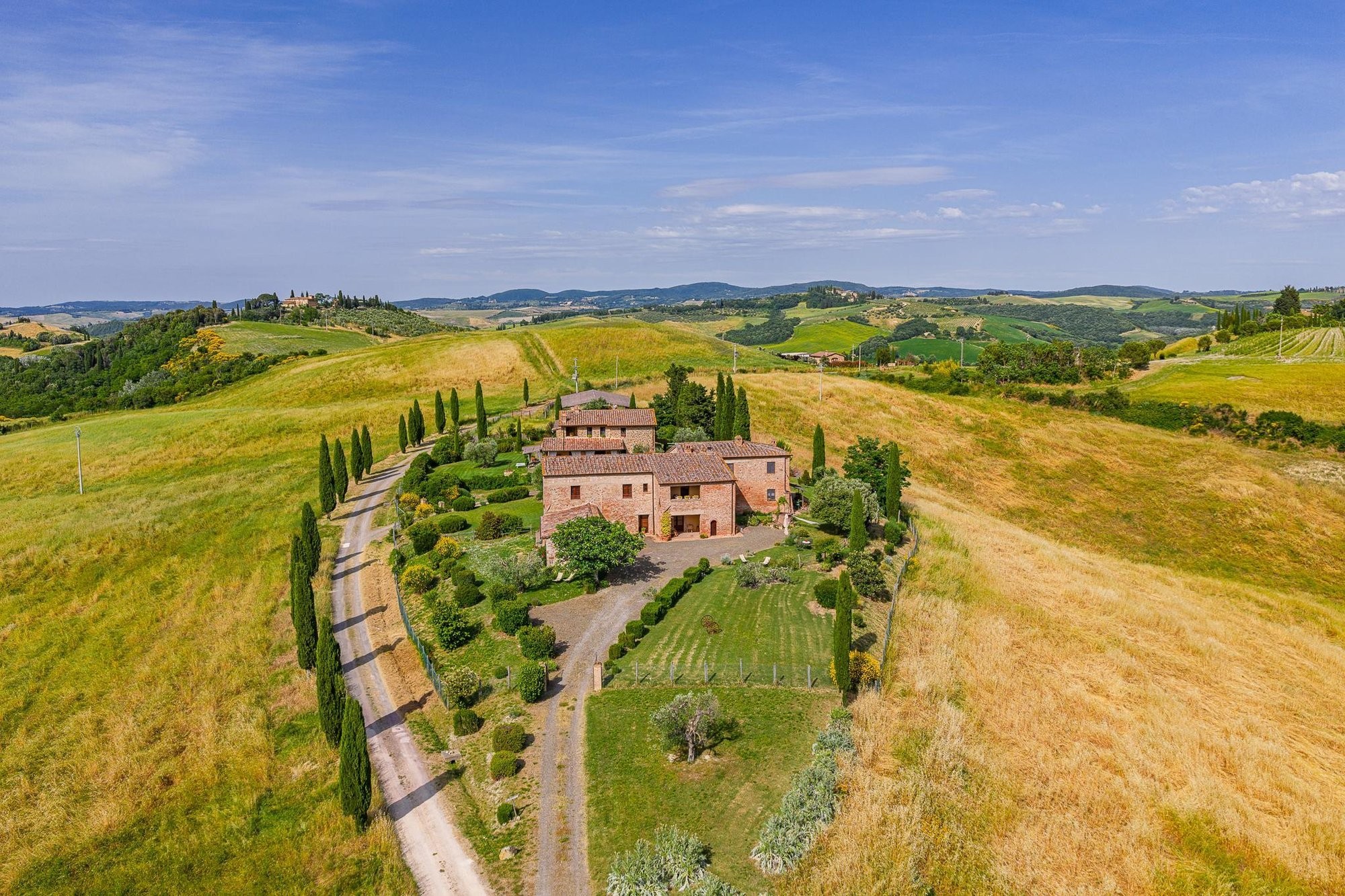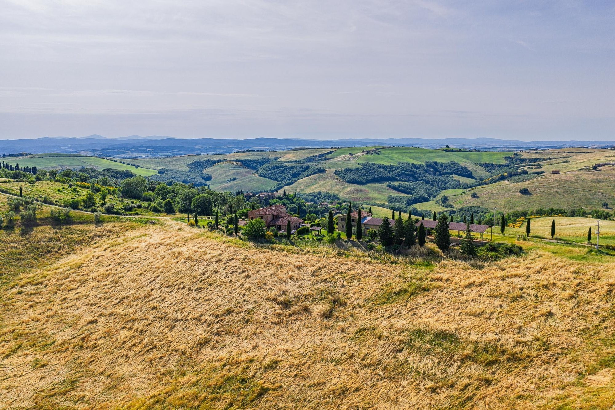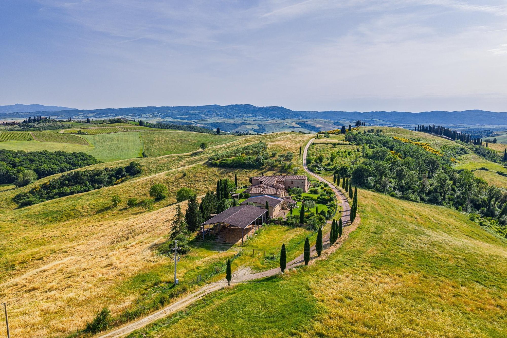 Entre les rangées de vignes du Brunello et les collines d’oliviers et de cyprès, cette propriété de 40 hectares se déploie sur un promontoire naturel dominant le Val d'Orcia. Depuis la maison principale, le regard porte sur les tours médiévales de Sienne, l’abbaye de Sant’Anna in Camprena et, par temps clair, sur les clochers gothiques de Pienza.