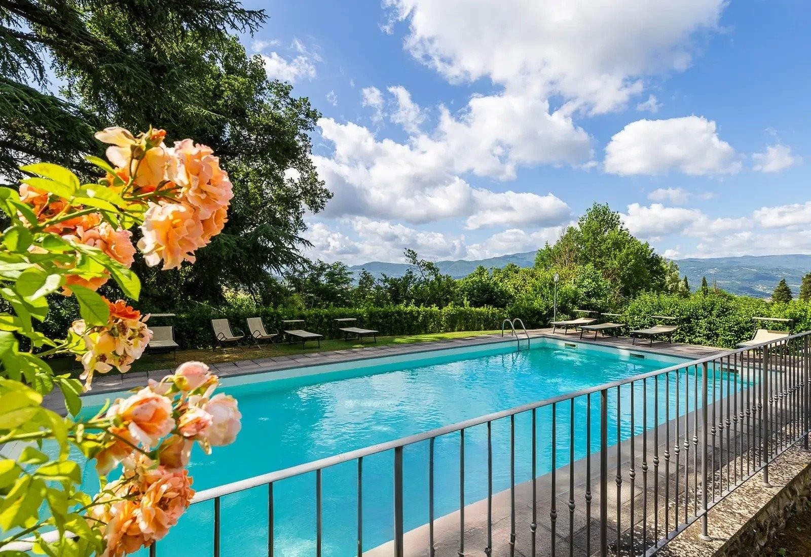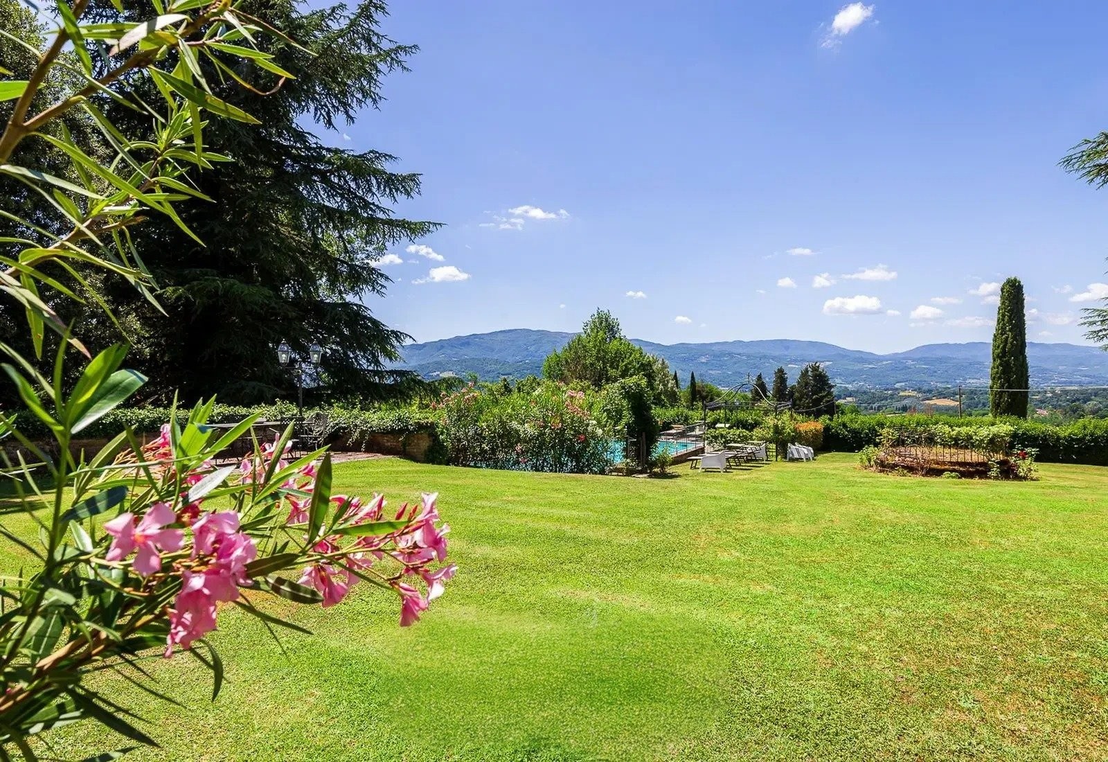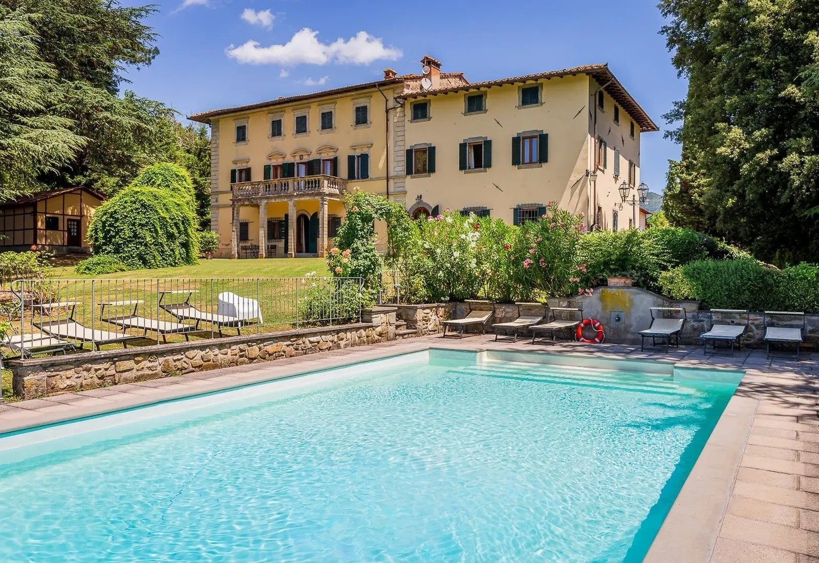 Les 12 hectares du terrain englobent des vignobles, des oliveraies et des bois, adaptés à la production de vin ou d’huile d’olive. Les jardins arborés, la piscine avec vue sur les environs et les terrasses pour repas en plein air complètent ce bien.