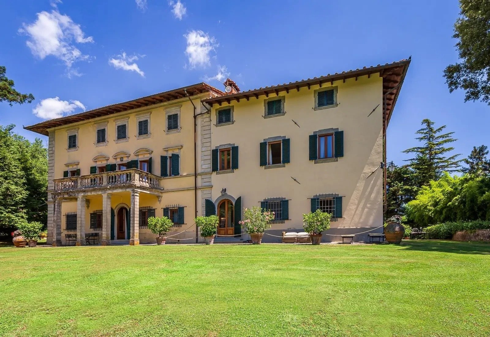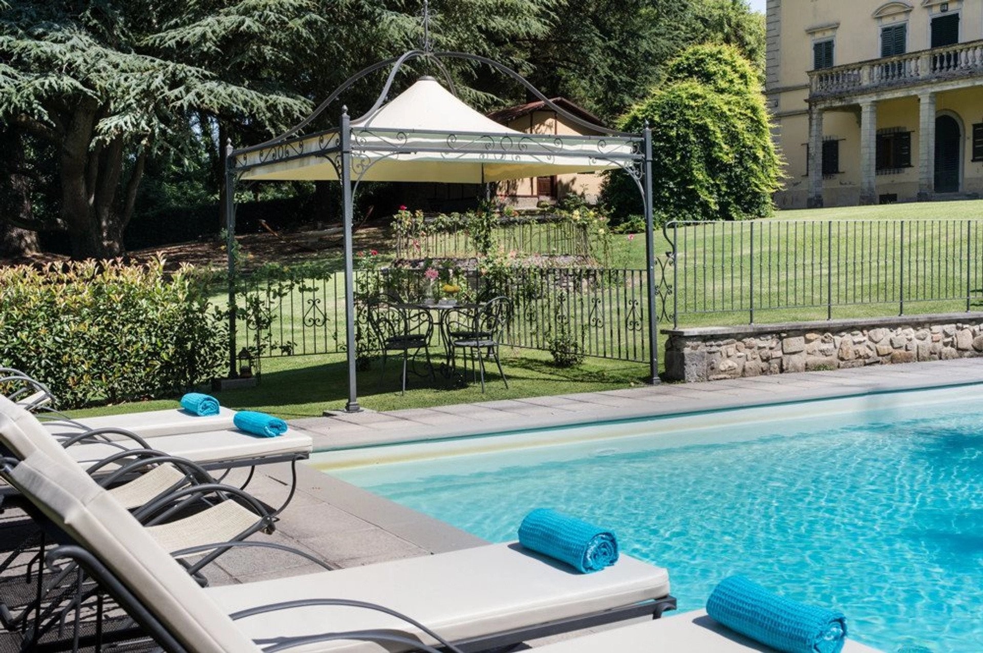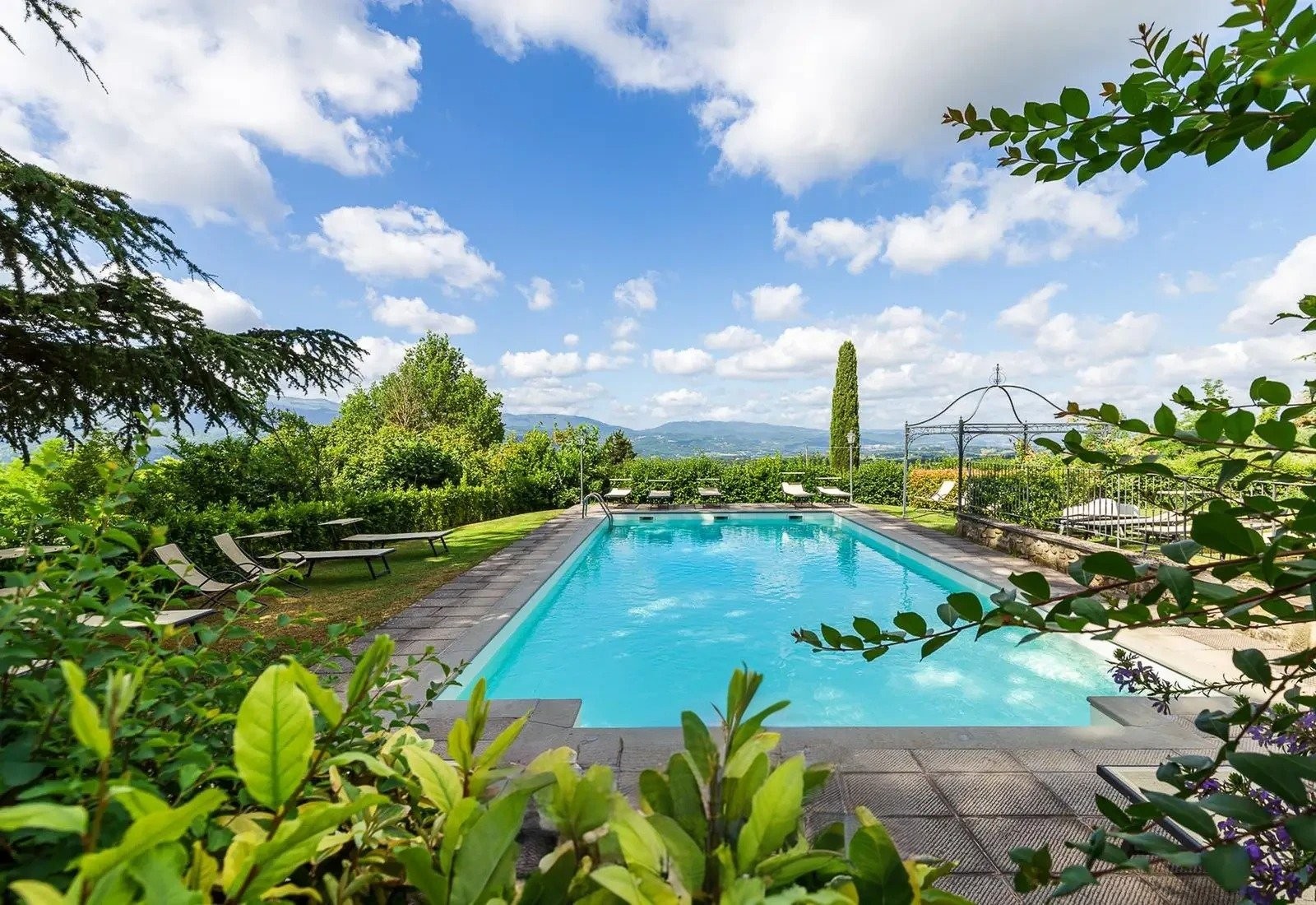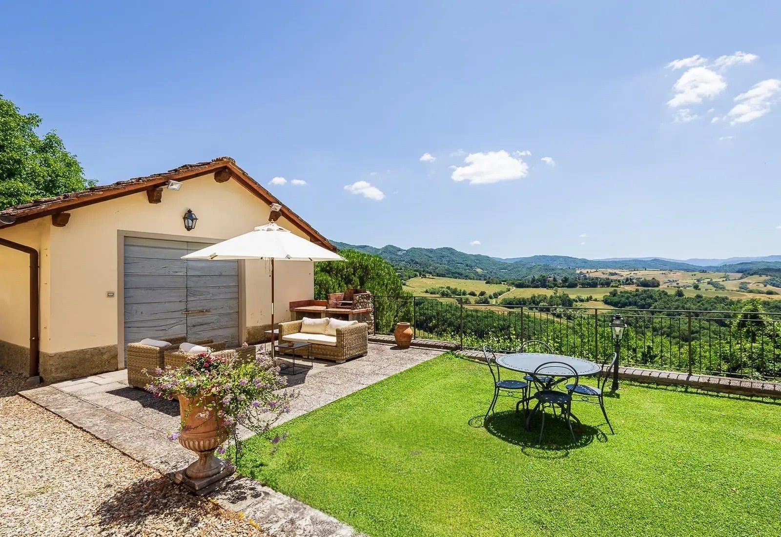 Les 12 hectares du terrain englobent des vignobles, des oliveraies et des bois, adaptés à la production de vin ou d’huile d’olive. Les jardins arborés, la piscine avec vue sur les environs et les terrasses pour repas en plein air complètent ce bien.