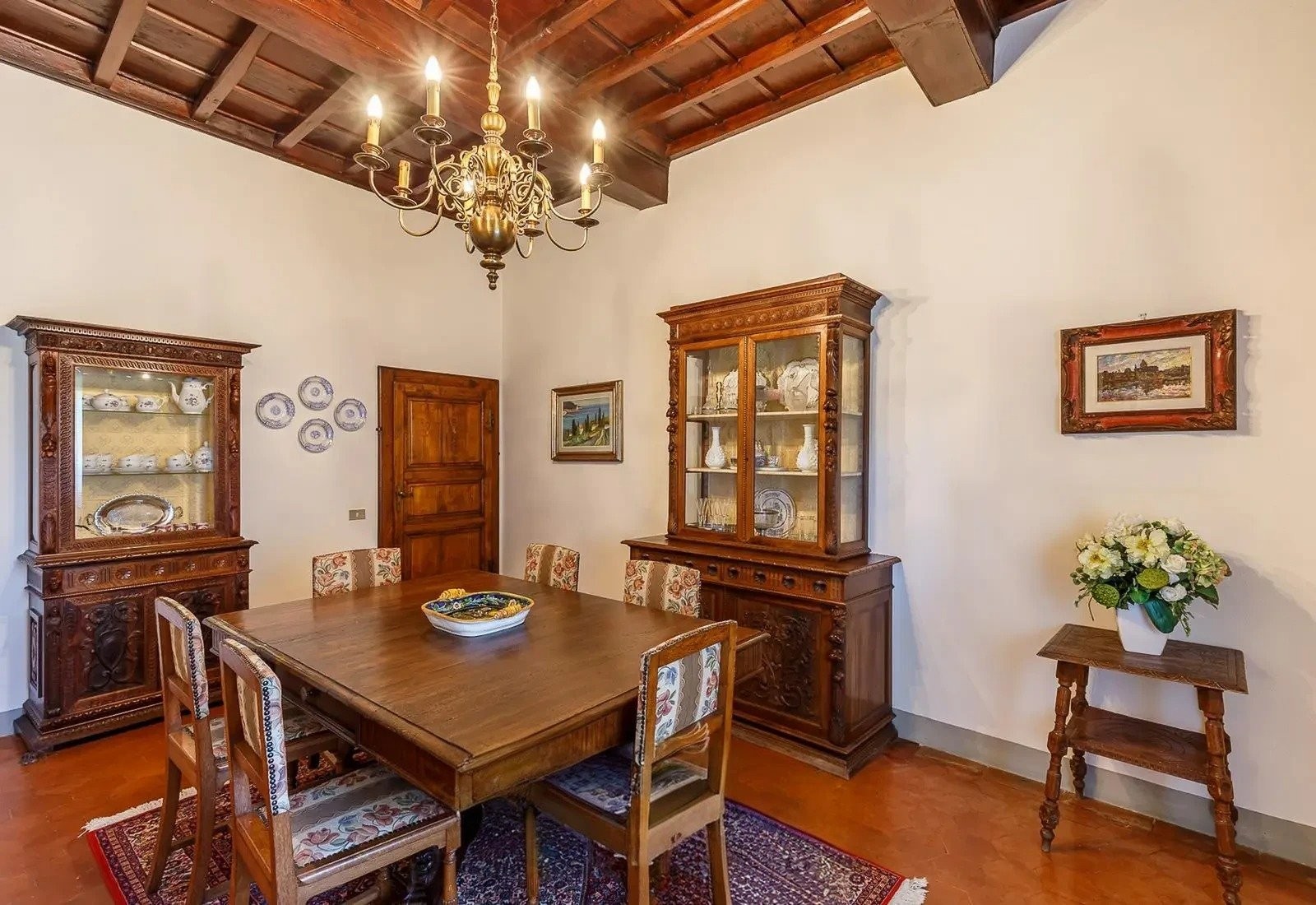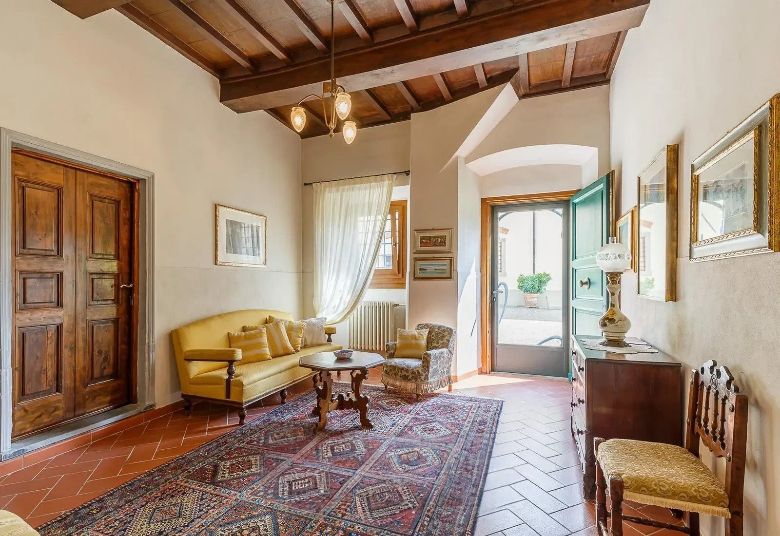 Le bâtiment principal date du XVIIe siècle et couvre environ 730 mètres carrés. Il conserve des plafonds à caissons originaux et des sols en graniglia, alliant caractère historique et usage moderne. Il comprend deux étages ainsi qu’une cave de 200 mètres carrés adaptée au stockage de vin ou à d’autres usages.