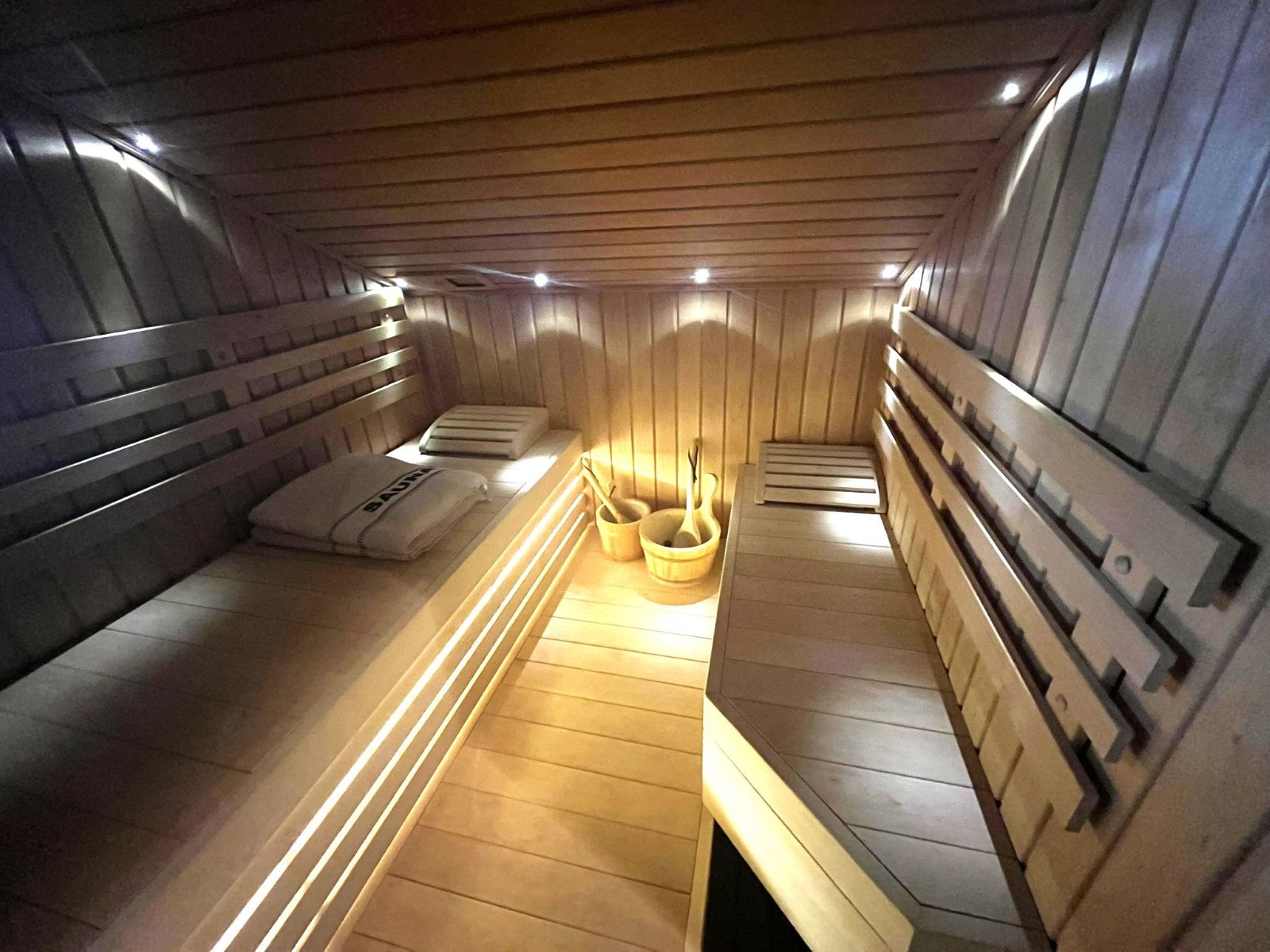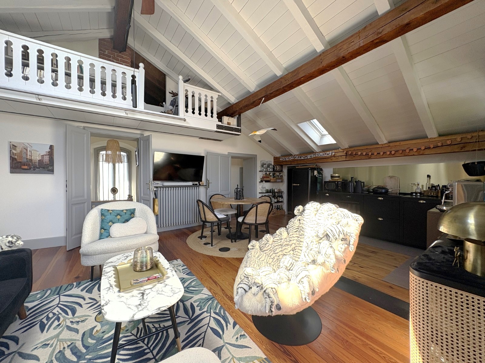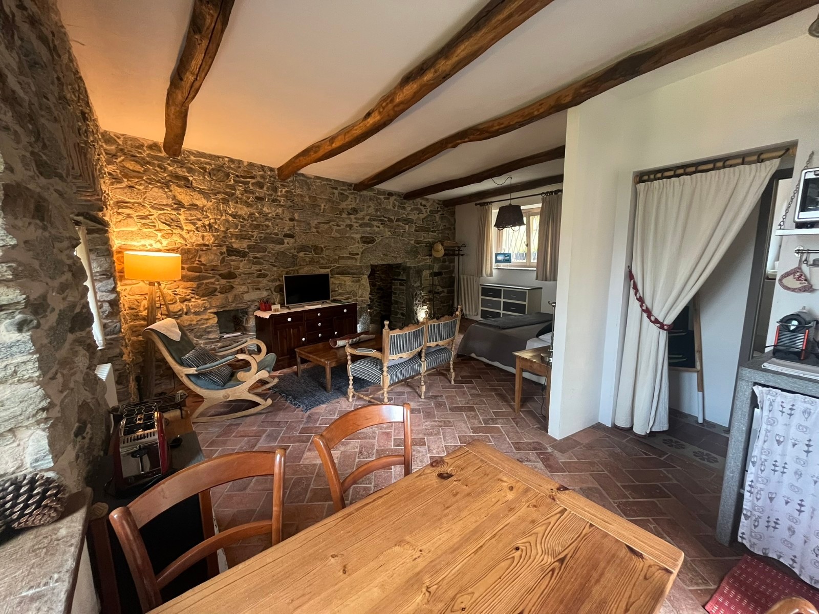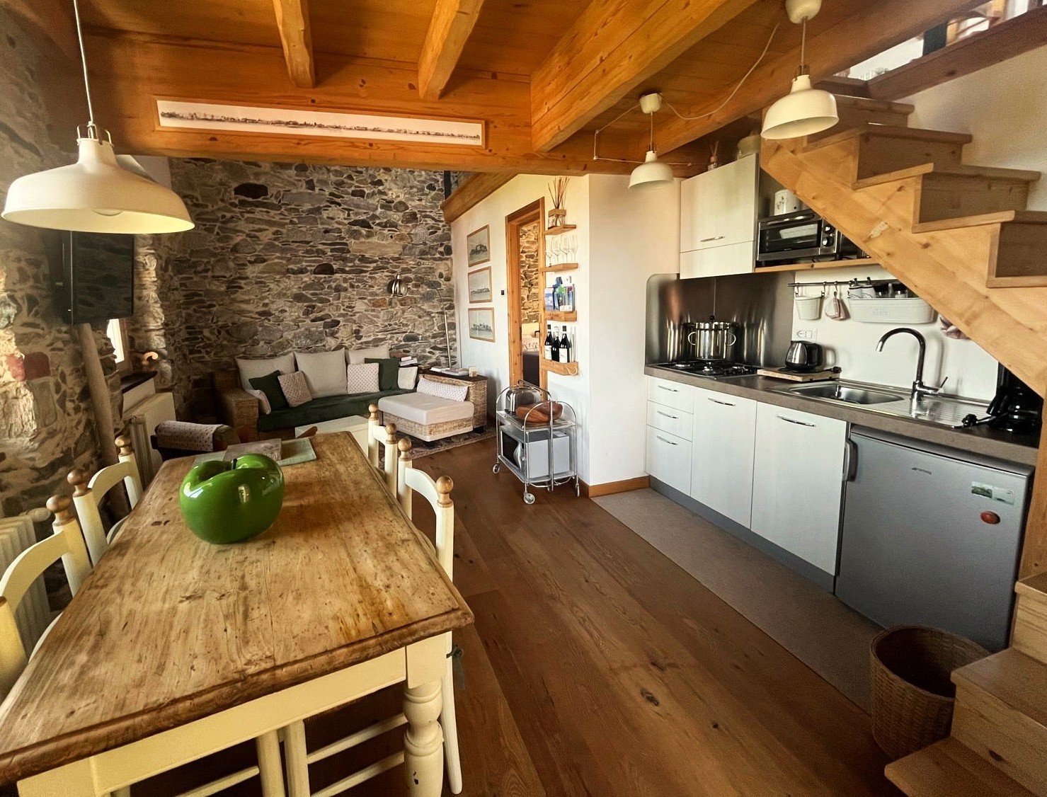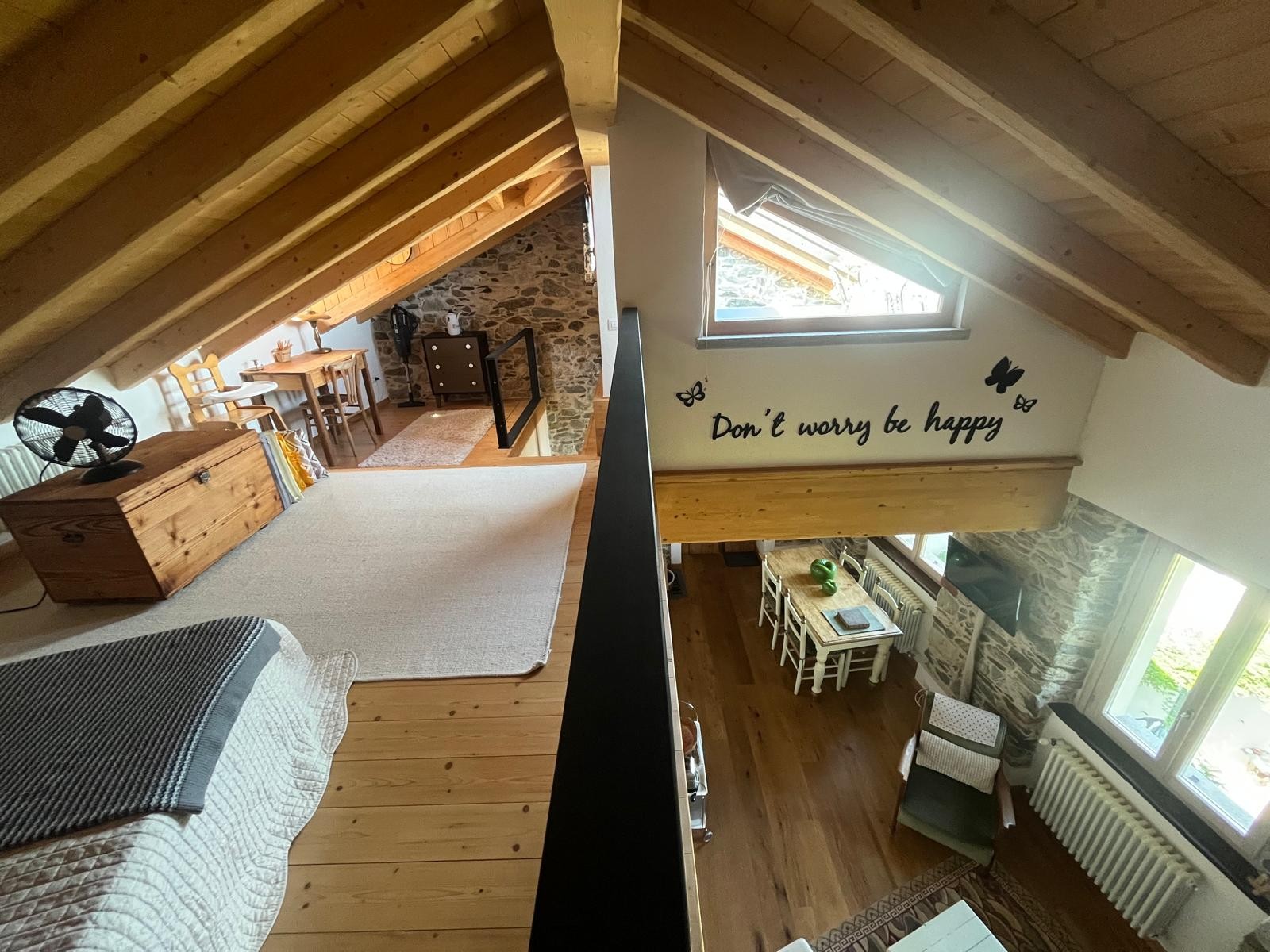 Appartement indépendant avec poutres apparentes, balcon avec vue sur le lac, espace ouvert salon/salle à manger avec cuisine, deux chambres, salle de bain, sauna privé et espace supplémentaire.