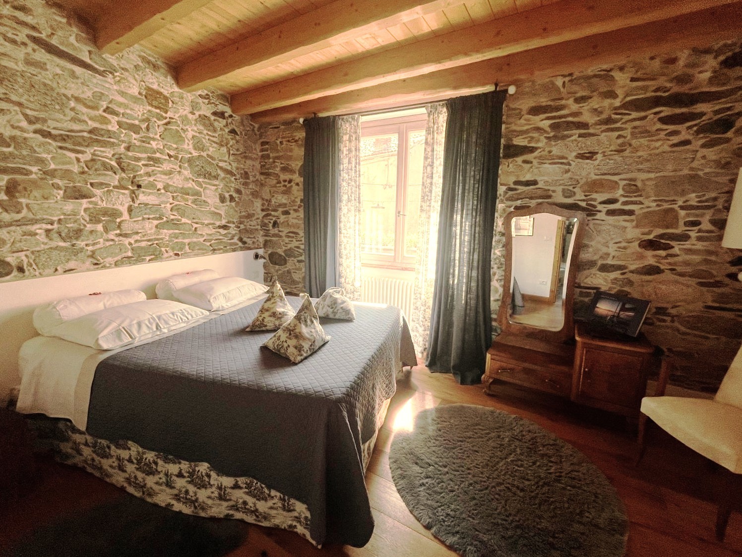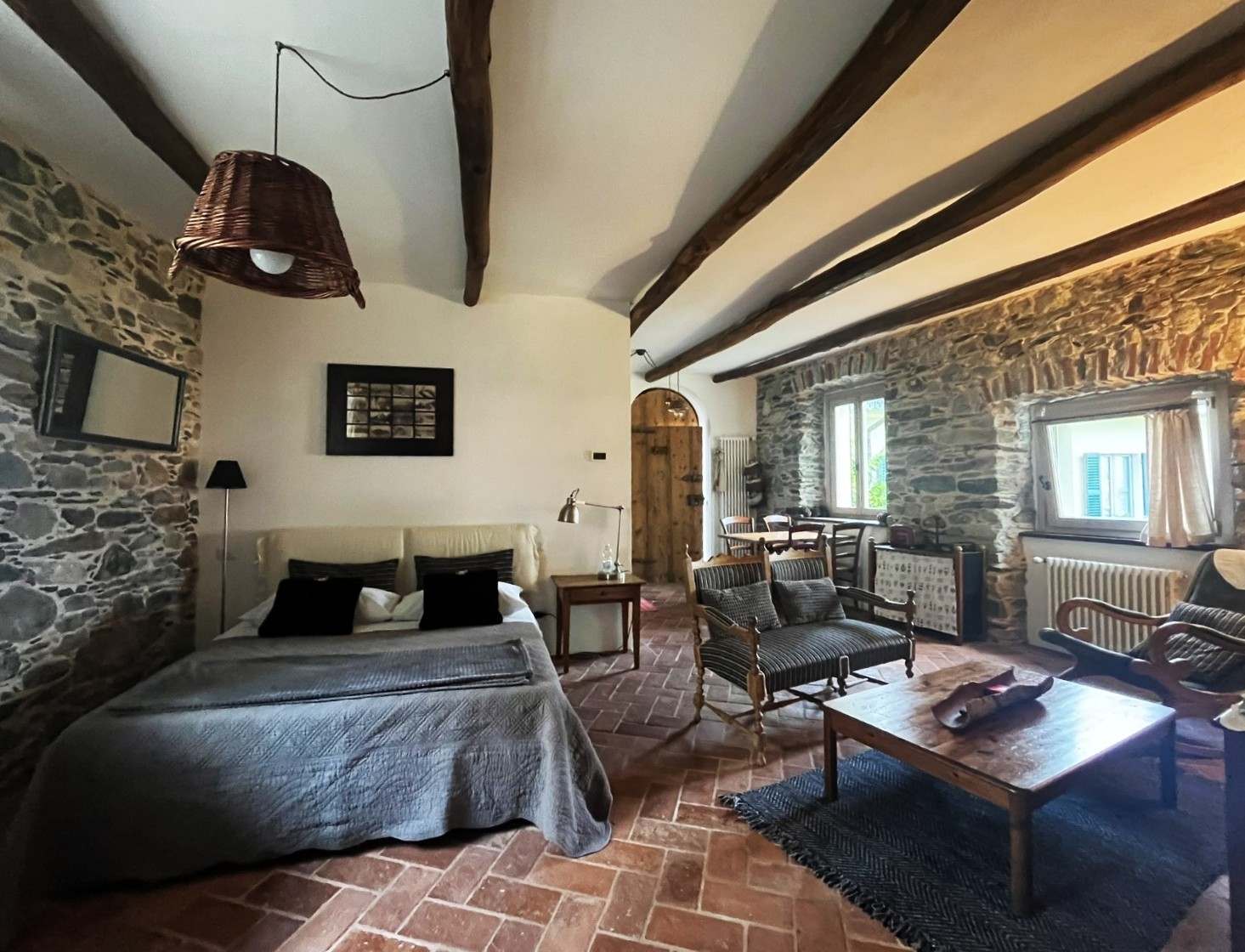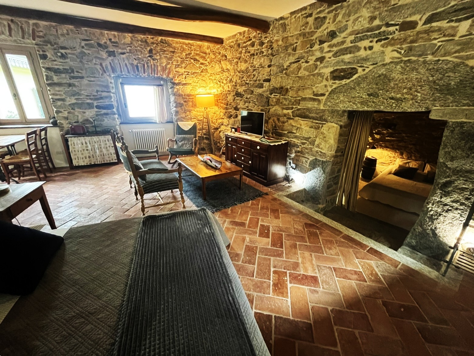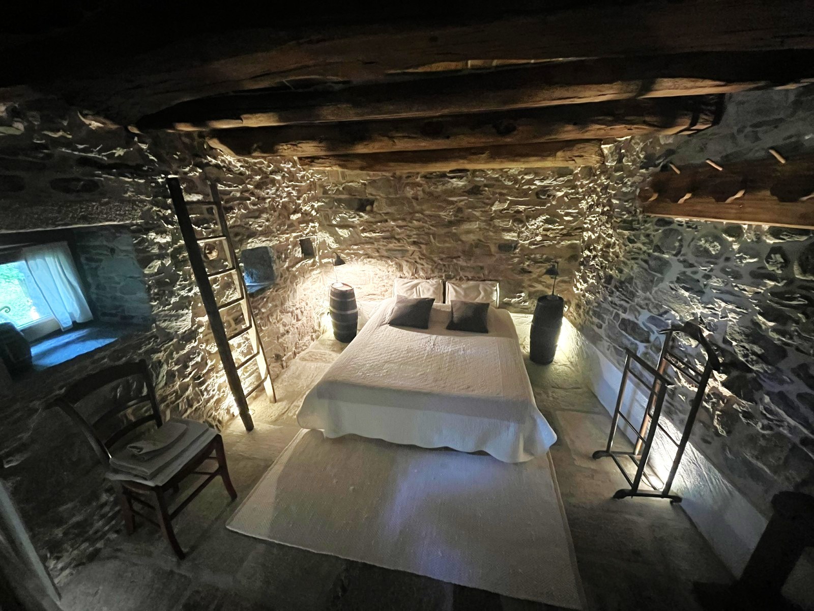 Deux unités – rez-de-chaussée : studio avec salle de bain et grotte naturelle ; étage : loft avec murs en pierre, salon, cuisine, chambre, salle de bain, galerie et terrasse panoramique avec vue sur le lac.