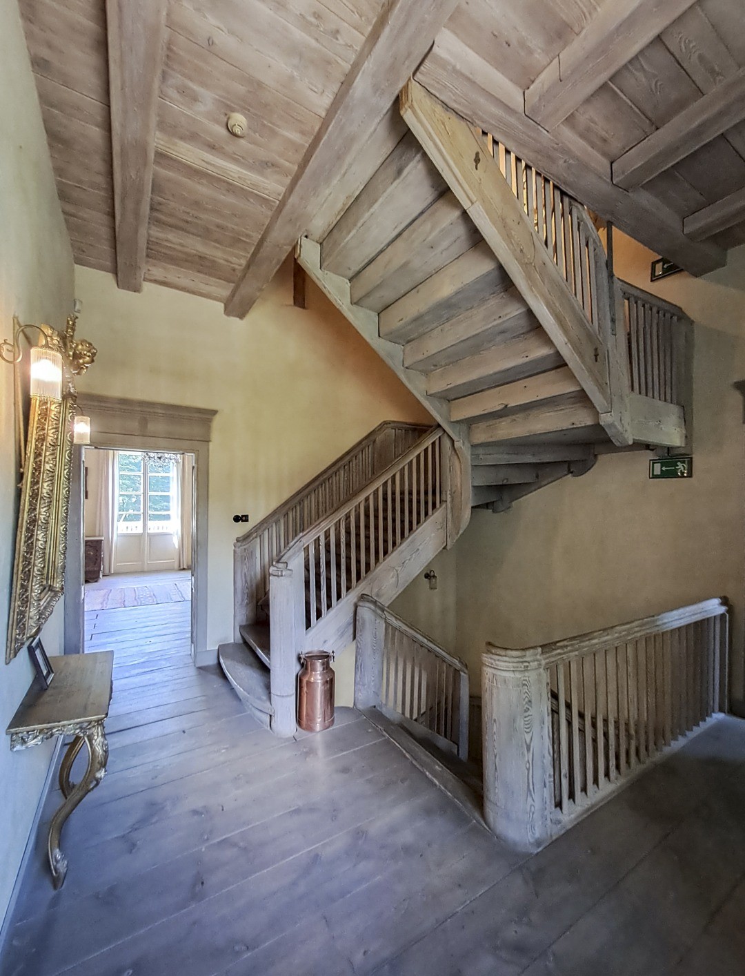 Au premier étage, se trouve l'ancien salon de bal avec une cheminée ouverte et un balcon. Les plafonds en stuc d'origine du manoir n'ont pas été reconstruits ; au lieu de cela, les poutres en bois apparentes ont été laissées en place.