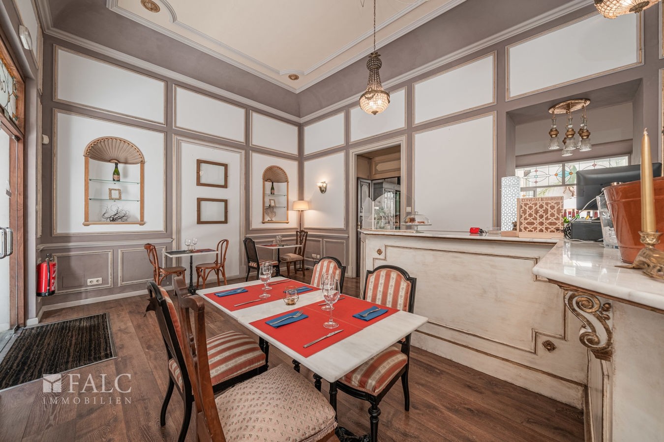 Le rez-de-chaussée est divisé en deux espaces : d’un côté, un café avec salle à manger, toilettes pour les invités et accès à une terrasse dans la cour. De l’autre côté, on trouve un hall d’entrée traditionnel, des sols en pierre anciens, un escalier courbe et un espace de rangement.