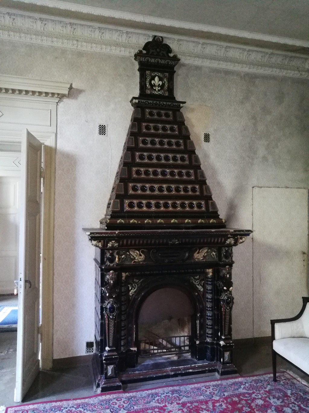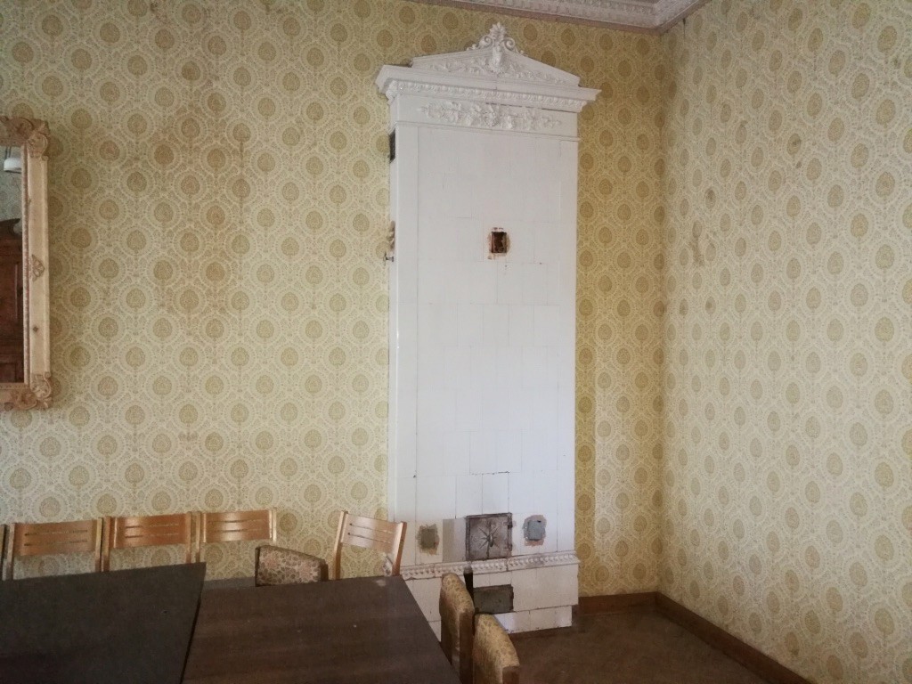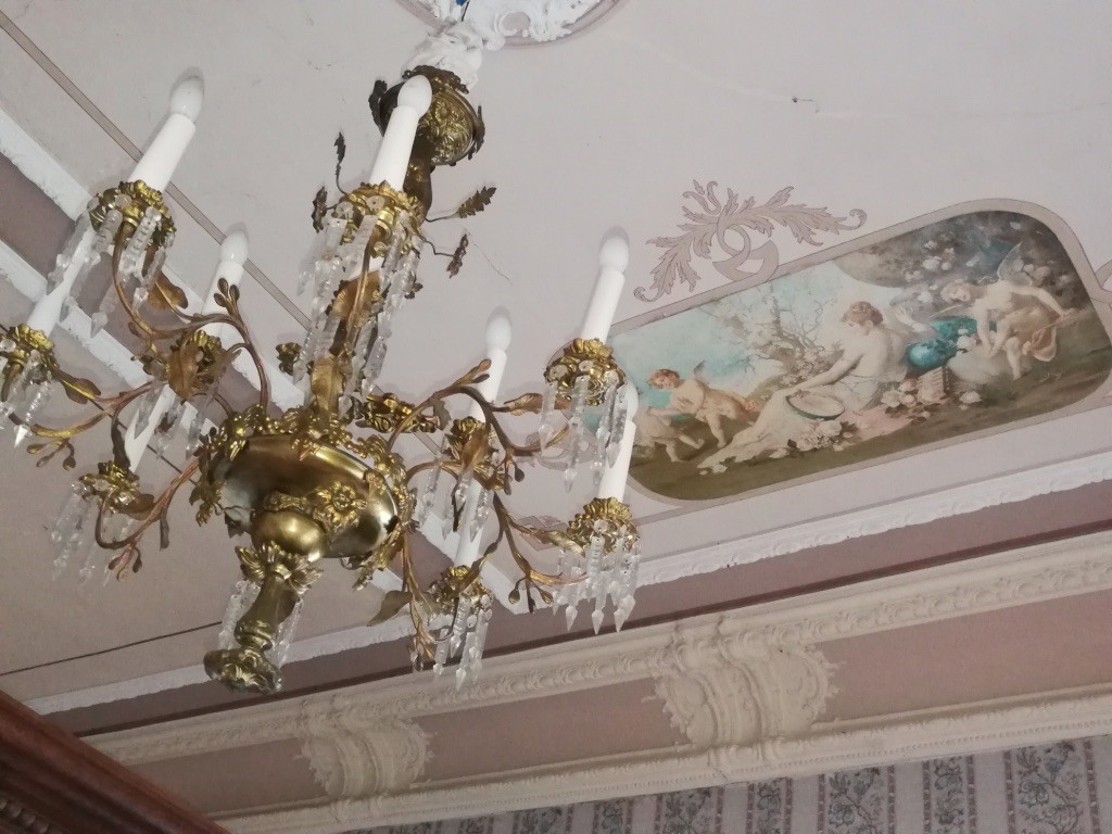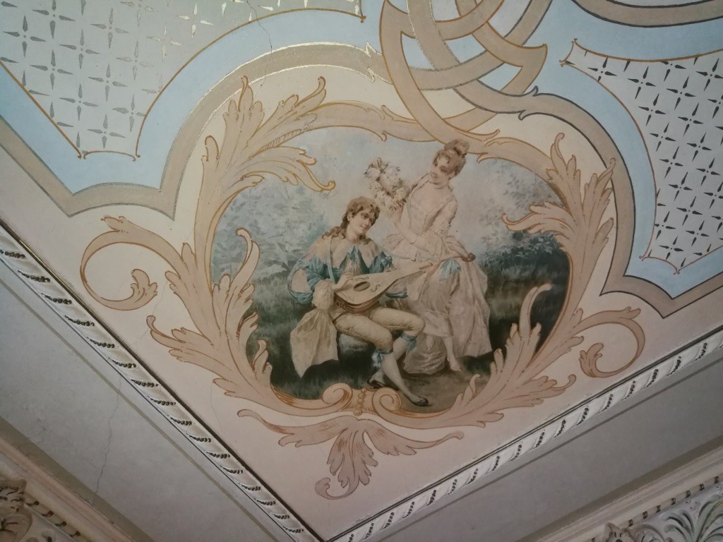L'intérieur de la maison est encore remarquable aujourd'hui, probablement en raison de la première restauration effectuée dans les années 1980. Des peintures murales et des peintures de plafond néobaroques alternent avec des céramiques de majolique sur les murs et des cheminées ornées et des poêles majestueux.