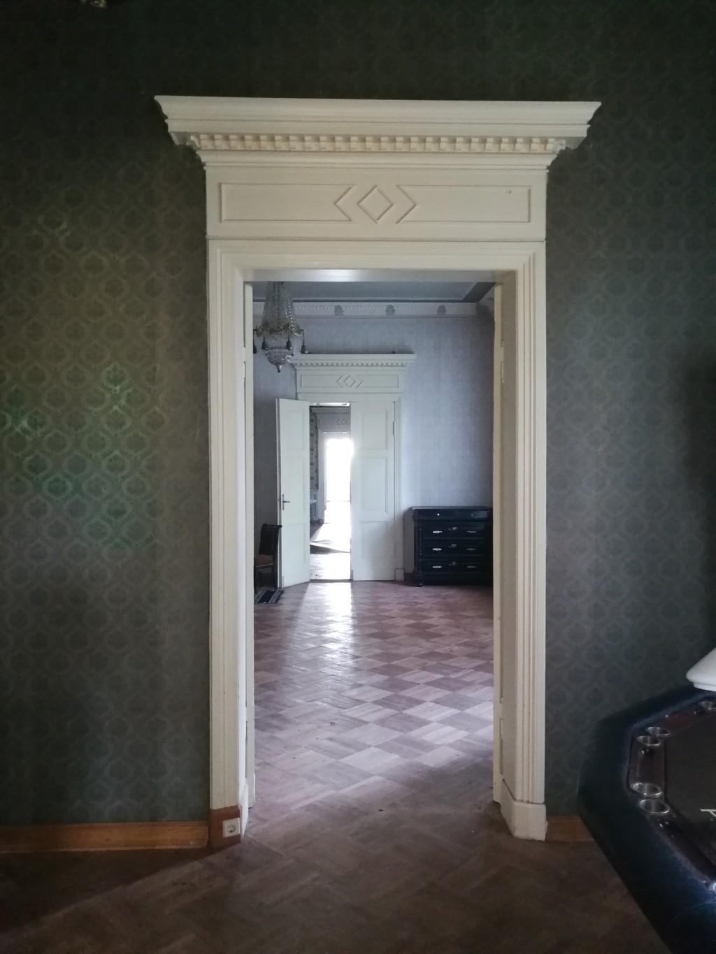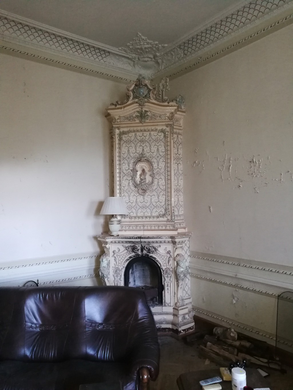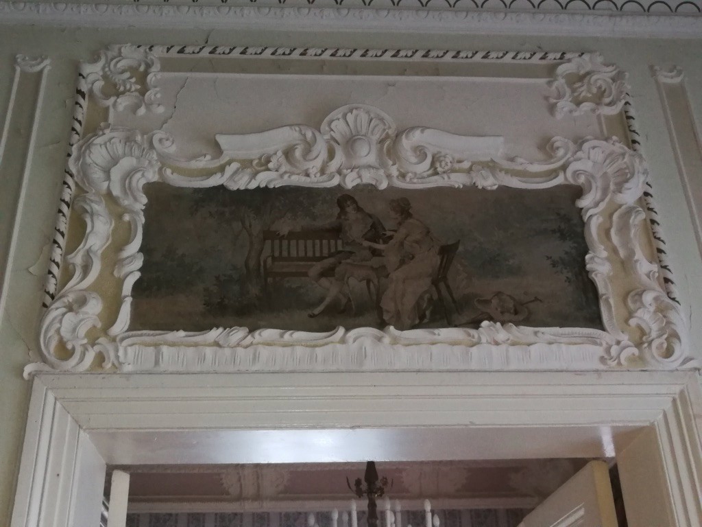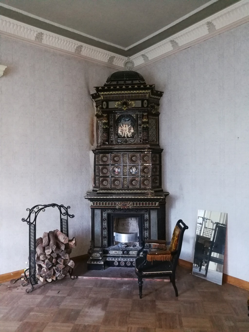 L'intérieur de la maison est encore remarquable aujourd'hui, probablement en raison de la première restauration effectuée dans les années 1980. Des peintures murales et des peintures de plafond néobaroques alternent avec des céramiques de majolique sur les murs et des cheminées ornées et des poêles majestueux.