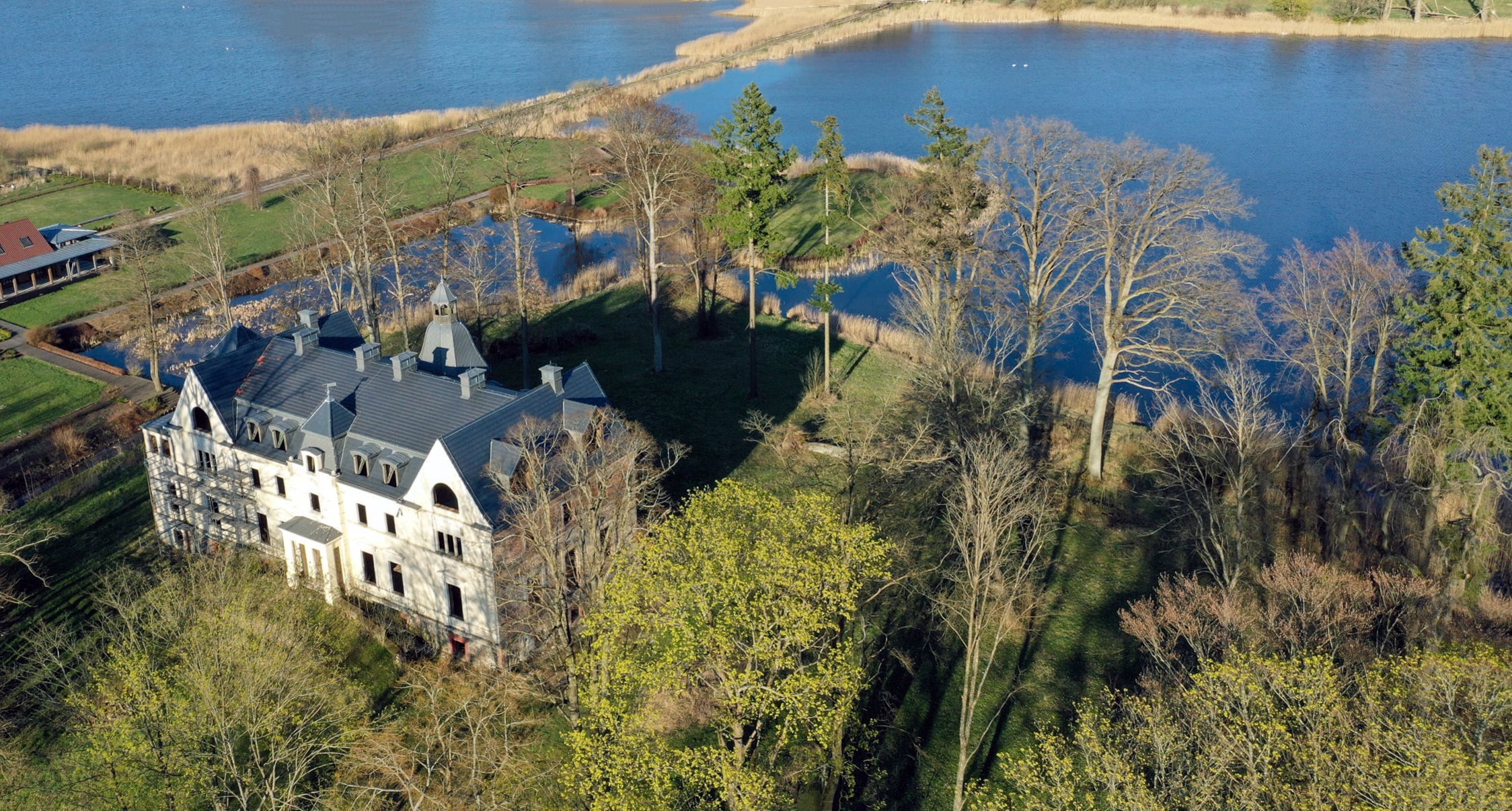 Reconstruit en 2015 - actuellement encore en état de gros œuvre mais avec diverses connections - sur un terrain historique de 4 hectares de parc + domaine sur un terrain de 3 hectares. Le toit est recouvert de tuiles "queue de castor" et de feuilles de zinc et de titane. Les murs ont été reconstruits avec des briques rouges. La reconstruction a été conçue pour permettre des utilisations variées. Nouveau toit, nouveaux plafonds, escalier, sous-sol, rez-de-chaussée et premier étage, murs de séparation partiellement construits. Hauts sous-sols sous tout le château avec de belles voûtes. Au rez-de-chaussée, il y a des pièces avec vue sur le lac. Le premier étage et le grenier ont accès à la tour. Le travail a été réalisé selon les directives de l'office de protection des monuments. Le parc historique de style anglais est séparé du château par une rivière qui se jette dans le lac. Il remonte au début du XIXe siècle et présente un mur d'enceinte en pierre et un riche stock d'arbres, dont des pruches du Canada, des tilleuls argentés, des hêtres rouges et des tilleuls d'hiver. Un pont relie les deux parties. Superficie construite env. 500 m², surface utilisable env. 1800 m². Vue sur le lac depuis le château, le terrain du parc s'étend jusqu'au rivage sur environ 260 mètres.