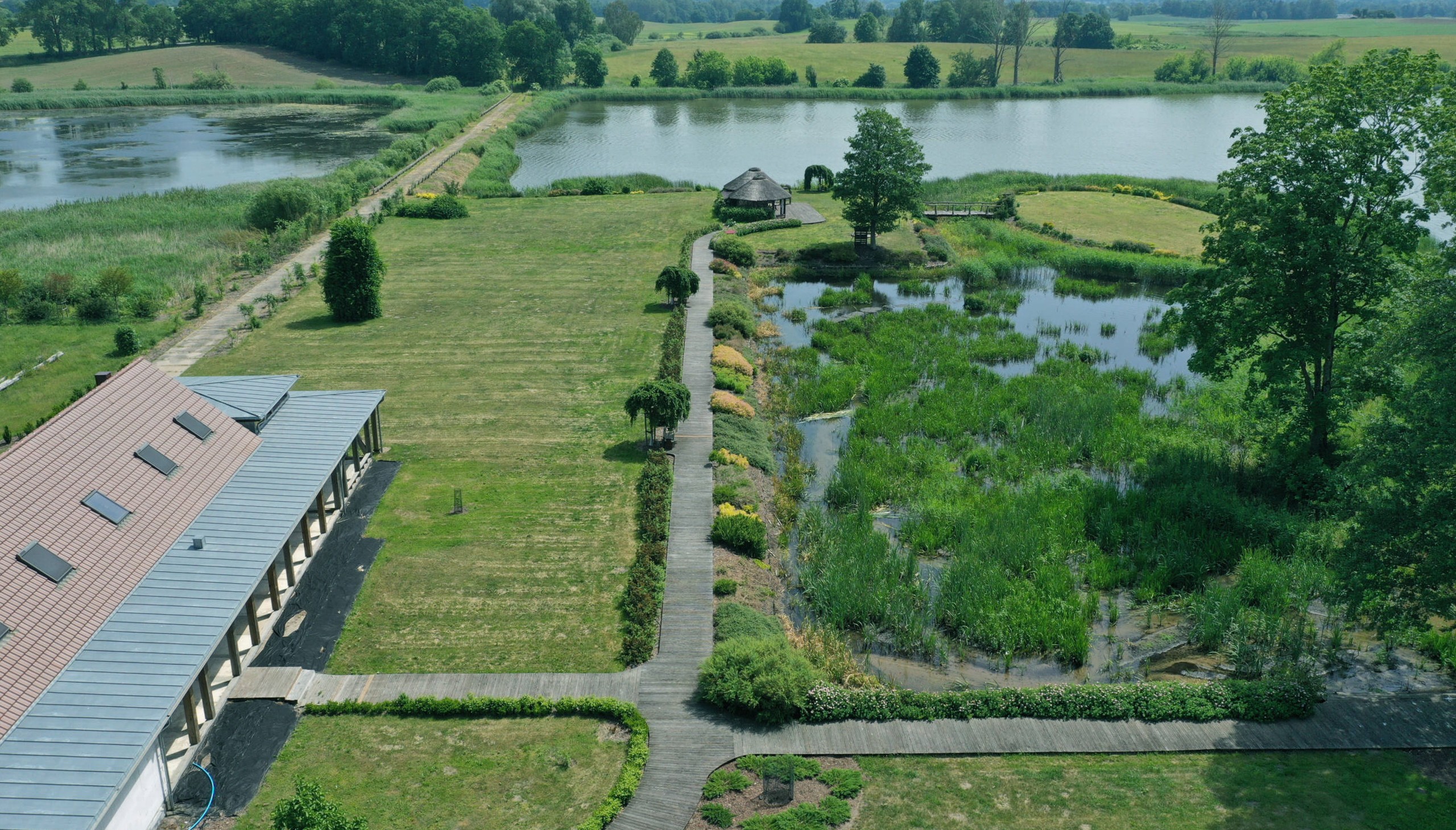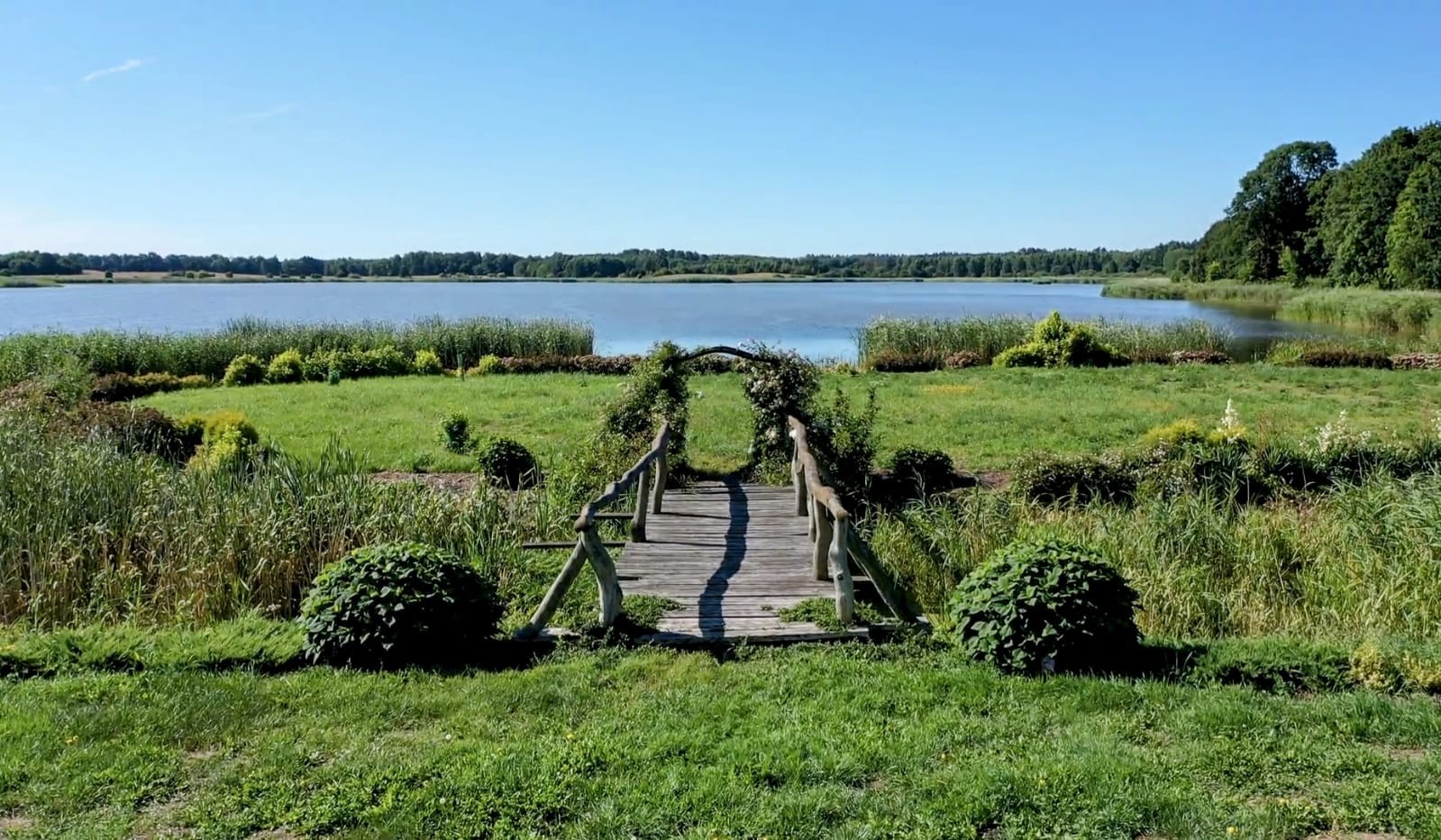 La zone est pavée de pavés en granit, de pierres de champ, de planches de bois, plantée et entretenue. Deux pavillons au bord du lac. Ils sont couverts de roseaux et disposent d'une installation de cuisine et d'un coin détente aménagé. Le charme des pavillons est souligné par leur emplacement sur une péninsule.