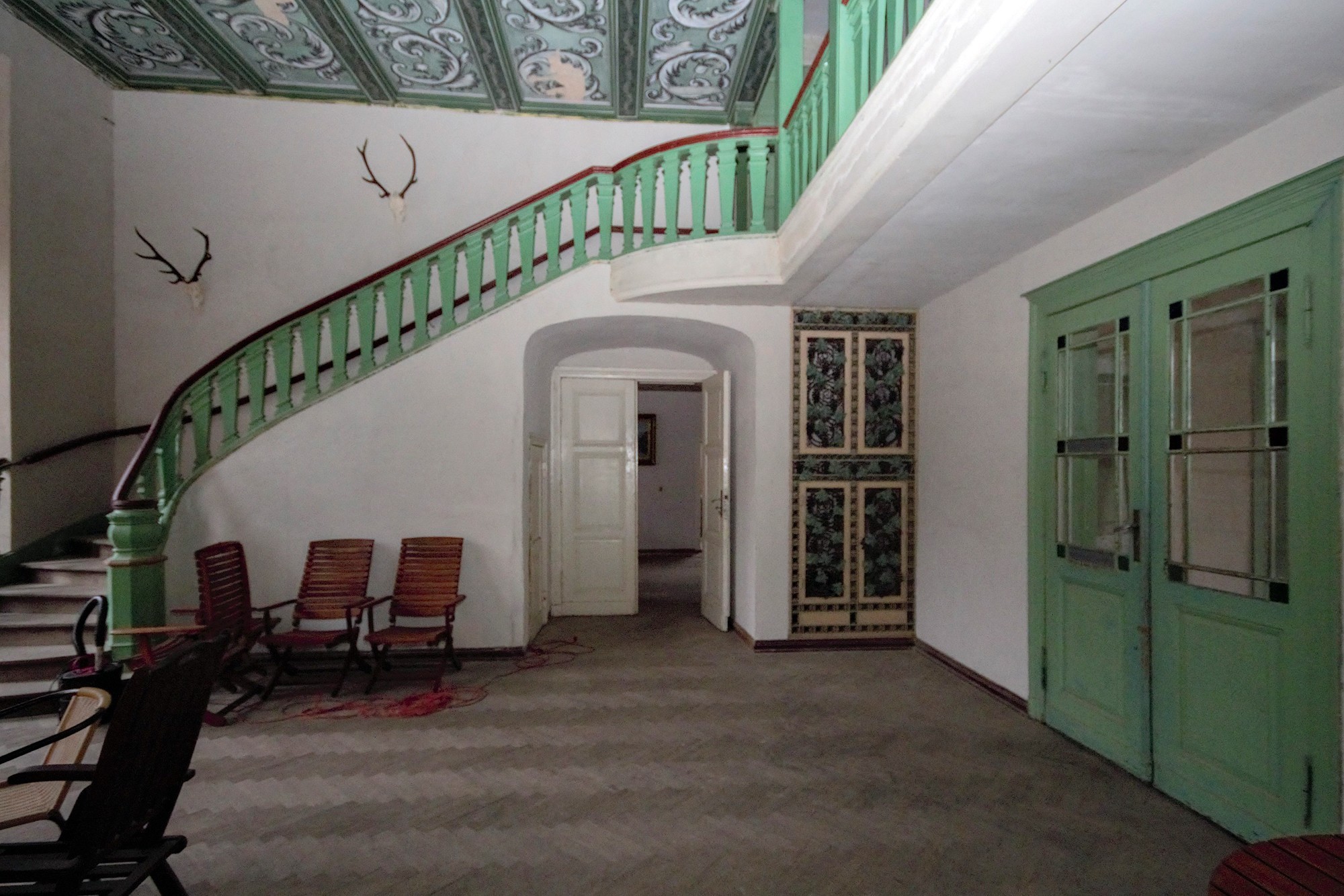 Porte donnant sur la niche sous l'escalier de la galerie - fermée par une grille métallique décorative avec des motifs de rinceaux.