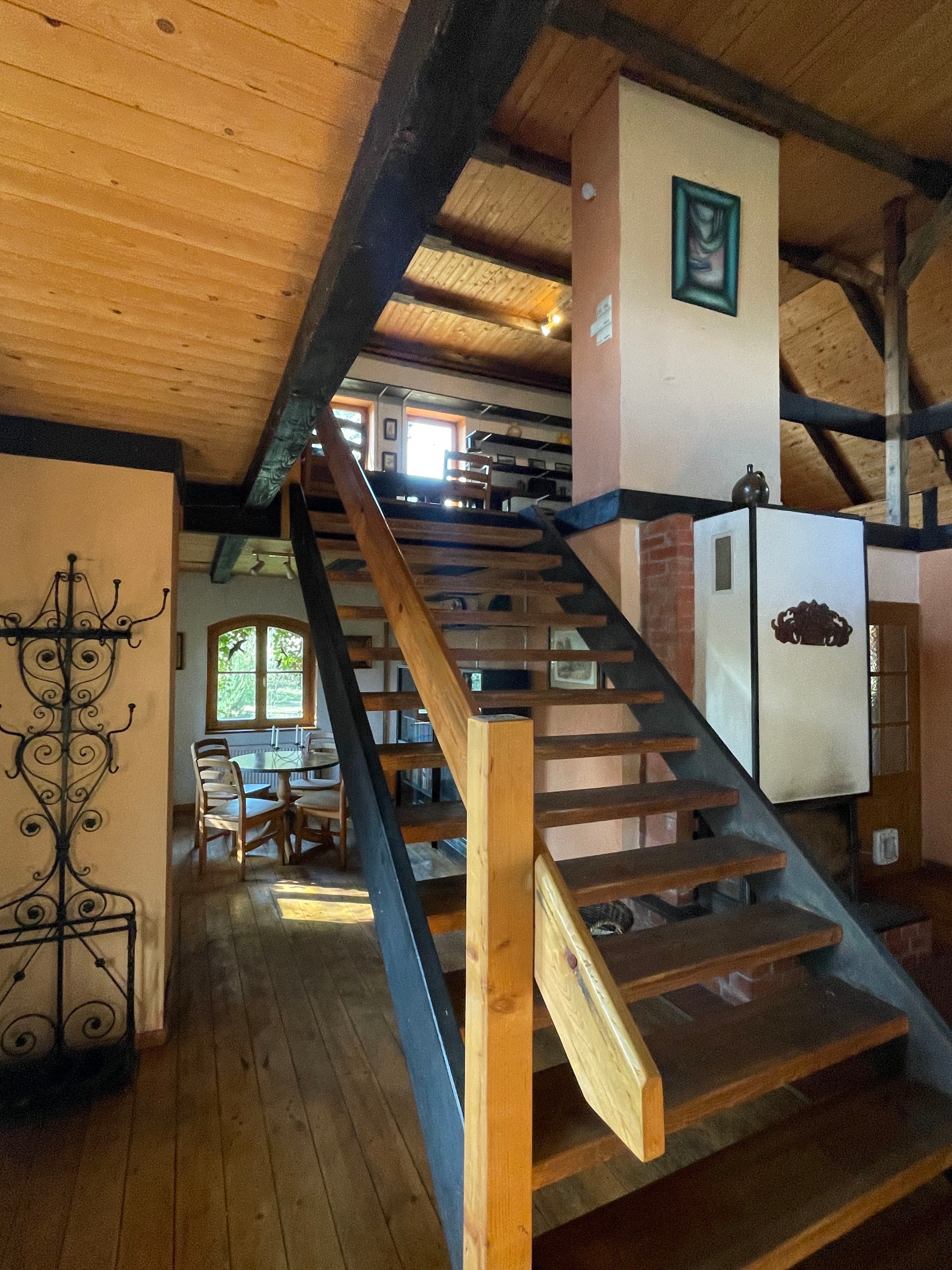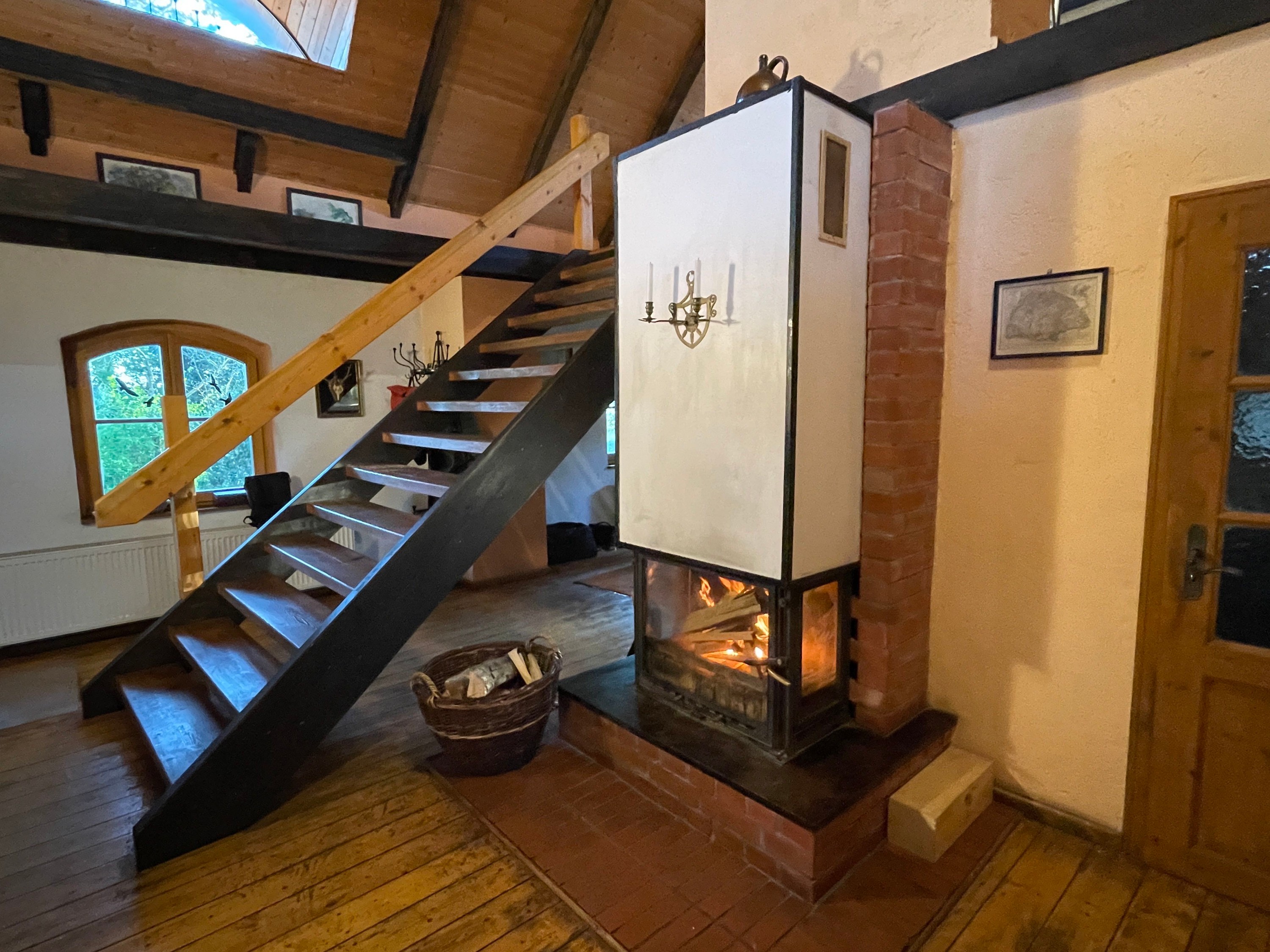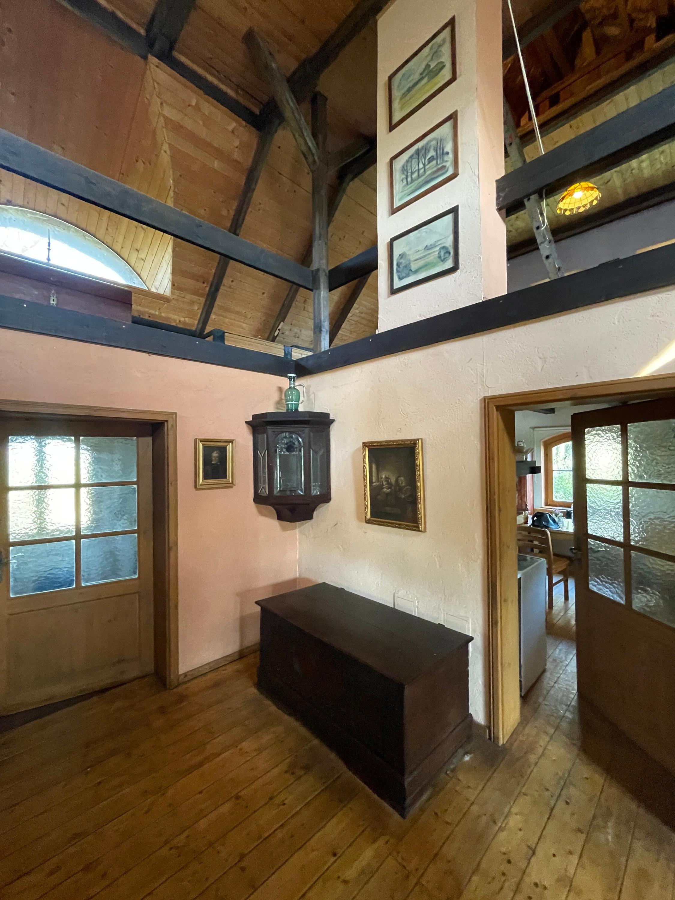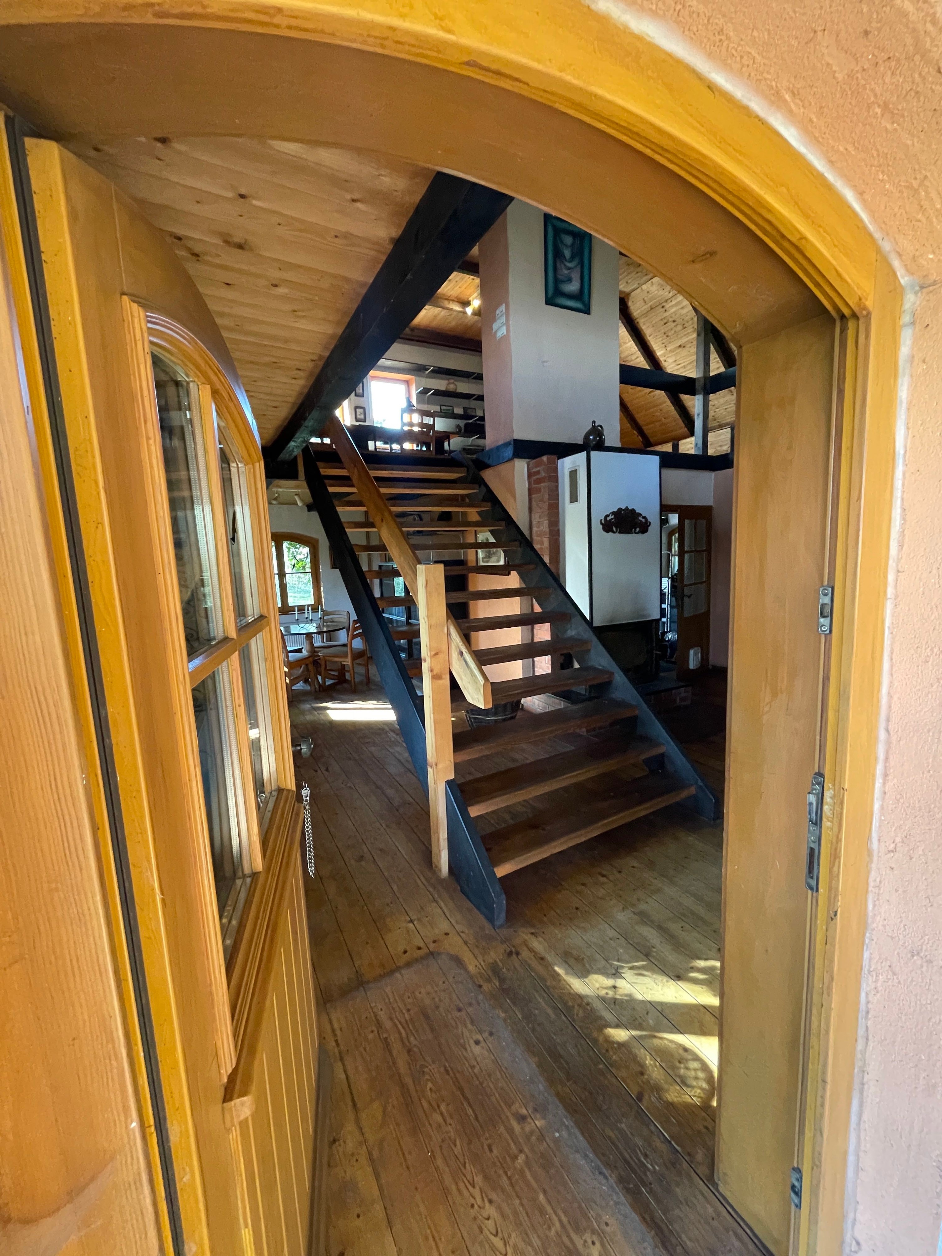 L’entrée principale, située côté terrasse, mène au hall d’accueil avec cheminée et vue ouverte sur l’étage supérieur, accessible par un large escalier indépendant en bois. À gauche de l’escalier se trouve le séjour confortable avec vue sur le jardin. Depuis le hall, on accède également à la cuisine avec espace repas et une pièce supplémentaire indépendante, à la salle de bains spacieuse avec baignoire d’angle et douche, ainsi qu’à l’atelier avec accès à la cave.
