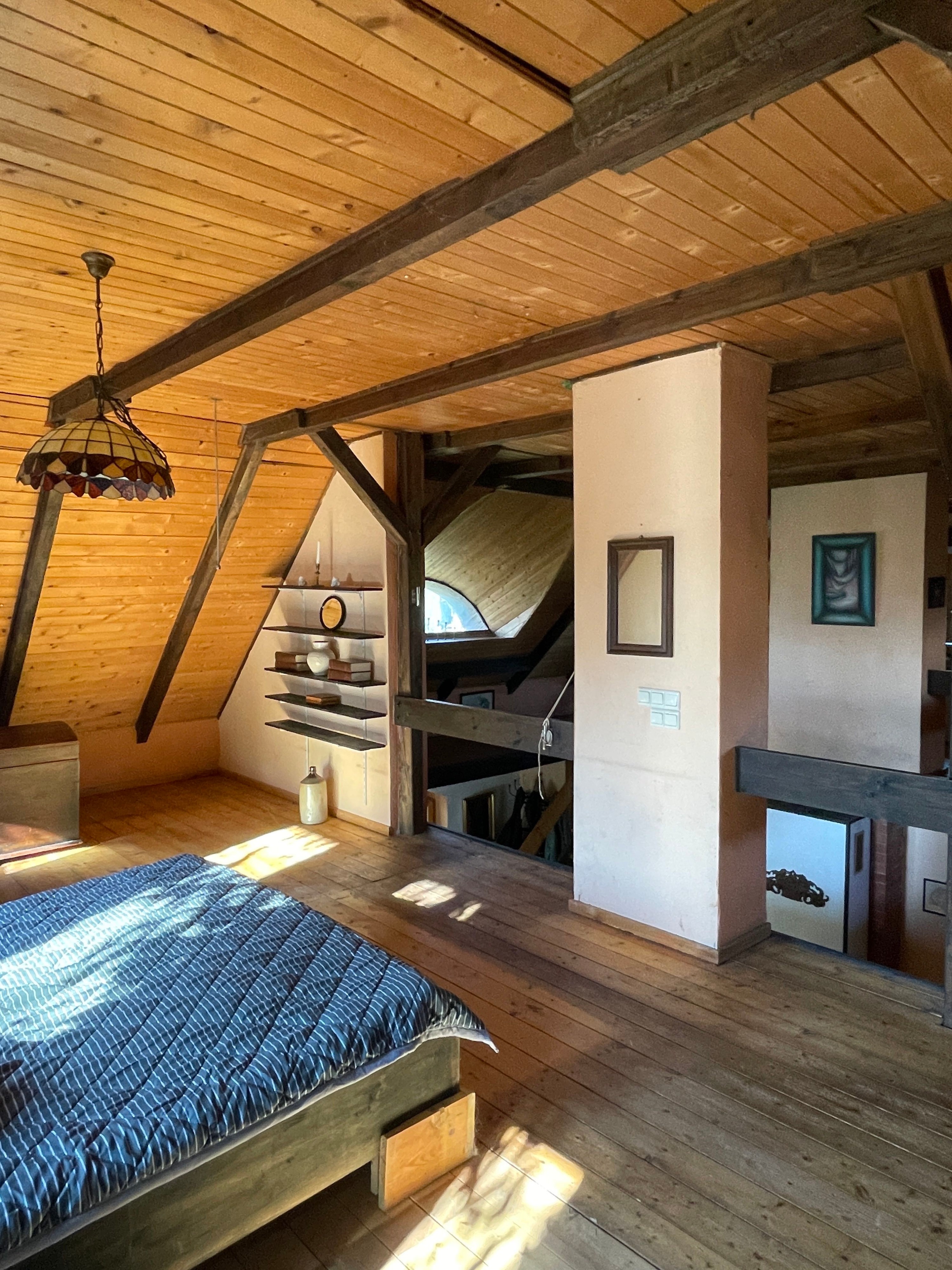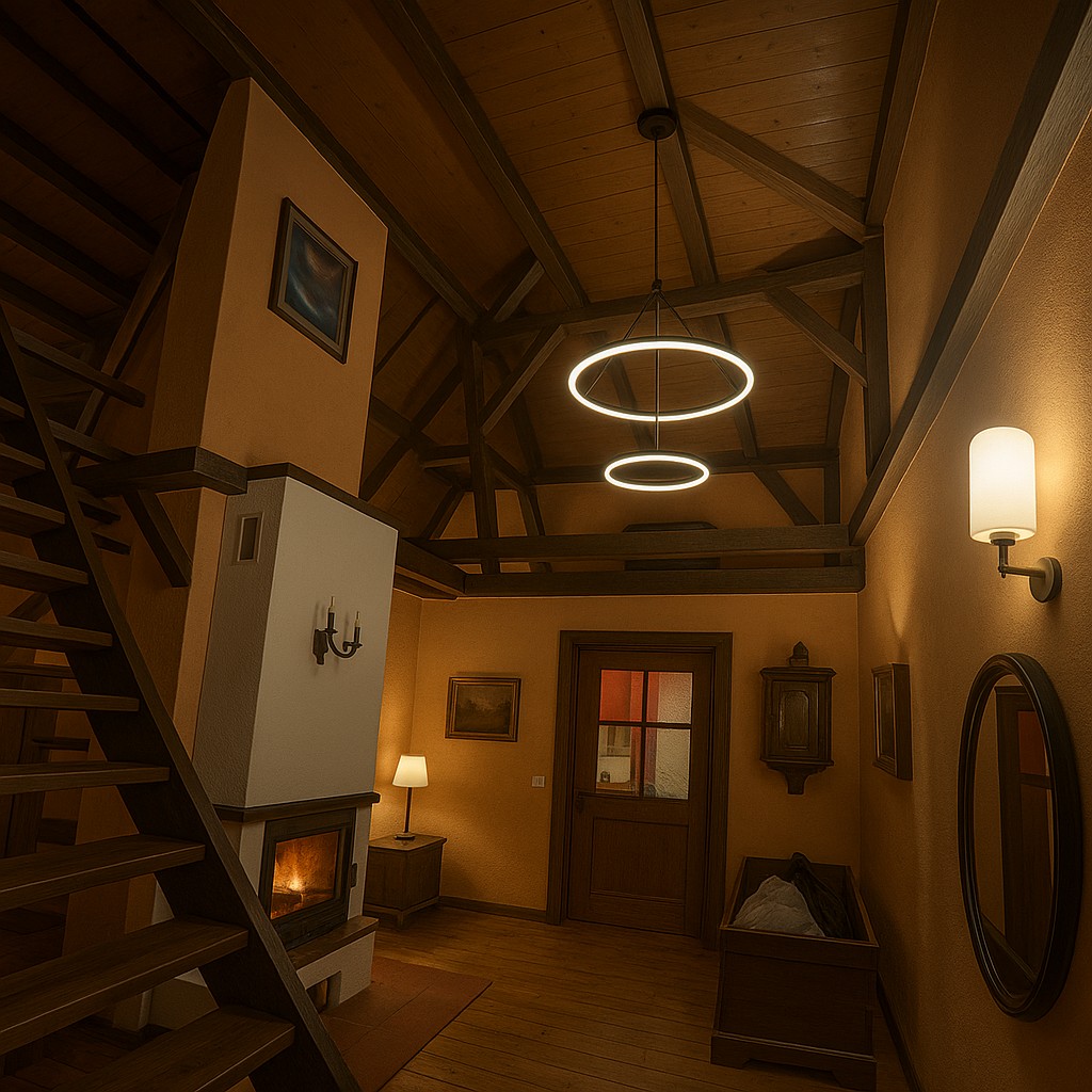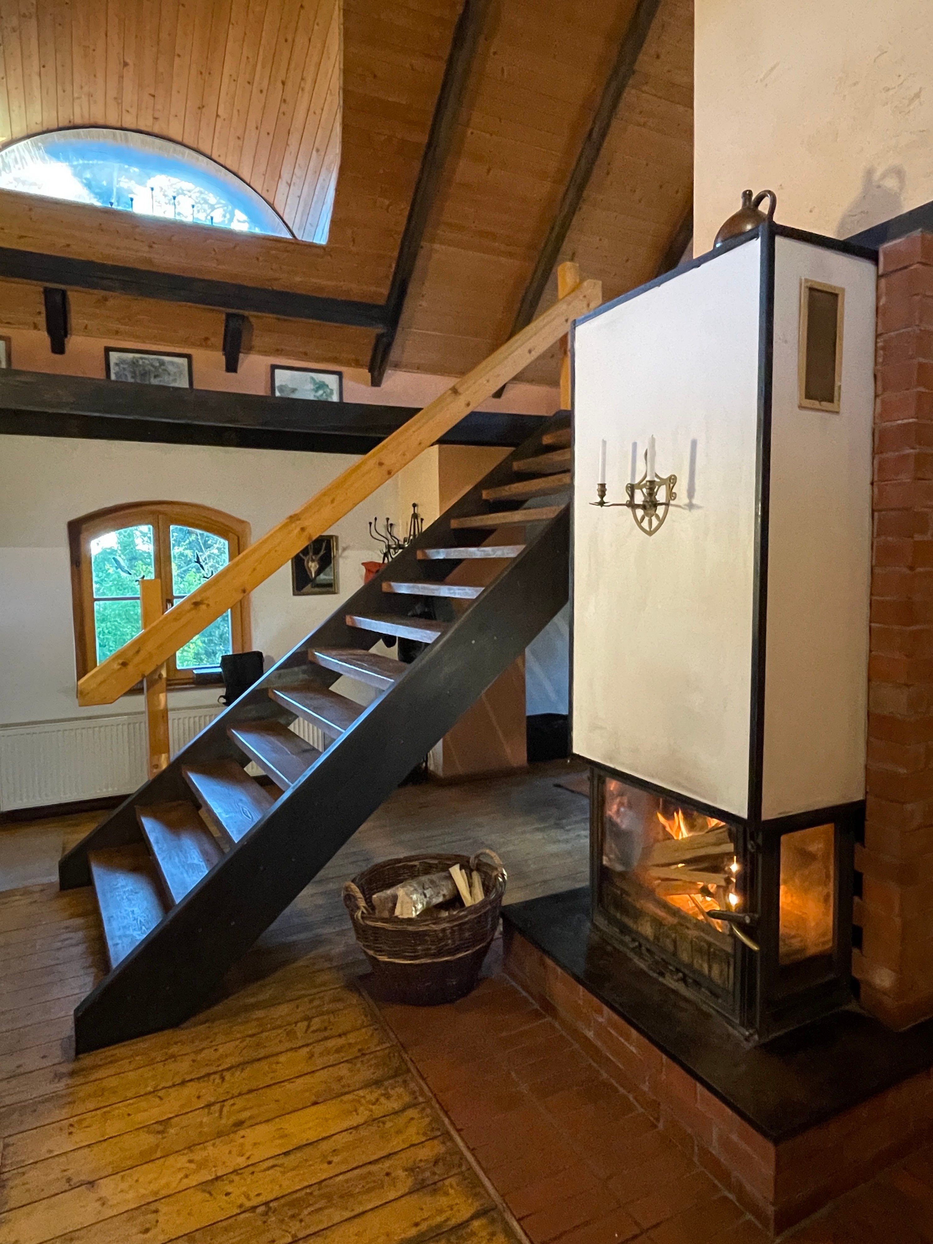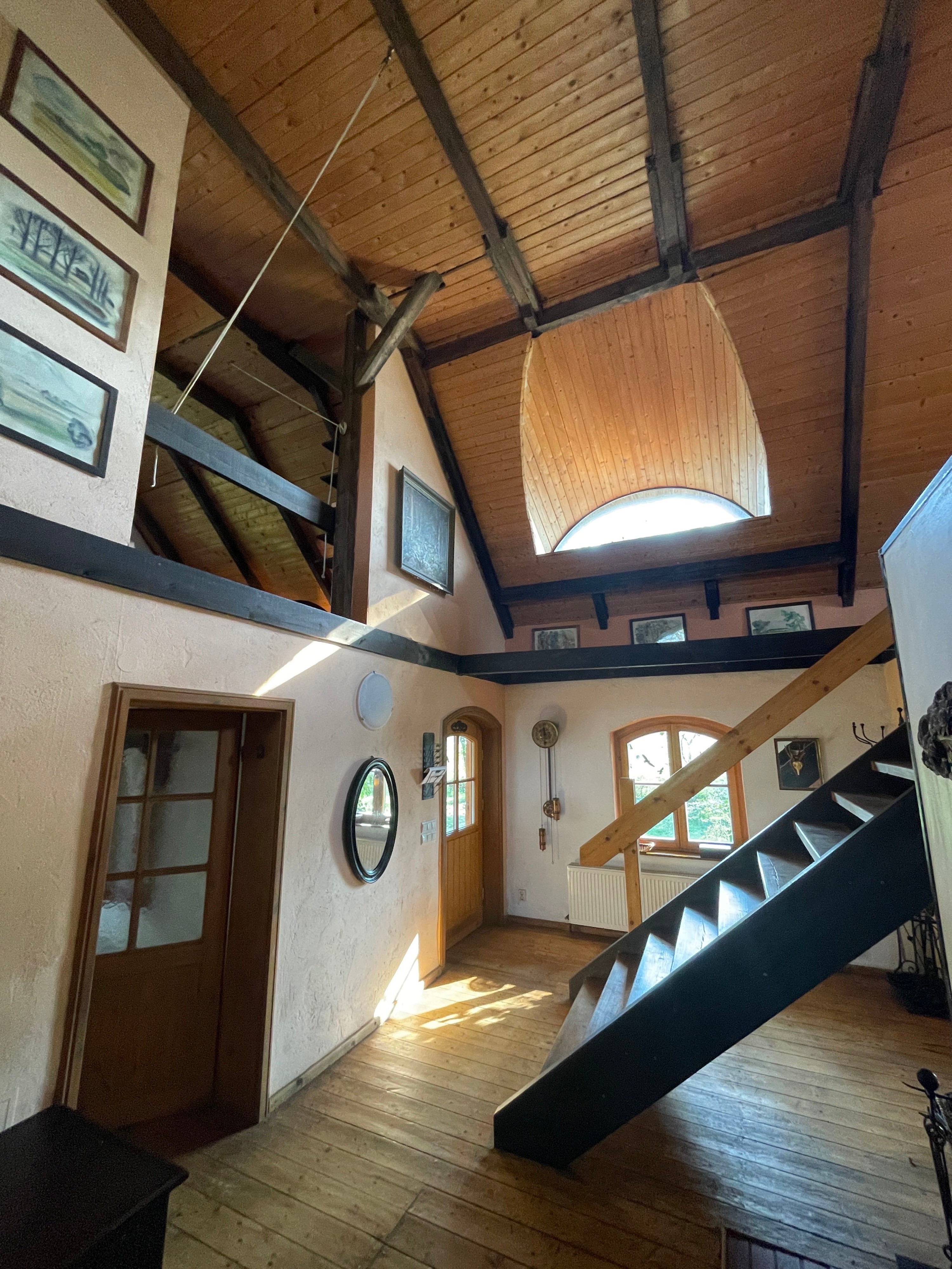 L’entrée principale, située côté terrasse, mène au hall d’accueil avec cheminée et vue ouverte sur l’étage supérieur, accessible par un large escalier indépendant en bois. À gauche de l’escalier se trouve le séjour confortable avec vue sur le jardin. Depuis le hall, on accède également à la cuisine avec espace repas et une pièce supplémentaire indépendante, à la salle de bains spacieuse avec baignoire d’angle et douche, ainsi qu’à l’atelier avec accès à la cave.