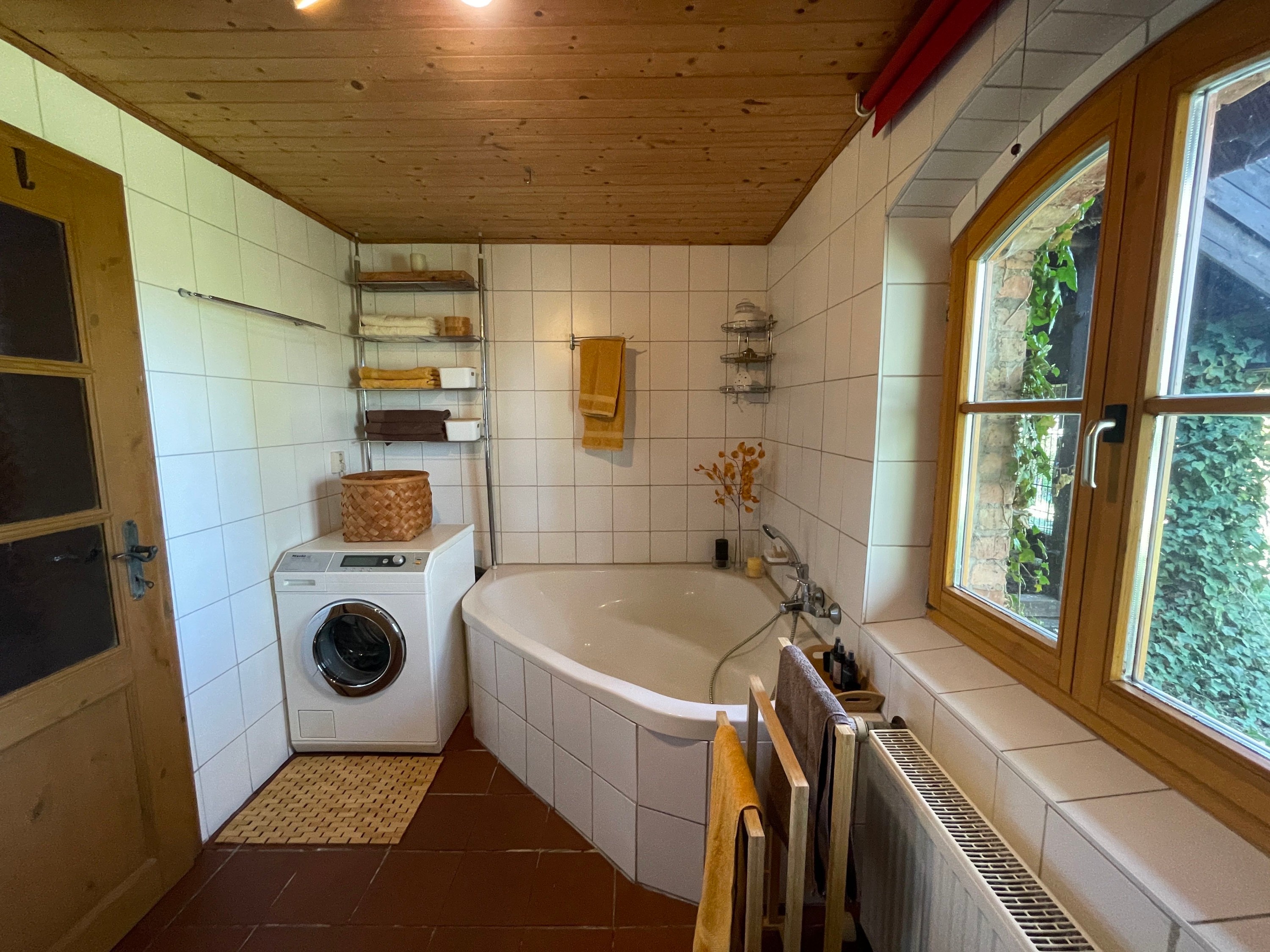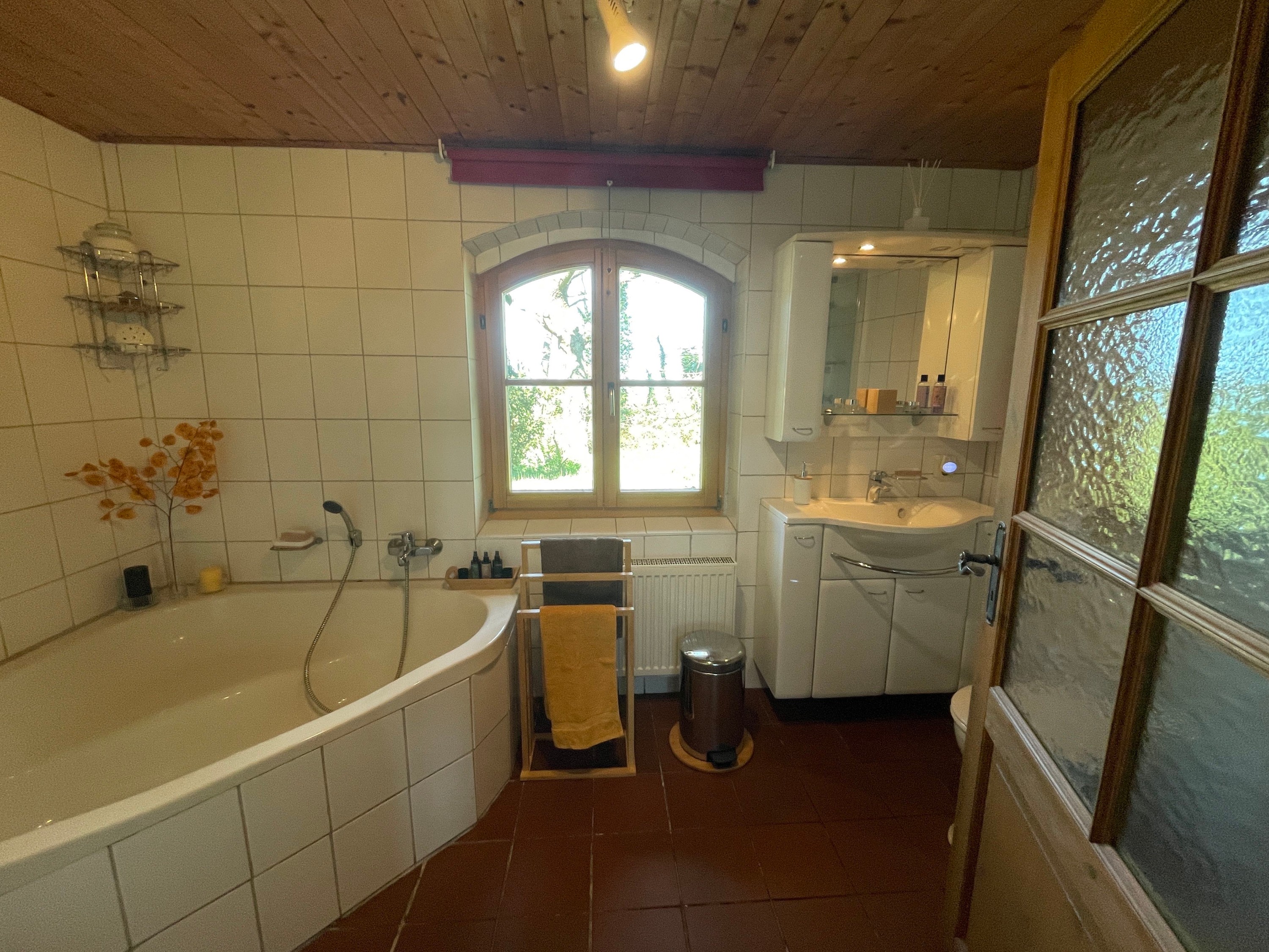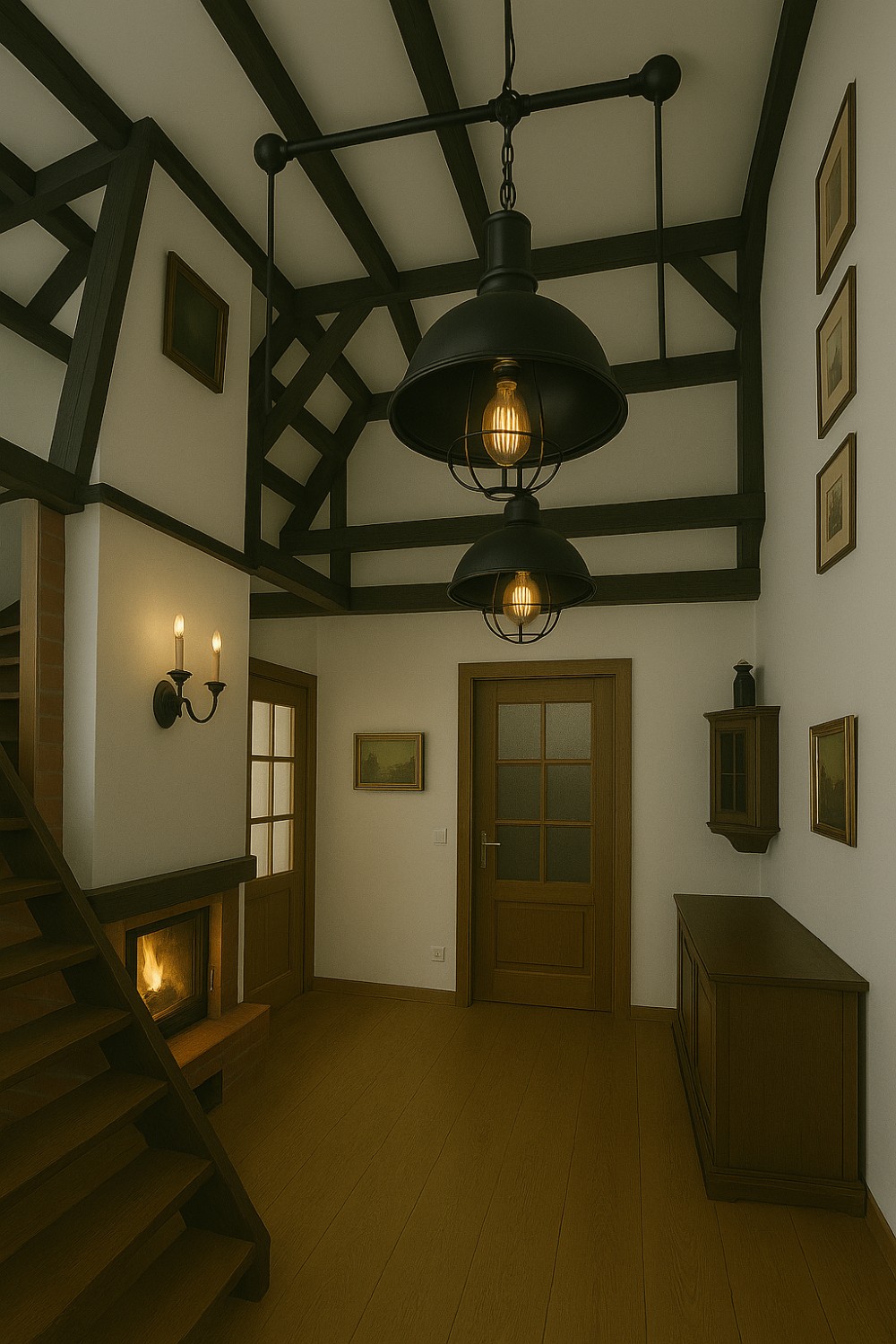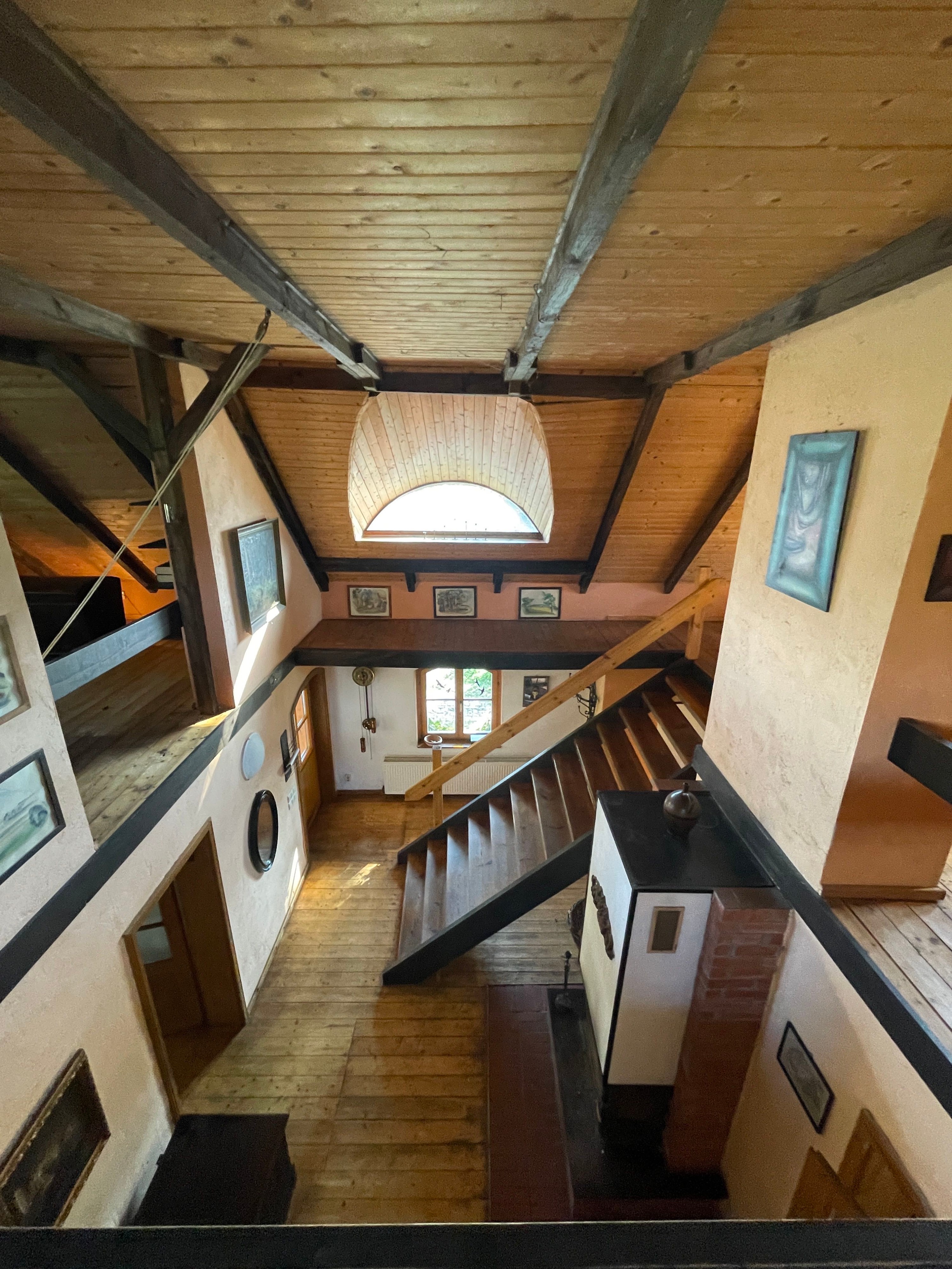 L’entrée principale, située côté terrasse, mène au hall d’accueil avec cheminée et vue ouverte sur l’étage supérieur, accessible par un large escalier indépendant en bois. À gauche de l’escalier se trouve le séjour confortable avec vue sur le jardin. Depuis le hall, on accède également à la cuisine avec espace repas et une pièce supplémentaire indépendante, à la salle de bains spacieuse avec baignoire d’angle et douche, ainsi qu’à l’atelier avec accès à la cave.