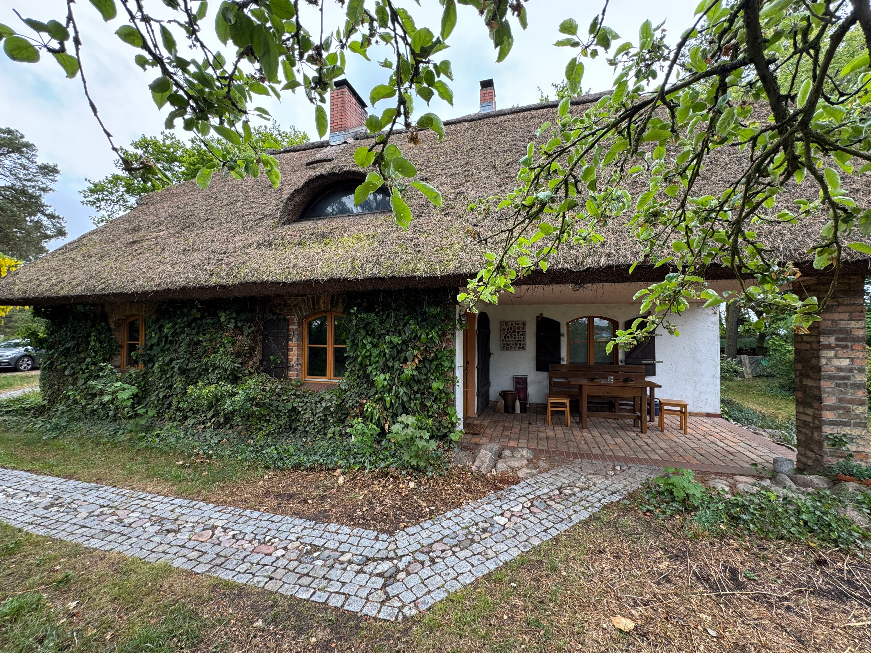 La maçonnerie massive avec ses fenêtres en arc a été réalisée à partir des briques d’origine à haute cuisson. La maison repose sur des fondations en béton entièrement renouvelées avec barrière horizontale contre l’humidité. Une ceinture en béton armé dissimulée assure l’ancrage stable de la charpente du nouveau toit à chevrons. La couverture en chaume a été réalisée selon la technique traditionnelle propre à la Poméranie occidentale, cousue à la main et particulièrement résistante.