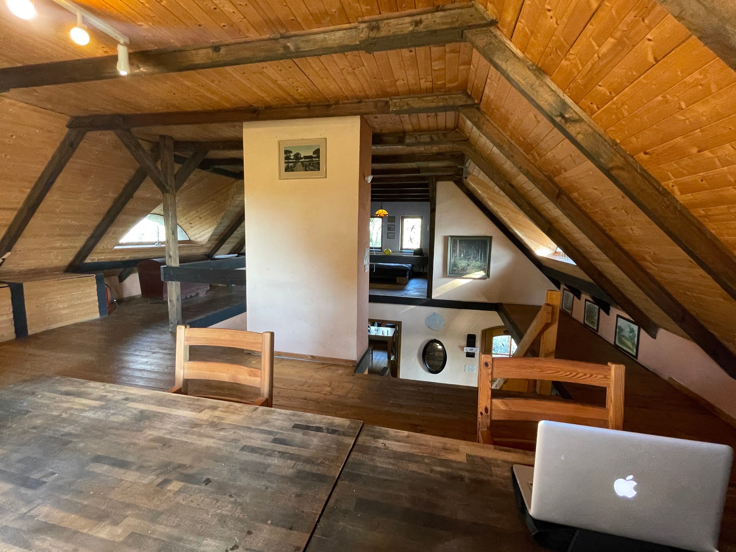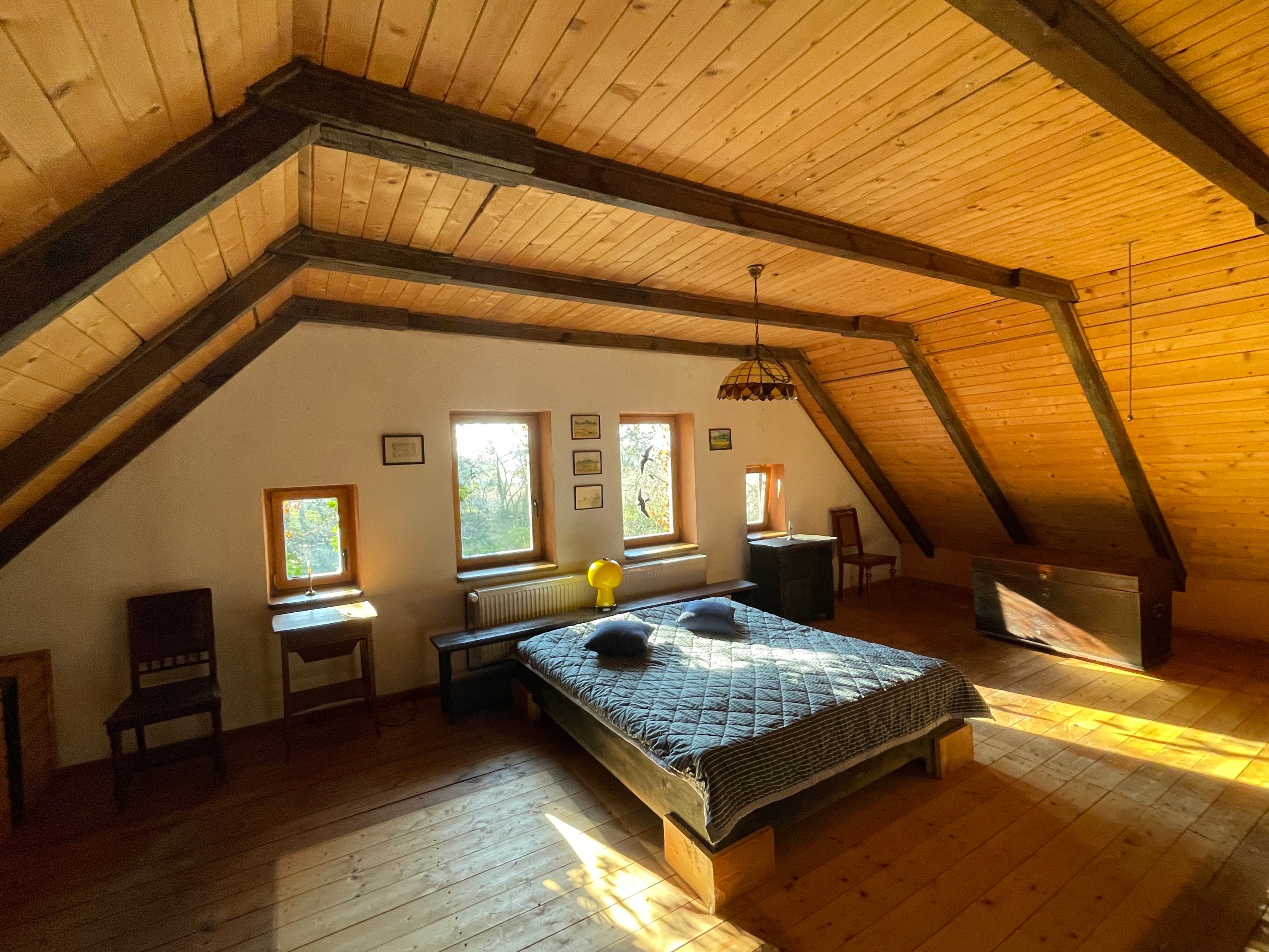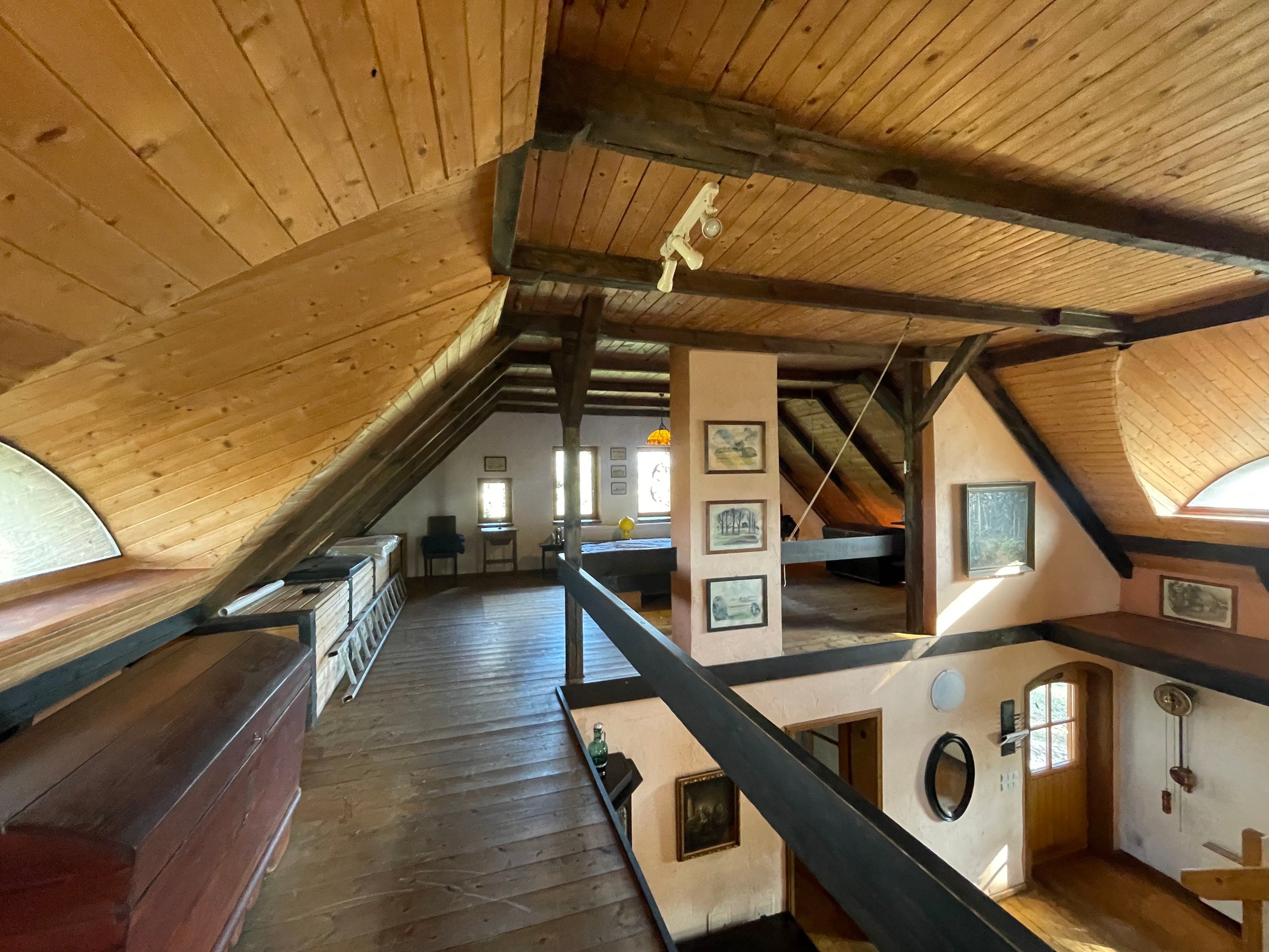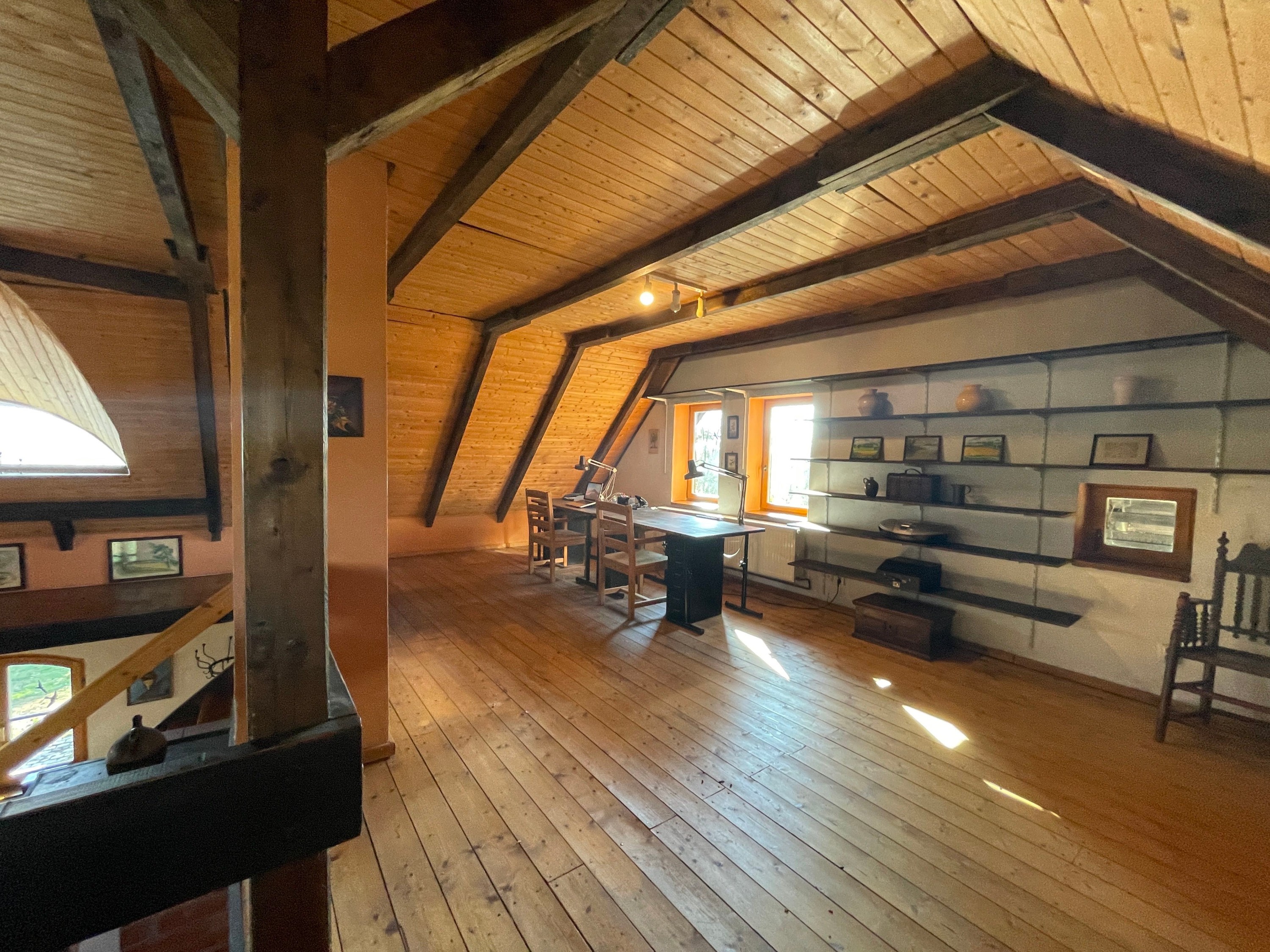 L’étage supérieur se compose d’un vaste espace ouvert sous les combles, avec deux lucarnes opposées le long de la galerie, ainsi qu’un espace bureau et un espace nuit situés dans les pignons.