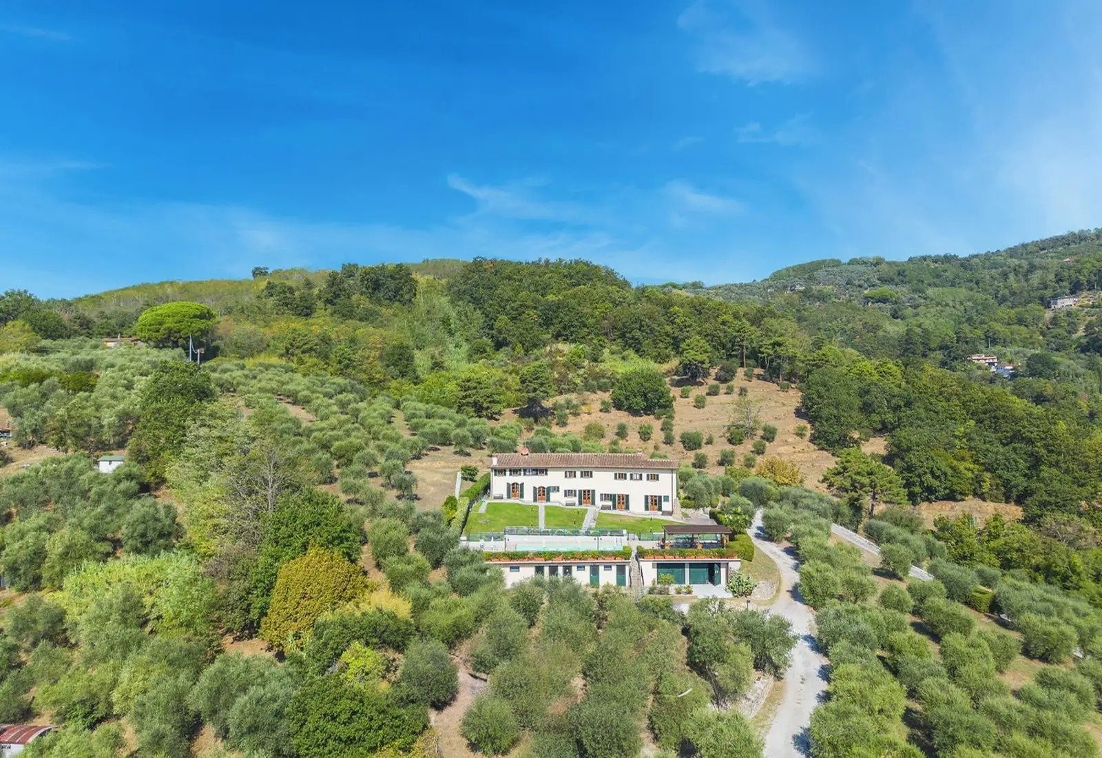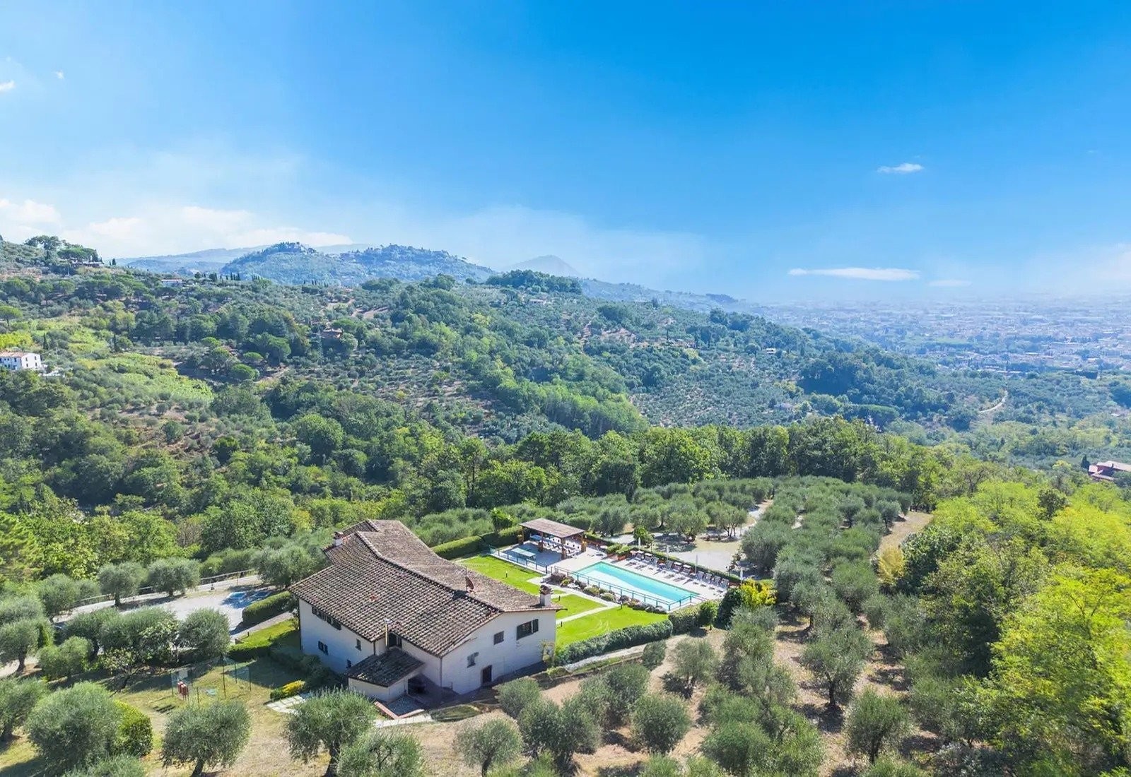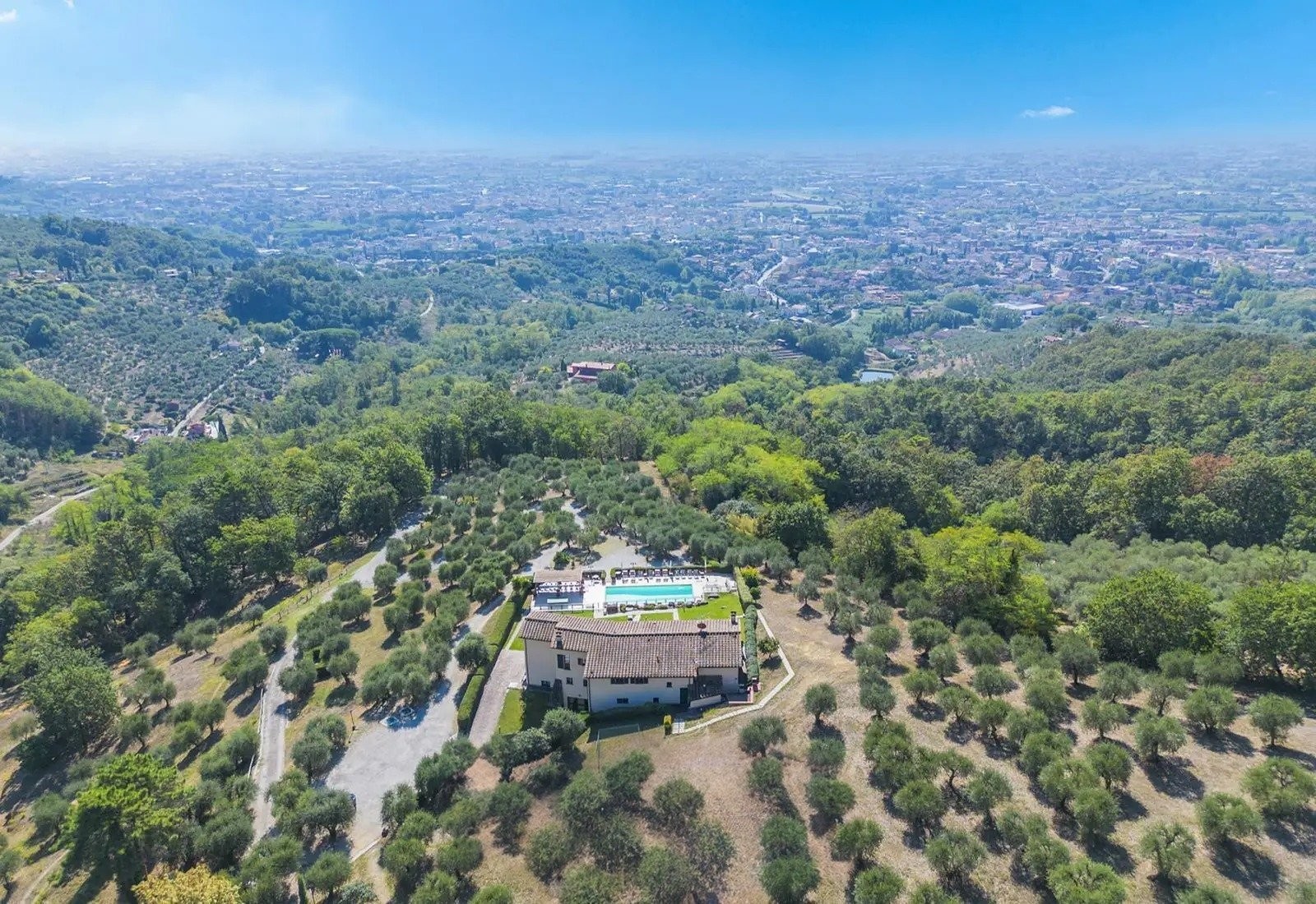 La Villa Marsetti occupe une position élevée sur la crête surplombant Montecatini Terme et s’étend sur dix hectares de terrain privé comprenant des oliveraies avec plus de 500 arbres, des vergers et une forêt de pins bien établie. La propriété combine des infrastructures résidentielles avec un terrain agricole, dans un cadre typique des collines toscanes.