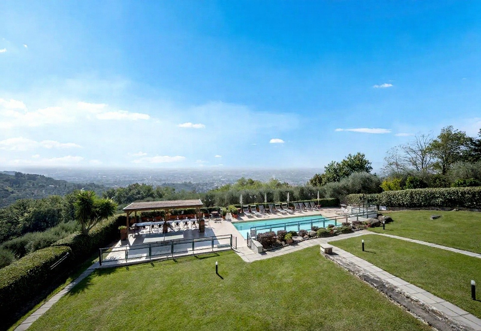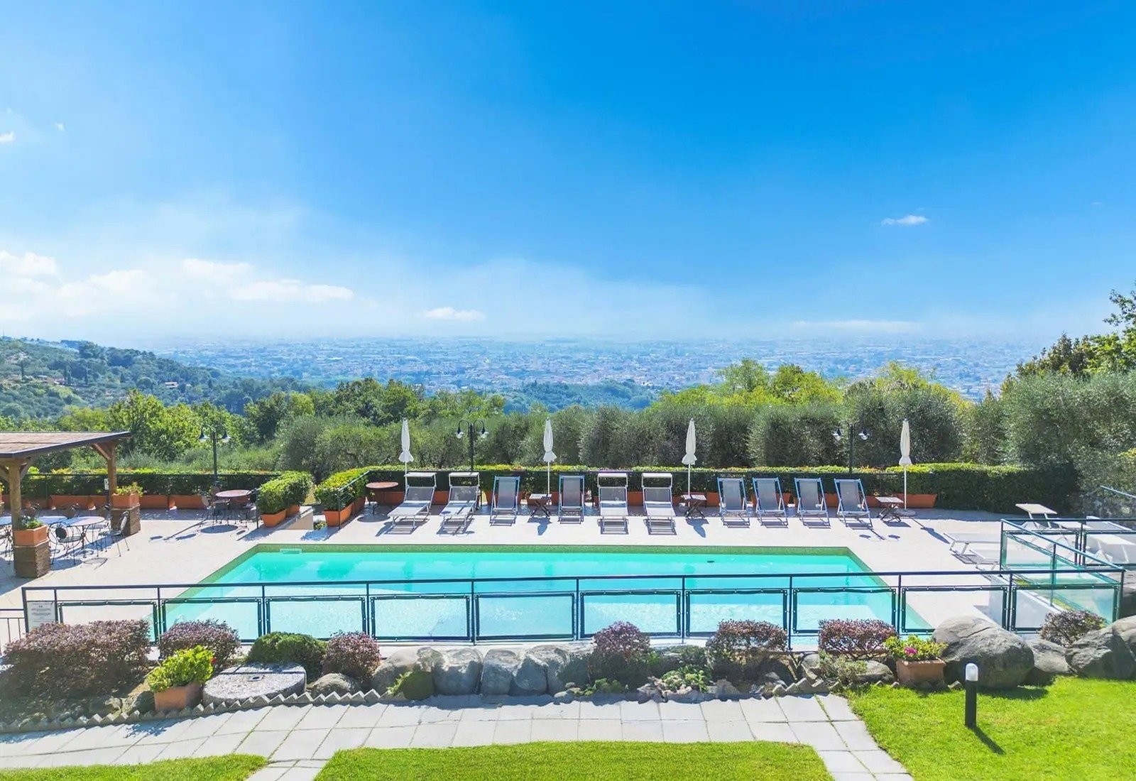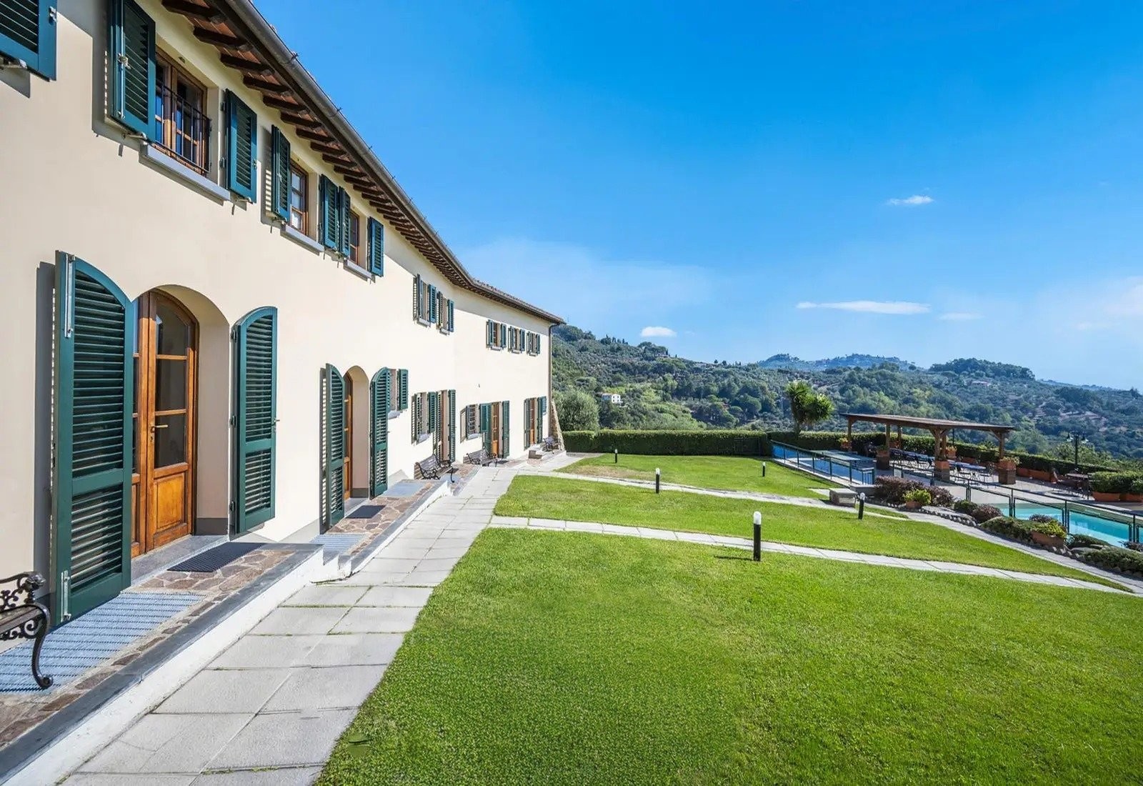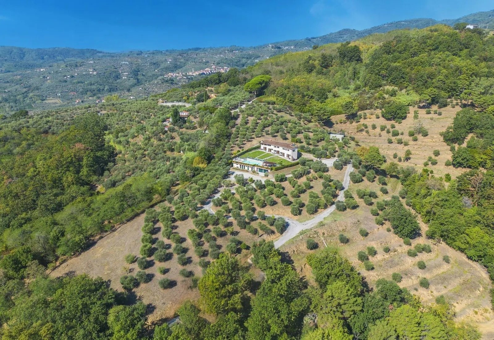 La Villa Marsetti occupe une position élevée sur la crête surplombant Montecatini Terme et s’étend sur dix hectares de terrain privé comprenant des oliveraies avec plus de 500 arbres, des vergers et une forêt de pins bien établie. La propriété combine des infrastructures résidentielles avec un terrain agricole, dans un cadre typique des collines toscanes.