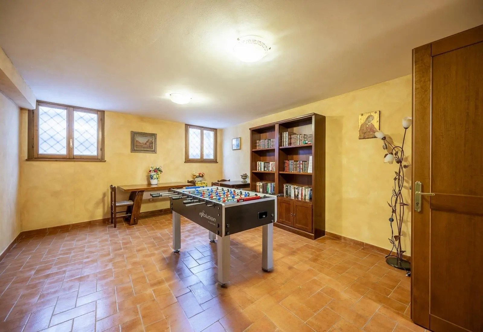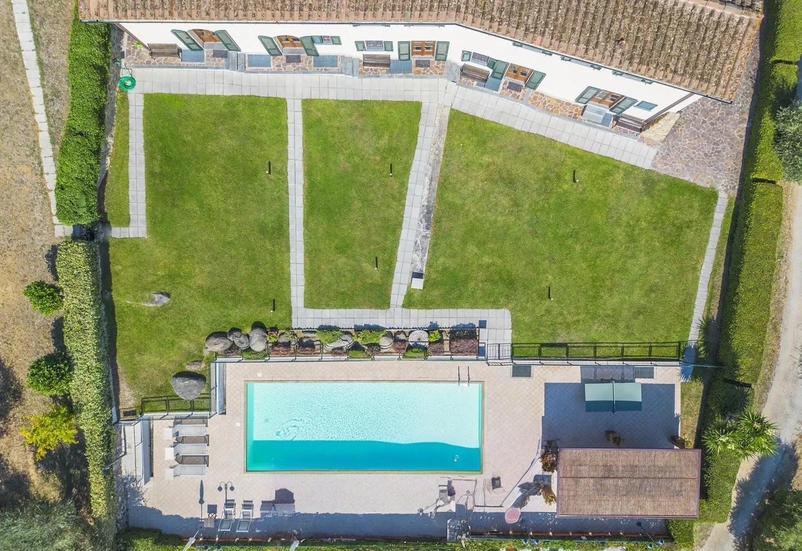 Le terrain conserve un caractère agricole fonctionnel tout en offrant des espaces de loisirs et de sport. Une piscine de cinq mètres cinquante sur douze, avec terrasse-solarium, permet de profiter de la vue sur la vallée et Montecatini Terme. La propriété dispose également de terrains pour le volley-ball, le football, le basket-ball et le badminton, ainsi que d’un pavillon couvert avec barbecue et d’un espace feu de camp. L’ensemble est conçu pour que les infrastructures de loisirs soient indépendantes des espaces résidentiels, tout en bénéficiant d’une ventilation naturelle et de vues sur la vallée grâce à l’élévation et l’orientation du terrain.