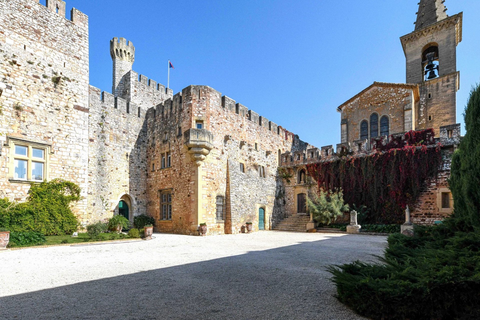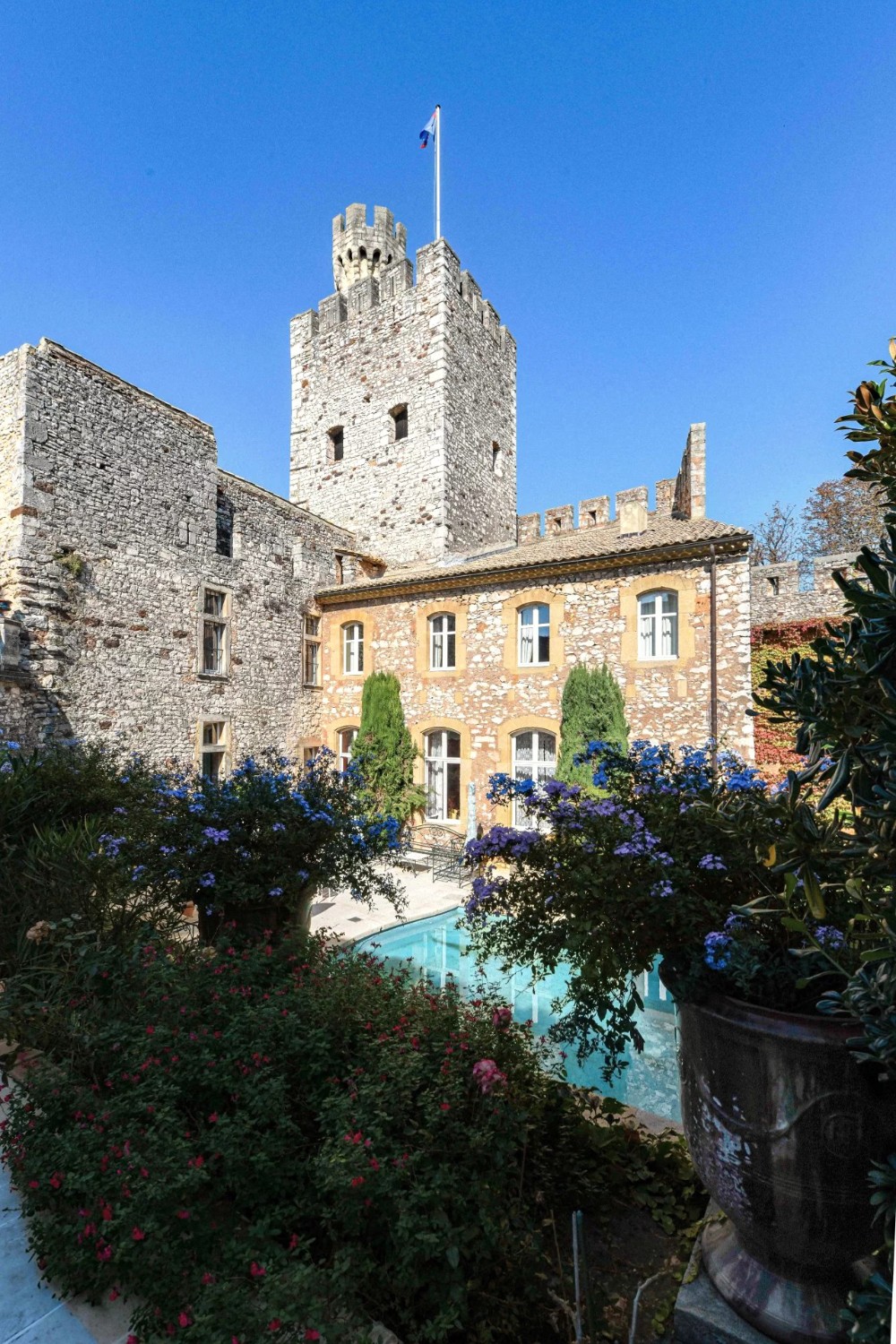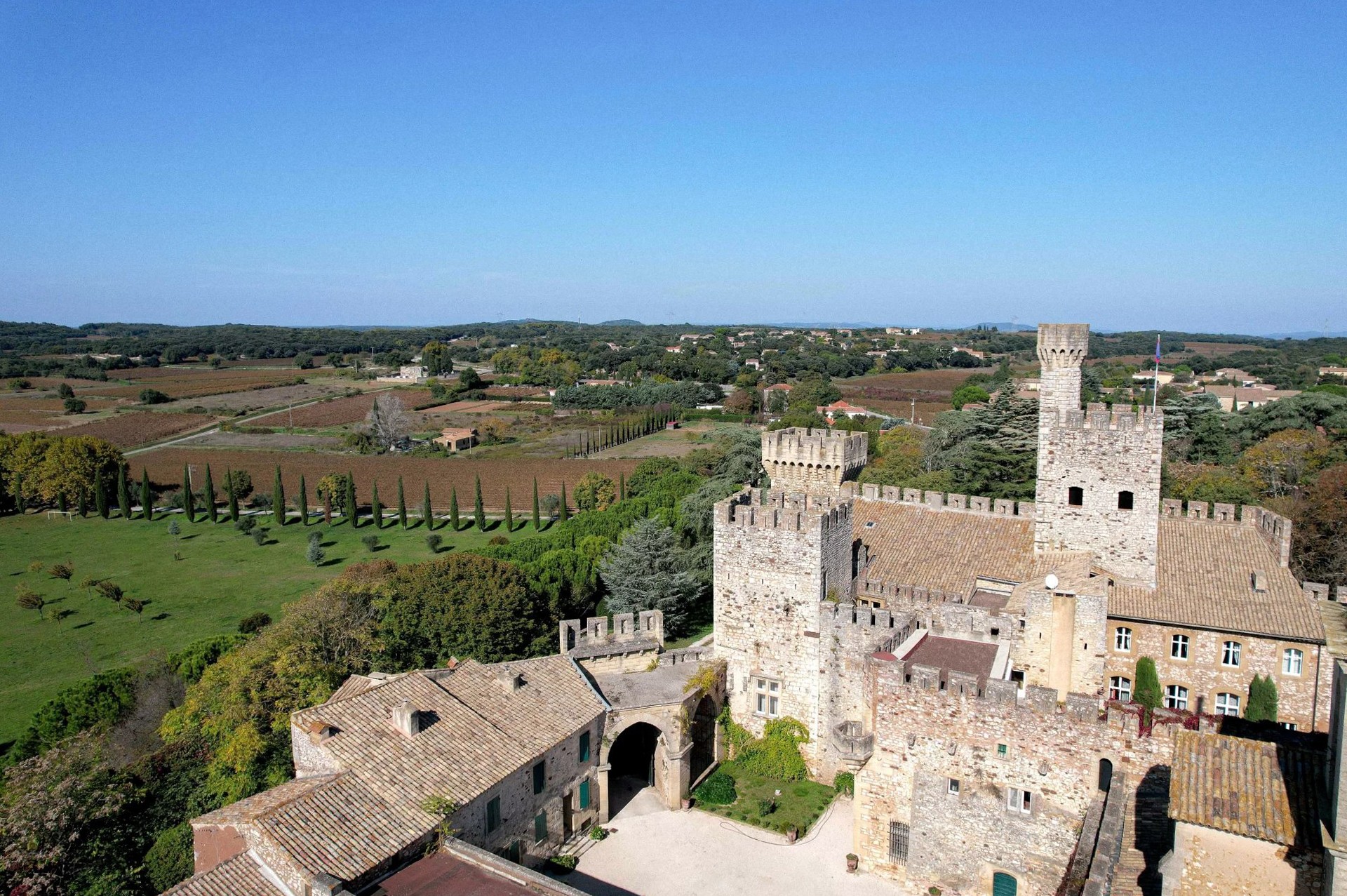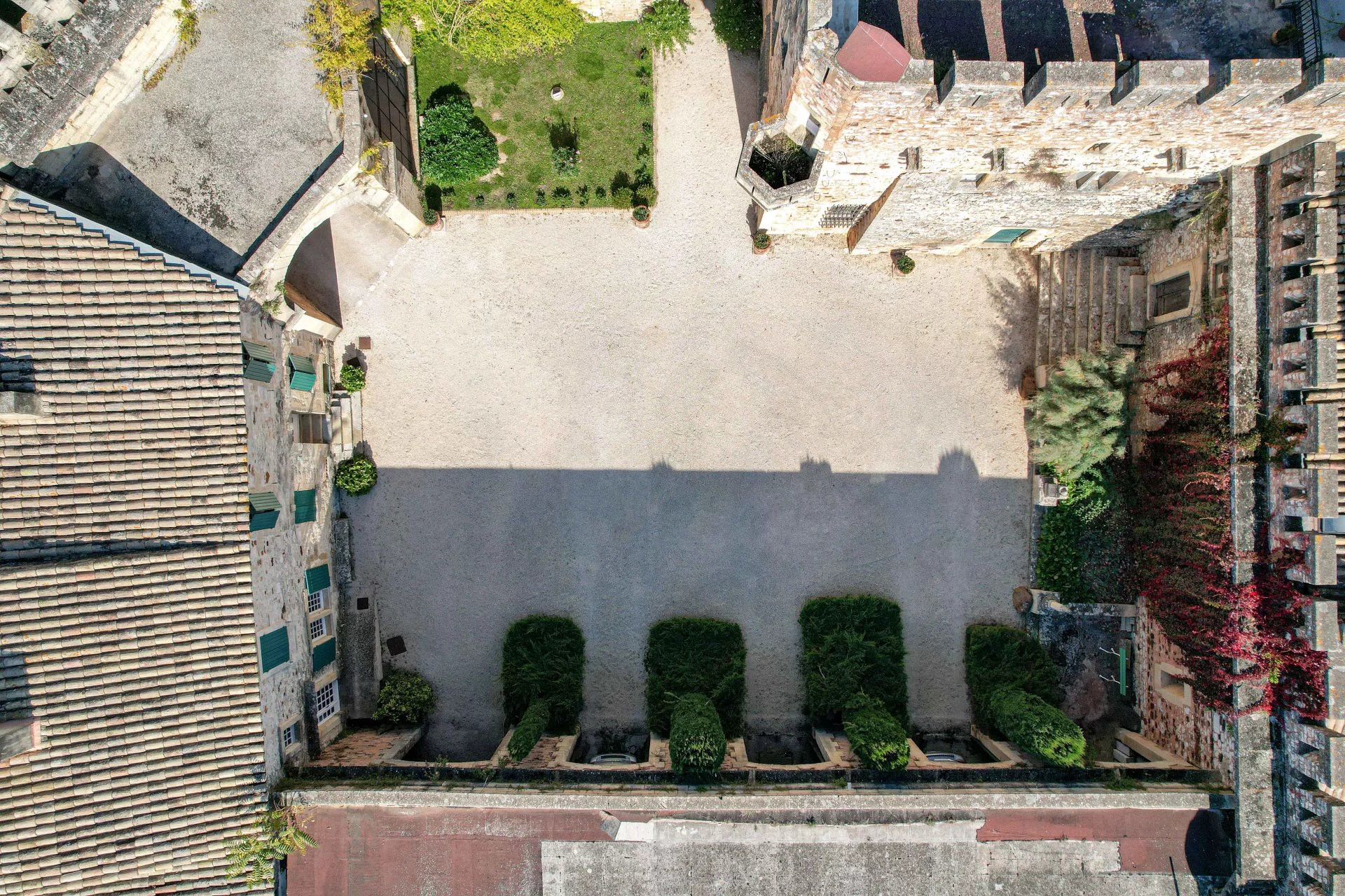 Cette demeure possède également son donjon, ses tours carrées, ses échauguettes, son chemin de ronde et de grandes terrasses depuis lesquelles l’on domine une vue unique sur la campagne environnante aux accents toscans.