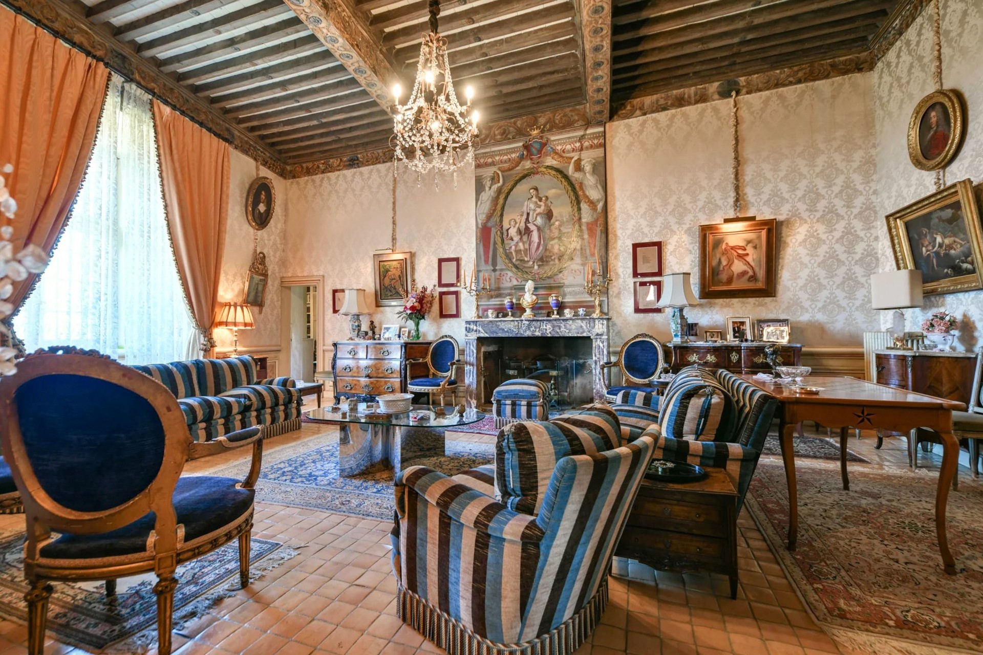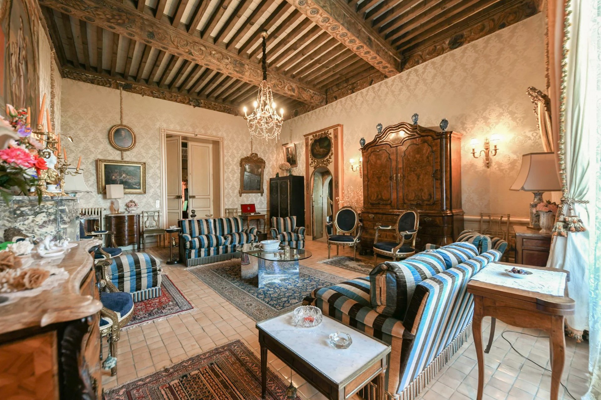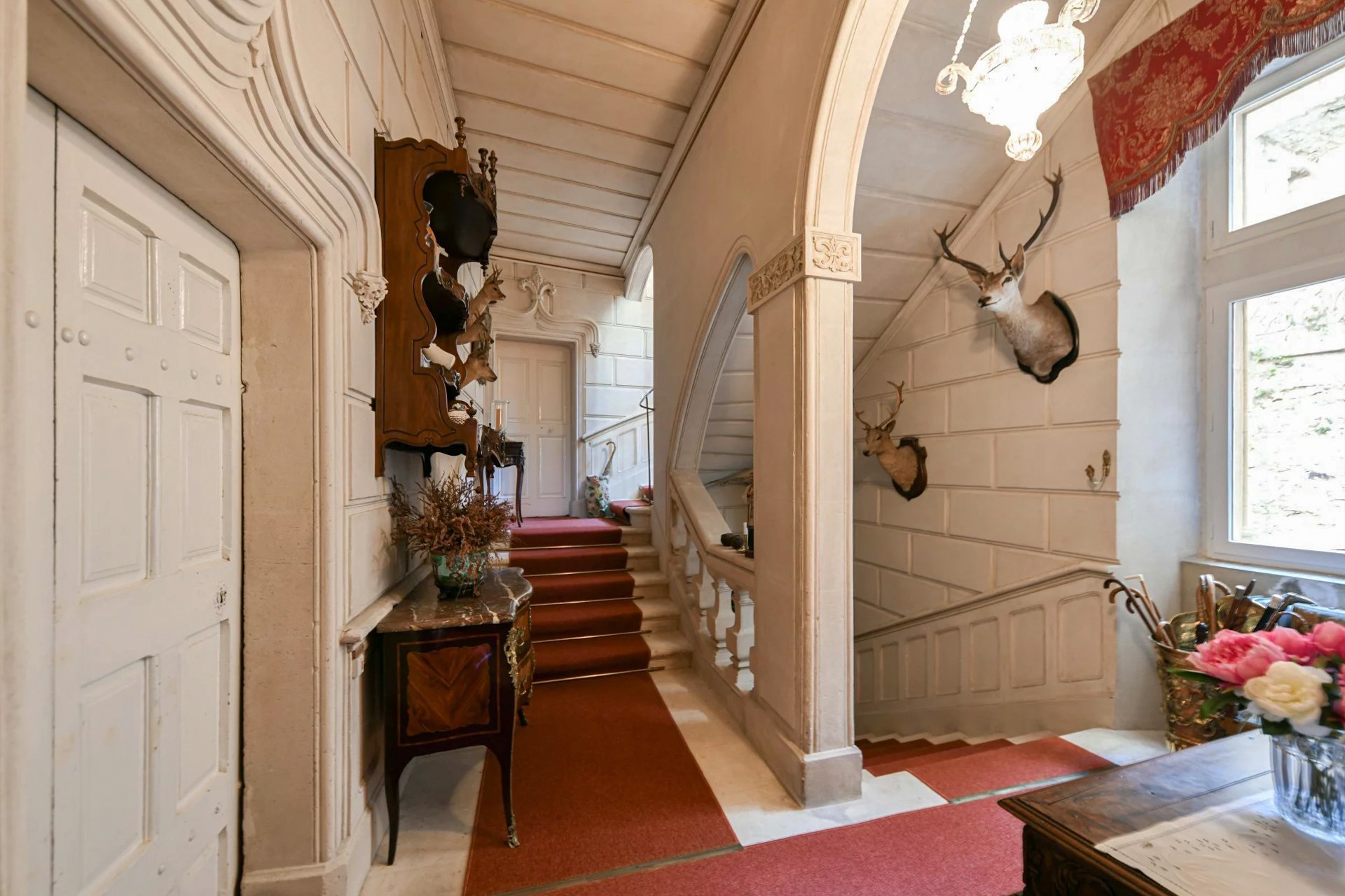 Deux entrées vous accueillent dans un vaste et somptueux salon voûté qui offre un plafond du XVIIᵉ siècle. Un bel escalier d’honneur mène à l’étage où se trouvent deux salons, une élégante salle à manger avec cheminée et une bibliothèque. Un vaste couloir dessert un bureau, la cuisine ainsi qu’une superbe suite principale de 100 m².