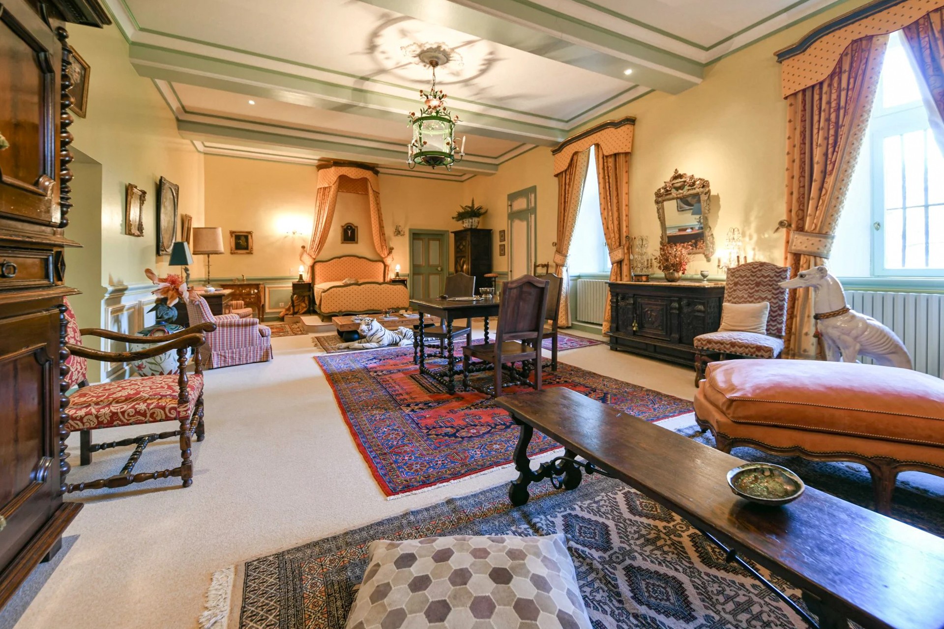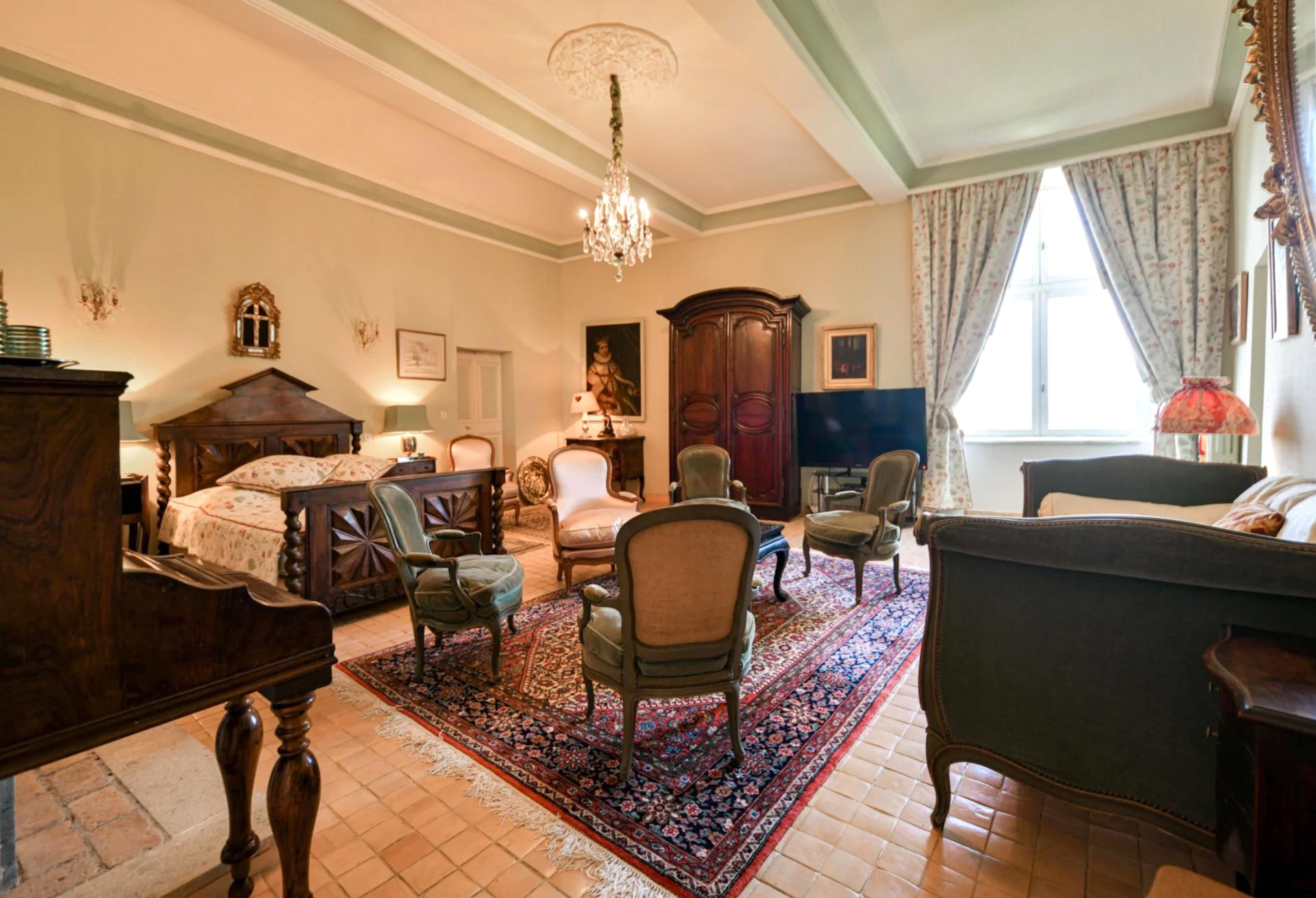 Son imposant porche ouvre sur la cour d’honneur, une chapelle seigneuriale ainsi que trois garages, une magnifique sellerie, une volière et une écurie. Cet espace comprend également une maison de gardien composée de deux salons, une cuisine, trois chambres et une salle de bain ainsi qu’un studio d’invités.